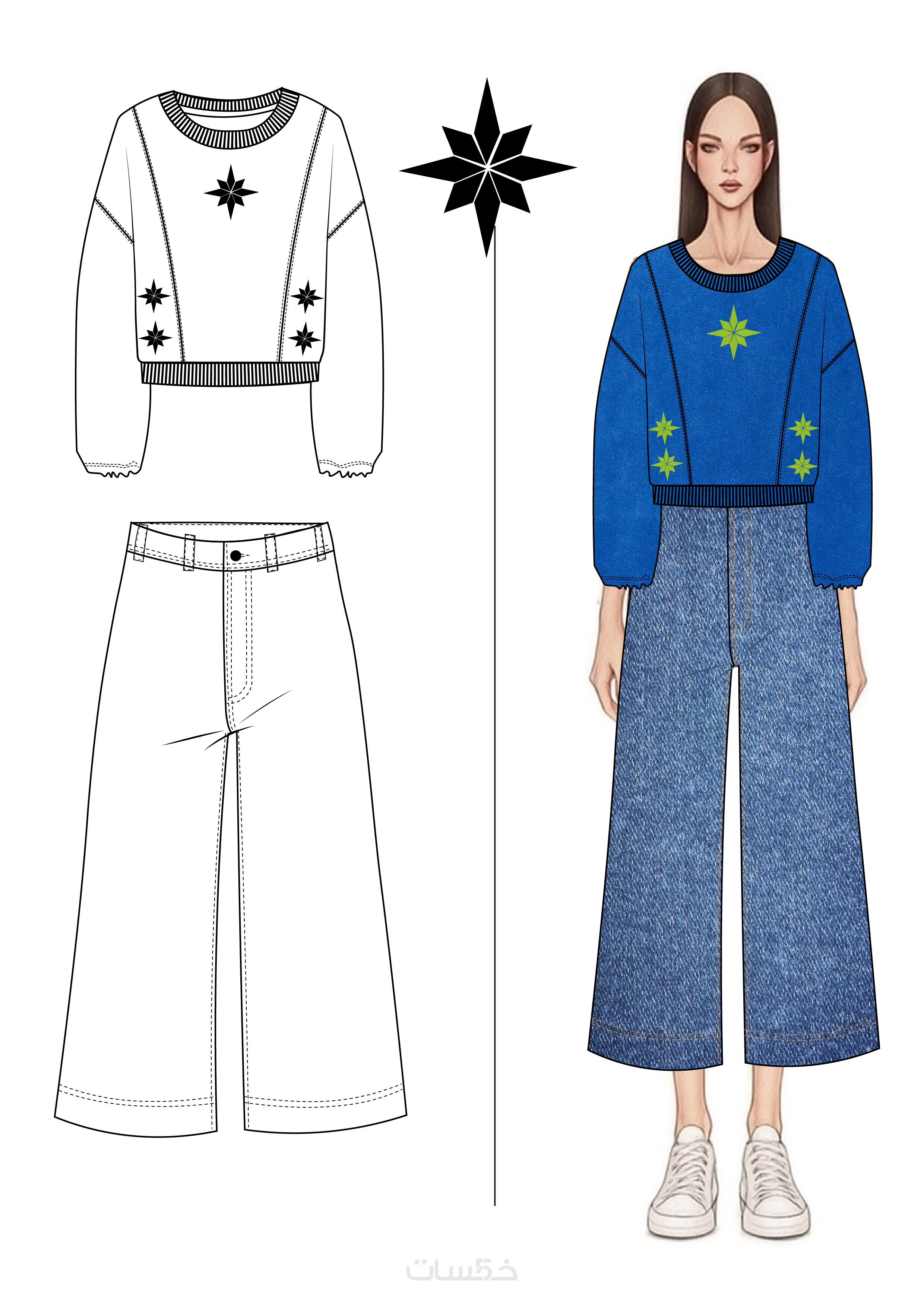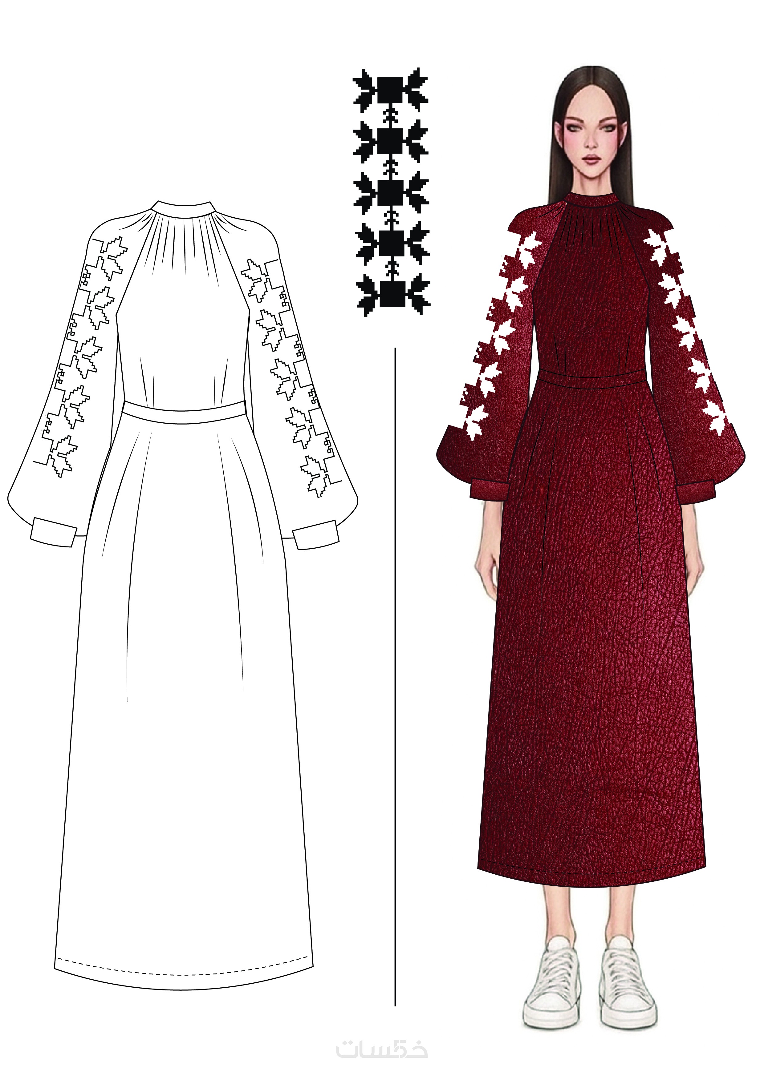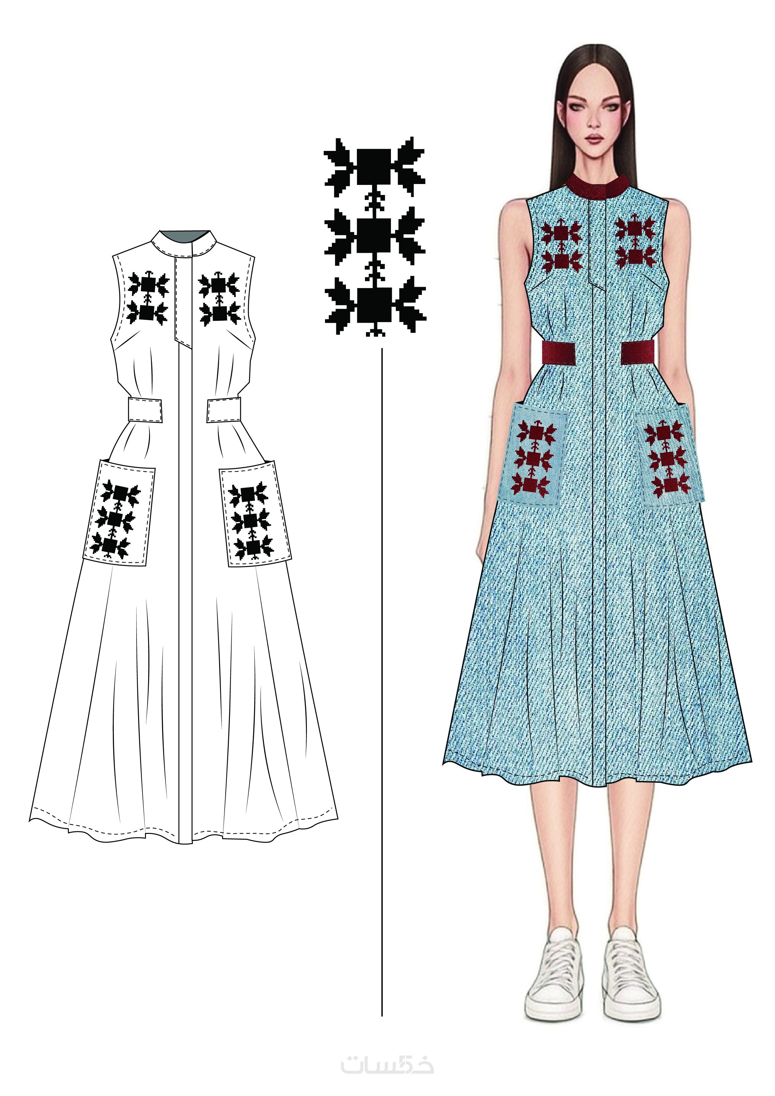 قة التنفيذ التقني: رسم السكيتشات بنسب واقعية (Proportions) تضمن سهولة فهم التصميم من قِبل الباترونيست أو المصنع.