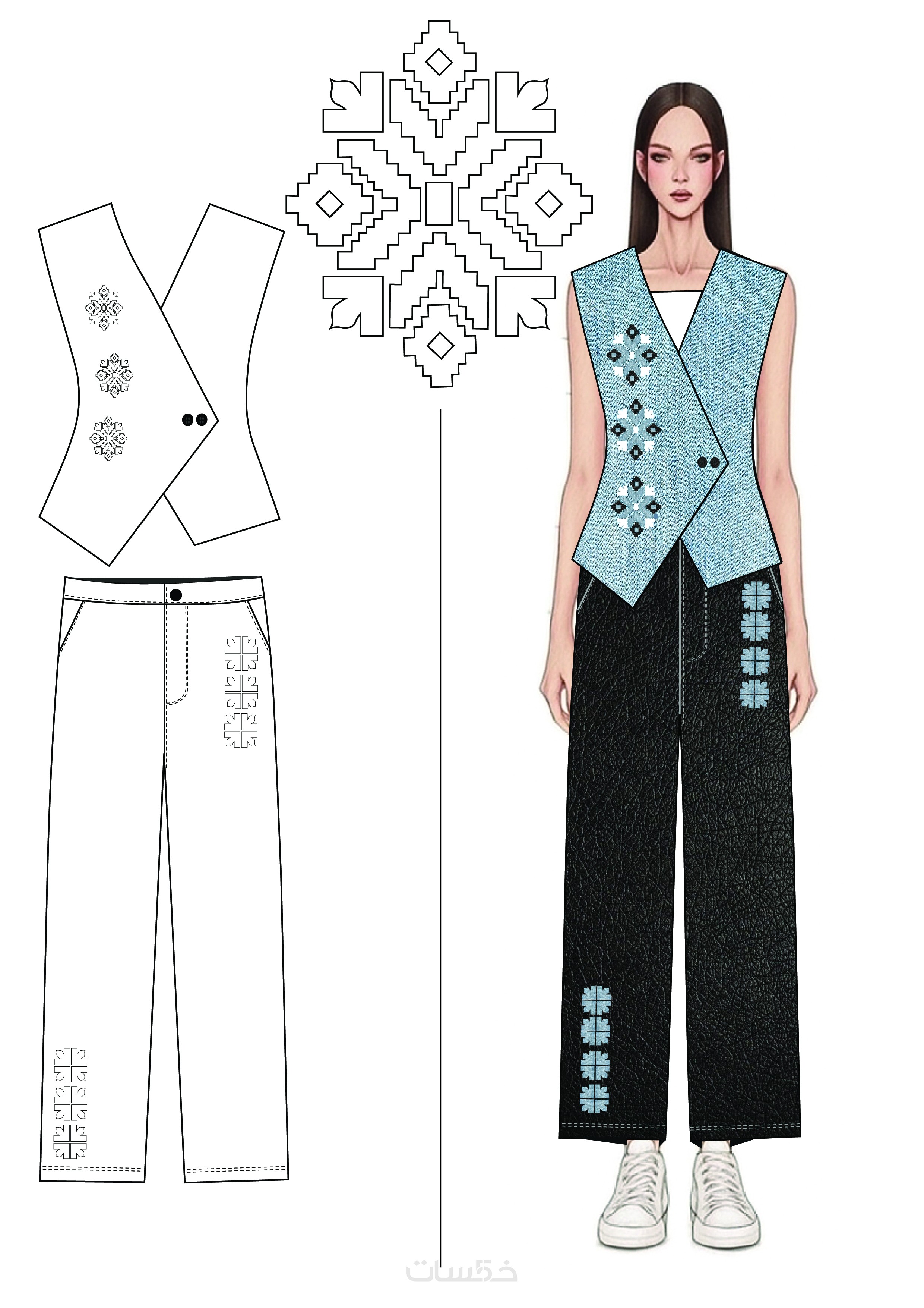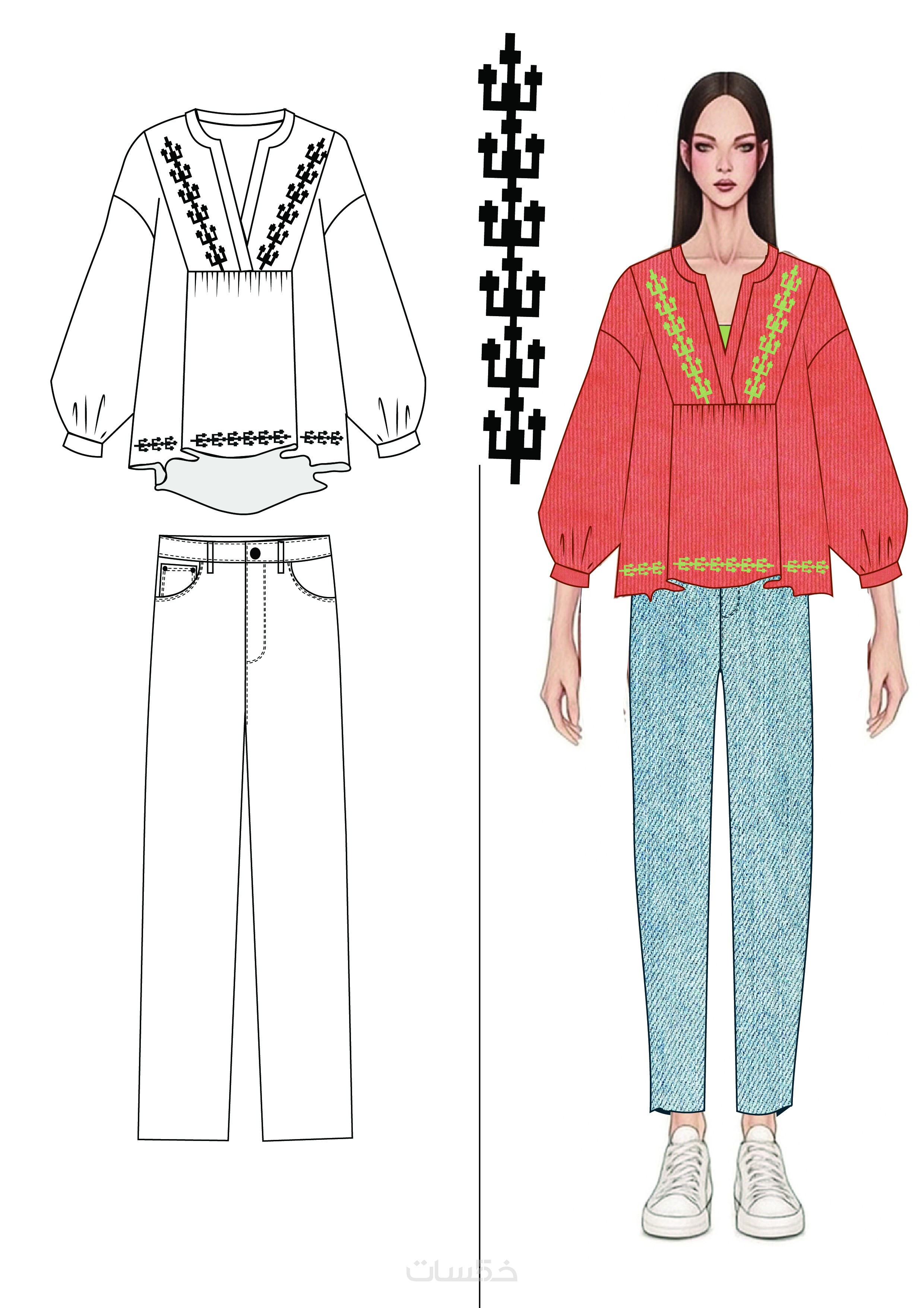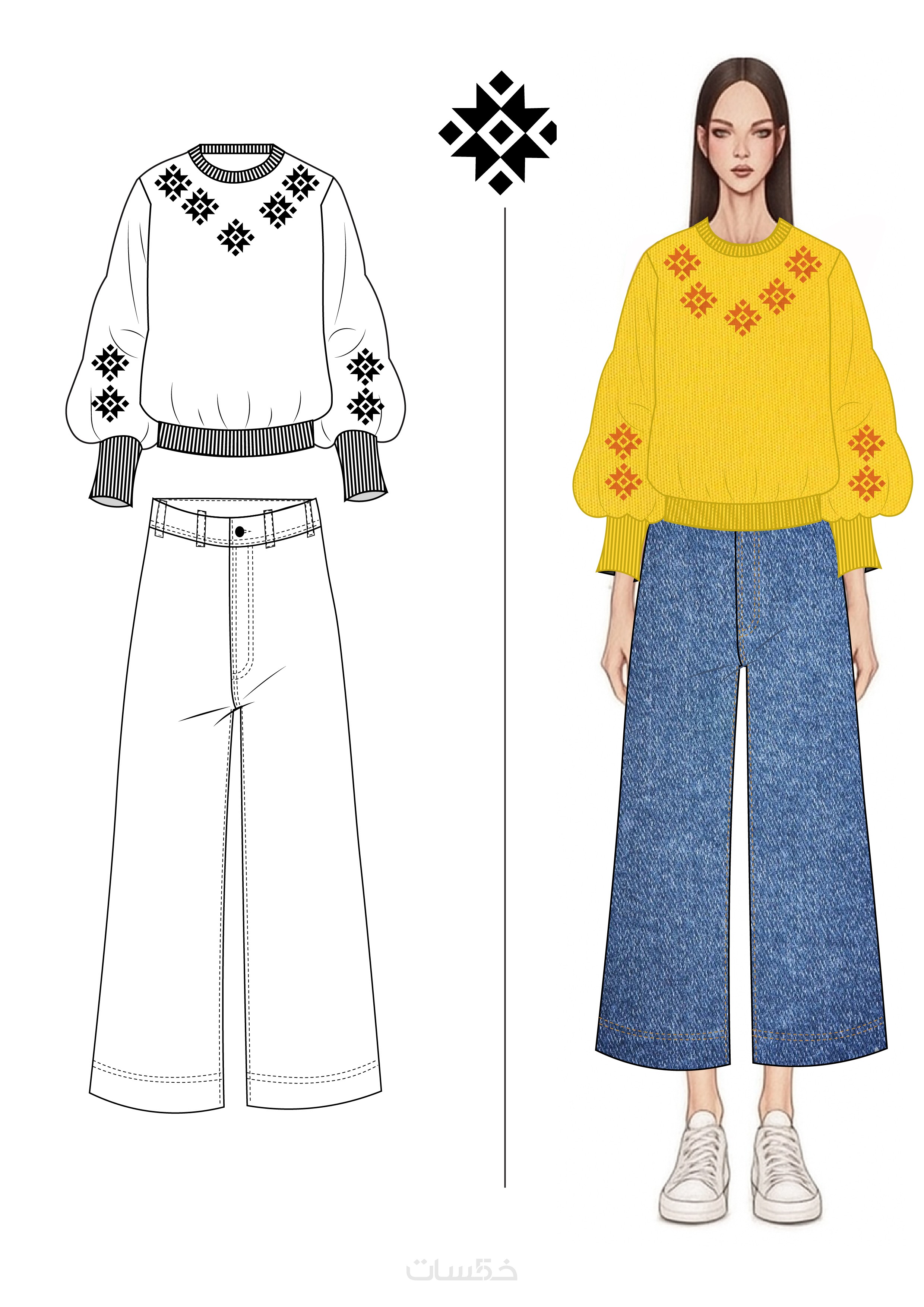 قة التنفيذ التقني: رسم السكيتشات بنسب واقعية (Proportions) تضمن سهولة فهم التصميم من قِبل الباترونيست أو المصنع.