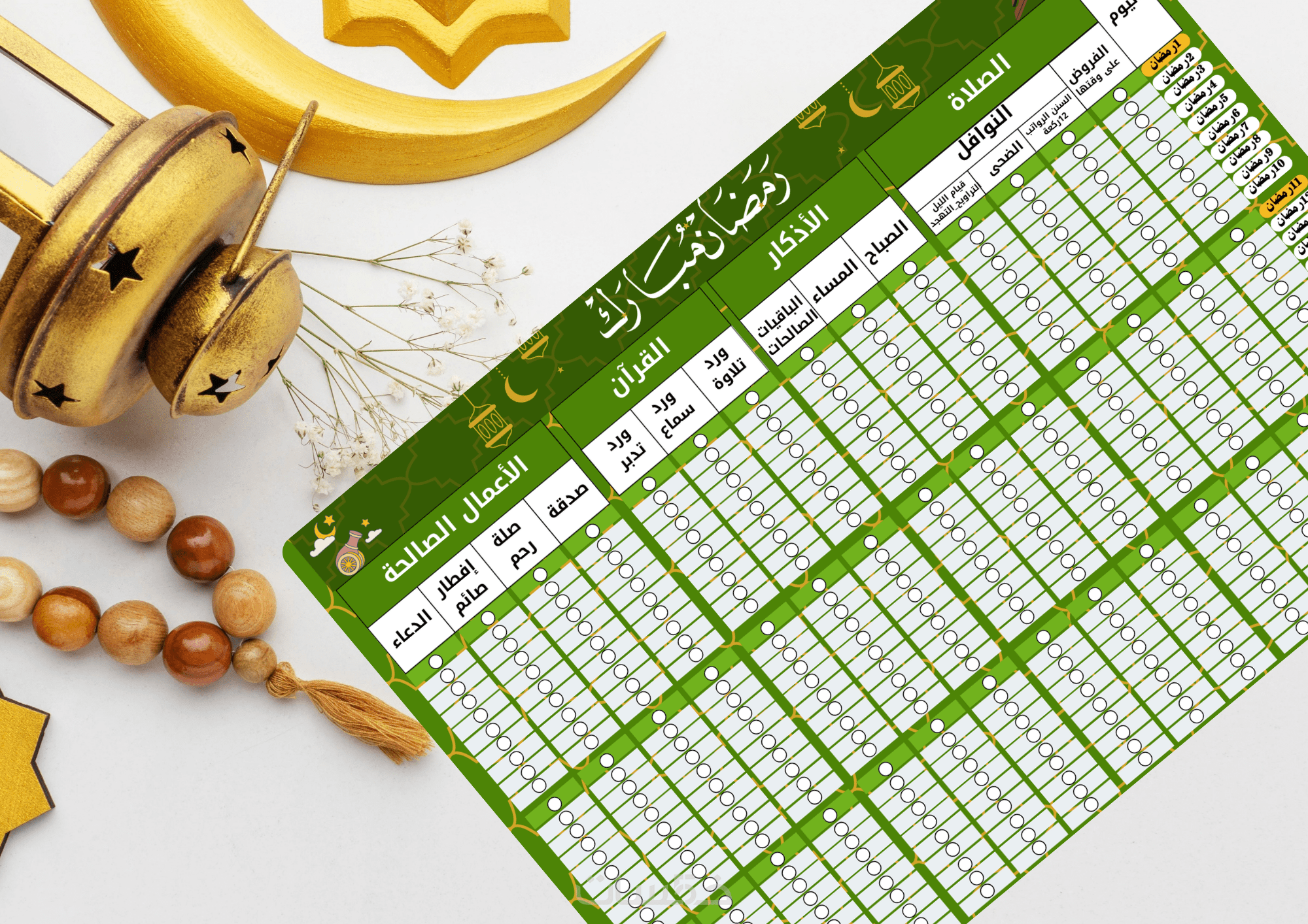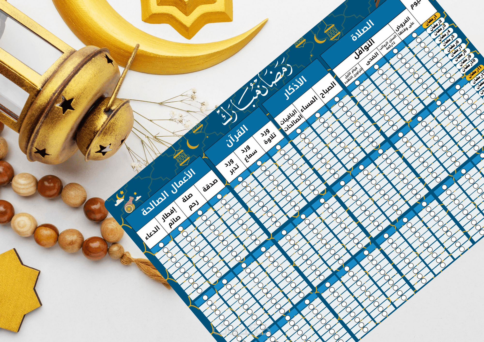 معكم مصممة جداول متابعة رمضانية رقمية مميزة (الصلاة، الأذكار، القرآن،الأعمال الصالحة)لمدة 30 يوم في ورقة كاملة يمكنك تثبيتها في ركن الصلاة الخاص بك، و استغلال أفضل لشهر رمضان المعظم...