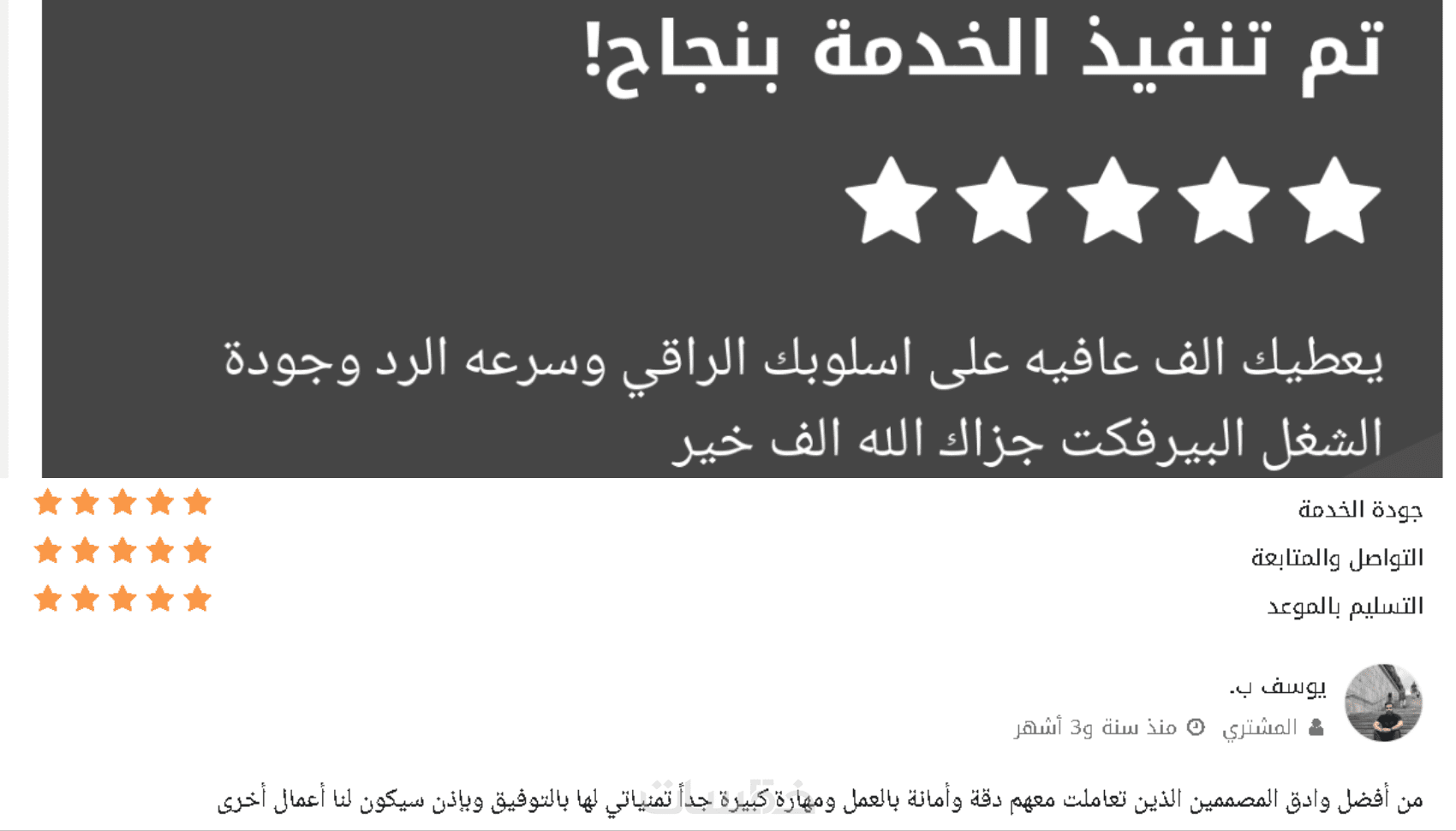 - تقييمات المشترين السابقين للخدمة وآرائهم حول جودتها ودقة إنجازها واحترافيتها، إضافة إلى حسن تعامل مقدم الخدمة مع العميل والتزامه بتسليم الملفات المتفق عليها خلال الوقت المحدد.