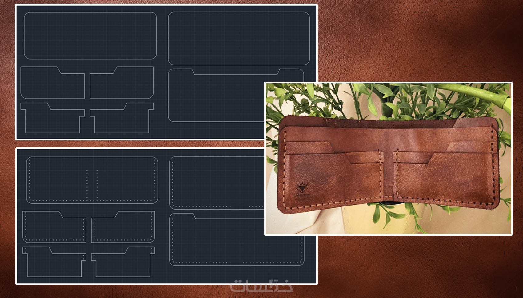 - يتم تنفيذ اجزاء المحفظة المطلوبة على برنامج ال AutoCad لضمان تنفيذها بالمقاسات المتفق عليها واخراجها بشكل صورة بالمقاسات الحقيقية لطباعتها لكي تسهل على المُصَنِّع تنفيذ فكرته على الطبيعة وتقطيع الجلد لتصنيع الشكل المطلوب.
