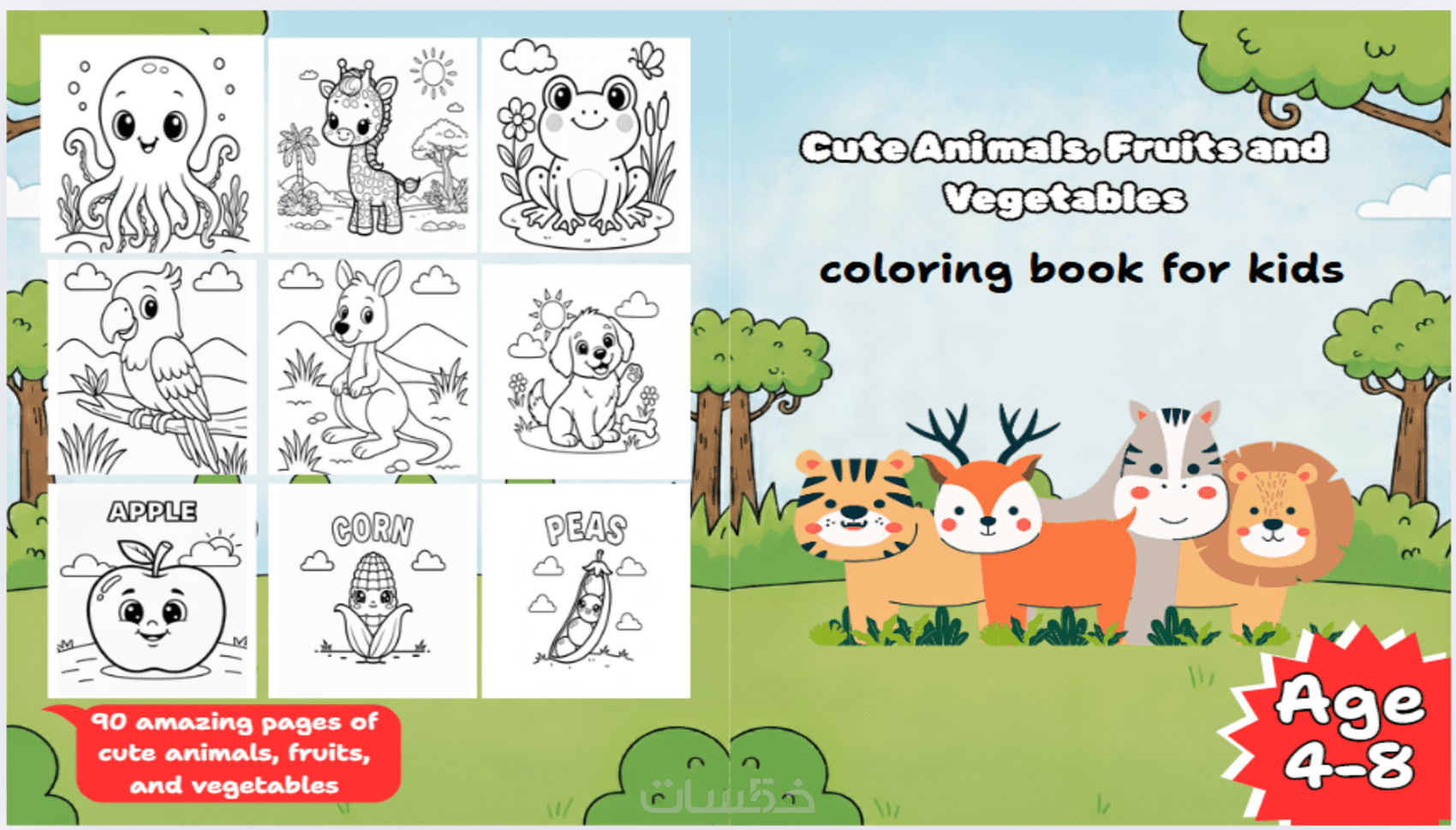 كتاب تلوين للأطفال حيوانات الغابة والفواكه والخضروات