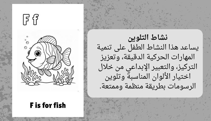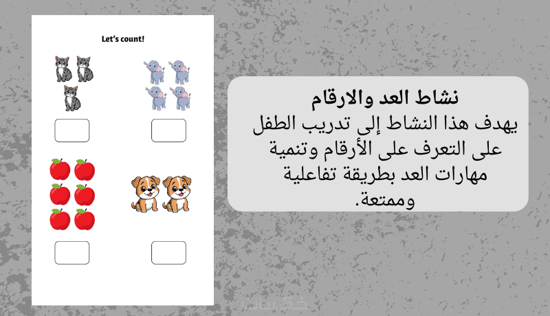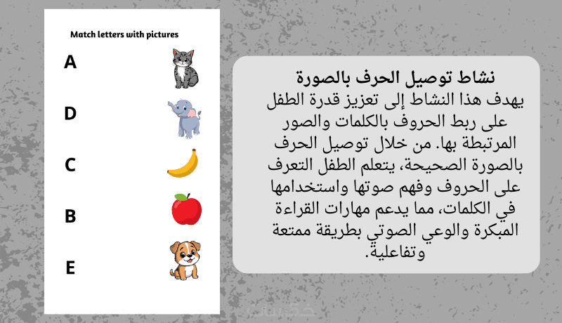 أنشطة مثل العد ووصل الحرف بالصورة لتعزيز الفهم والتعرف على الحروف