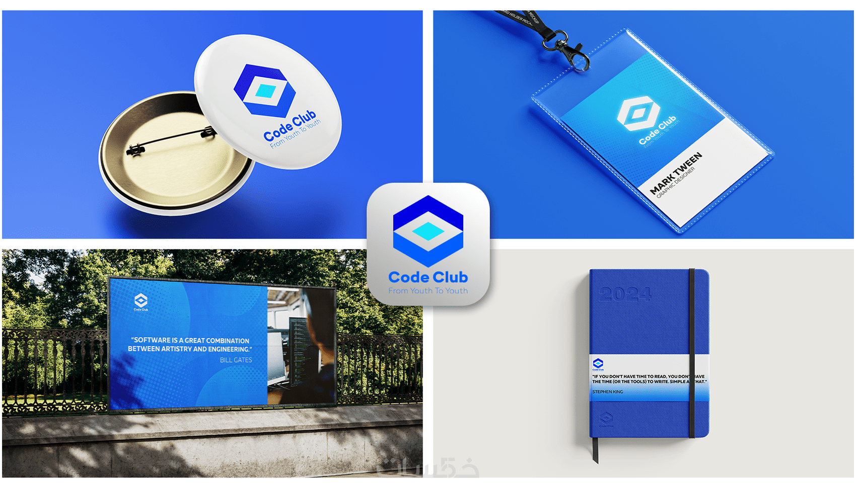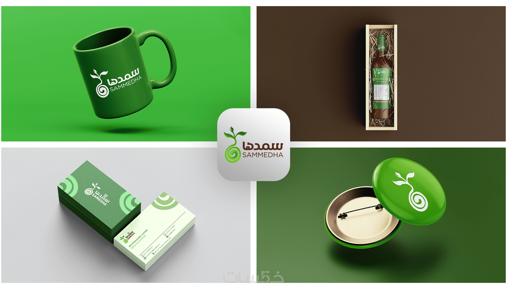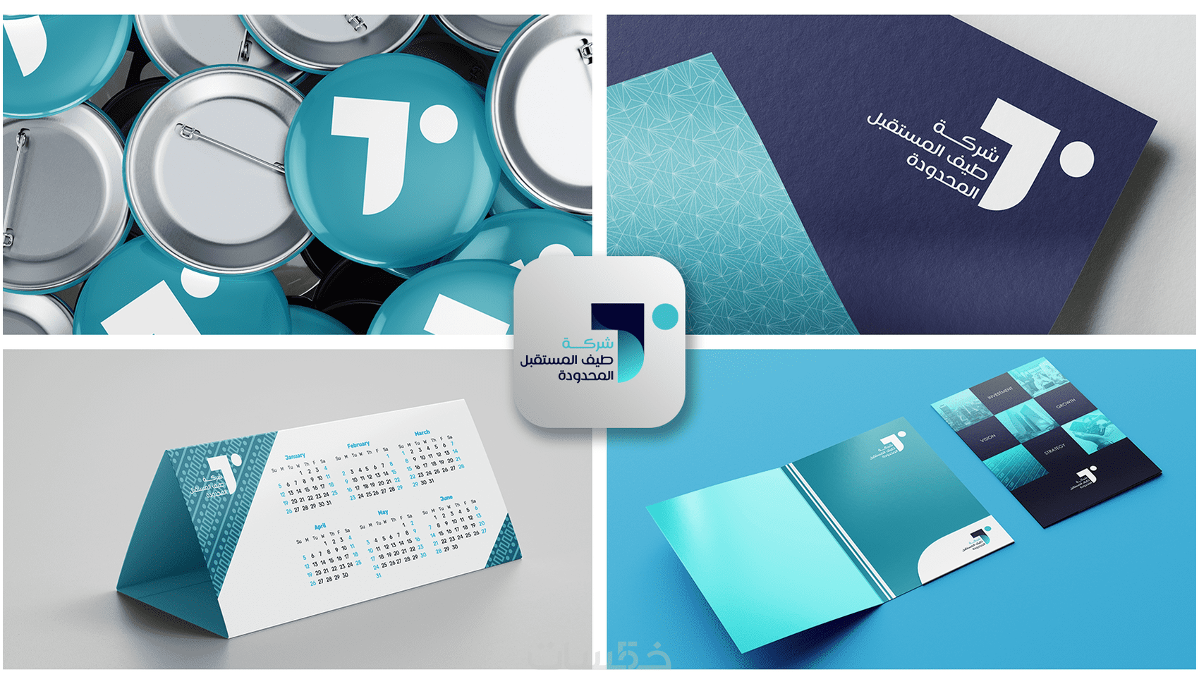 عرض الشعار على موكاب مجسم يوضح شكل التصميم قبل الطباعة .