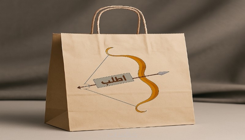 يمثل الشعار مزيجًا أنيقًا بين الرمز والمعنى، حيث يتكوّن من قوس ذهبي يمتد بداخله سهم فضي ينطلق بقوة نحو هدفه، حاملاً لافتة كُتب عليها "أطلب" بخط عربي واضح. الريشة البيضاء في مؤخرة السهم تُضفي لمسة من التوازن والدقة.