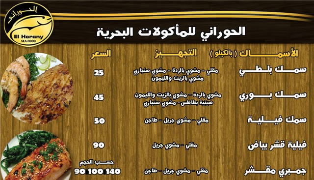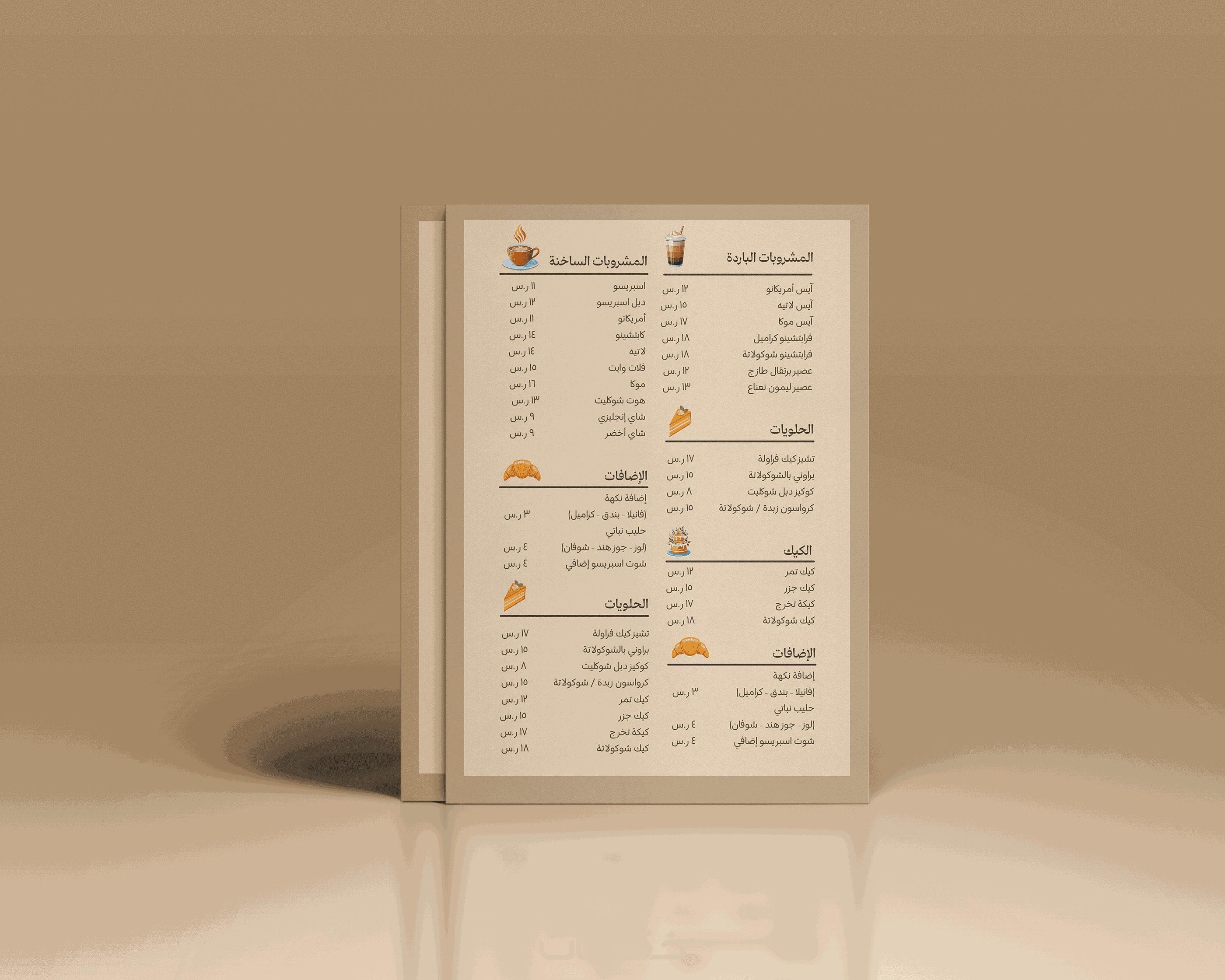 - منيو كبير الحجم: بمقاس ورقة A3 ويتم تصميمها على نمط لوح بشكل ملائم لأسلوب الطباعة العمودي، ويتم مراعاة تسلسل الأصناف قدر الإمكان بحسب ما يطلبه الزبون دائمًا.
