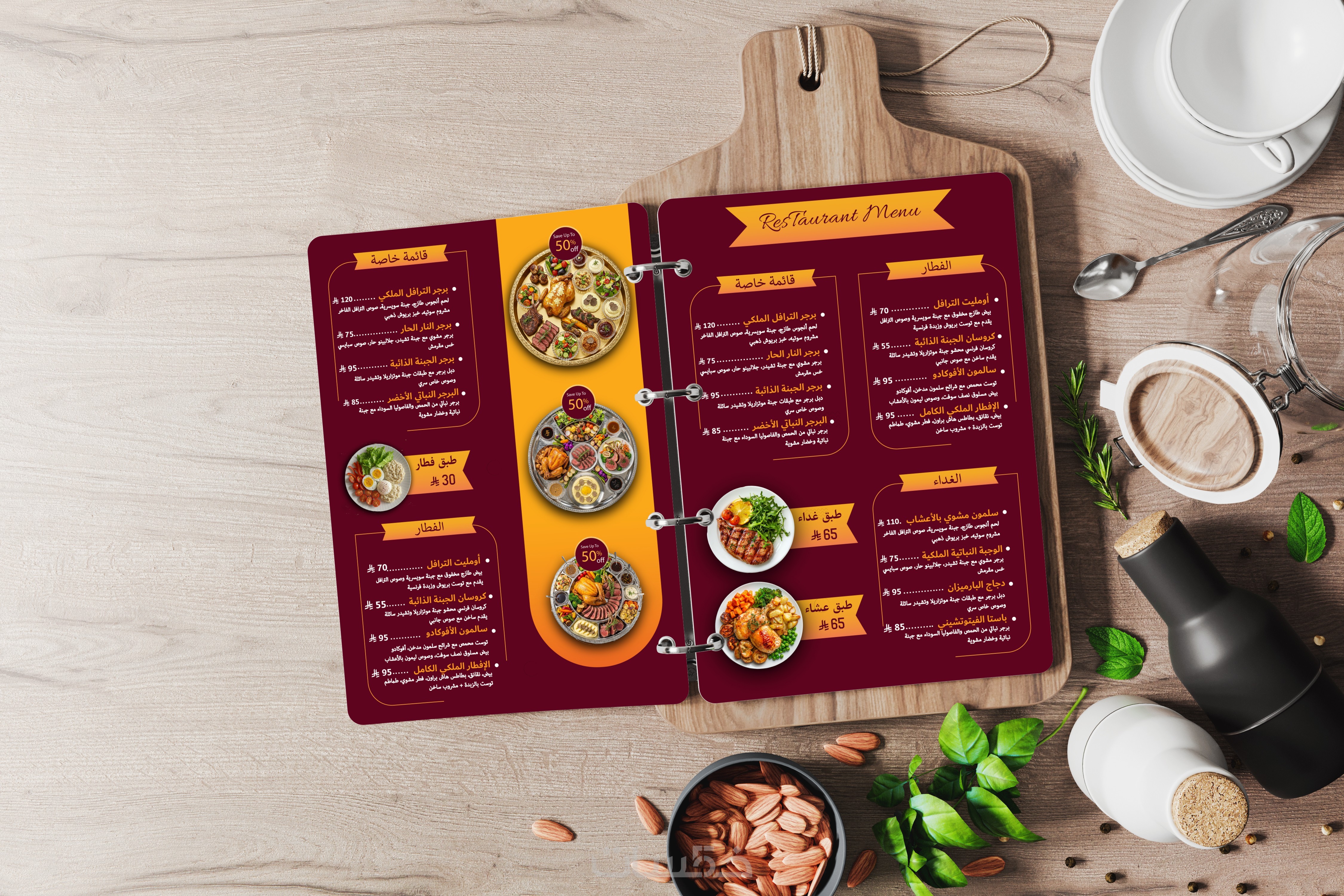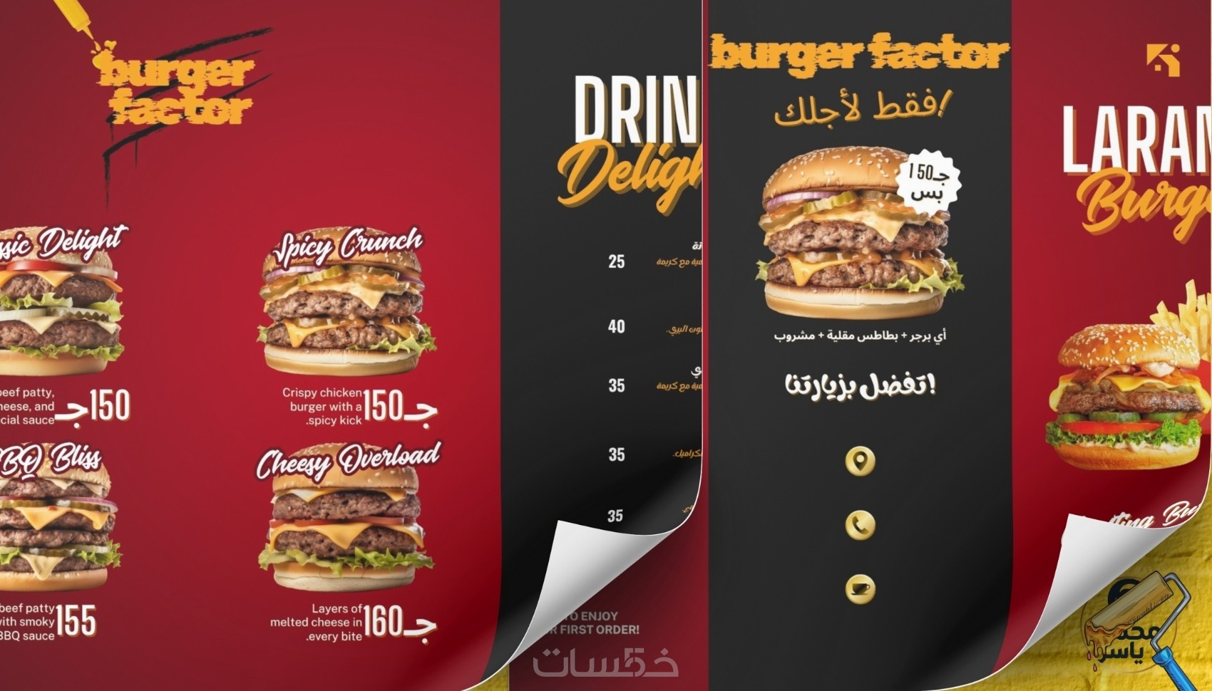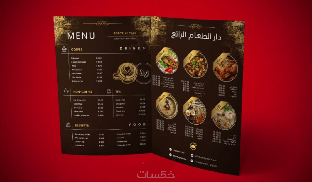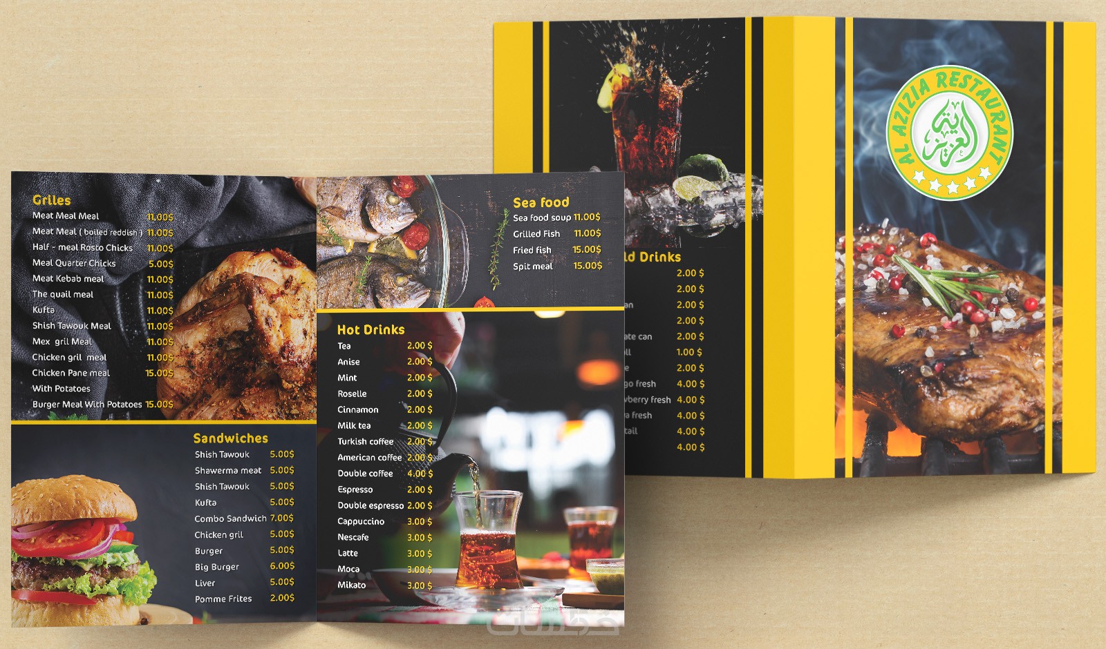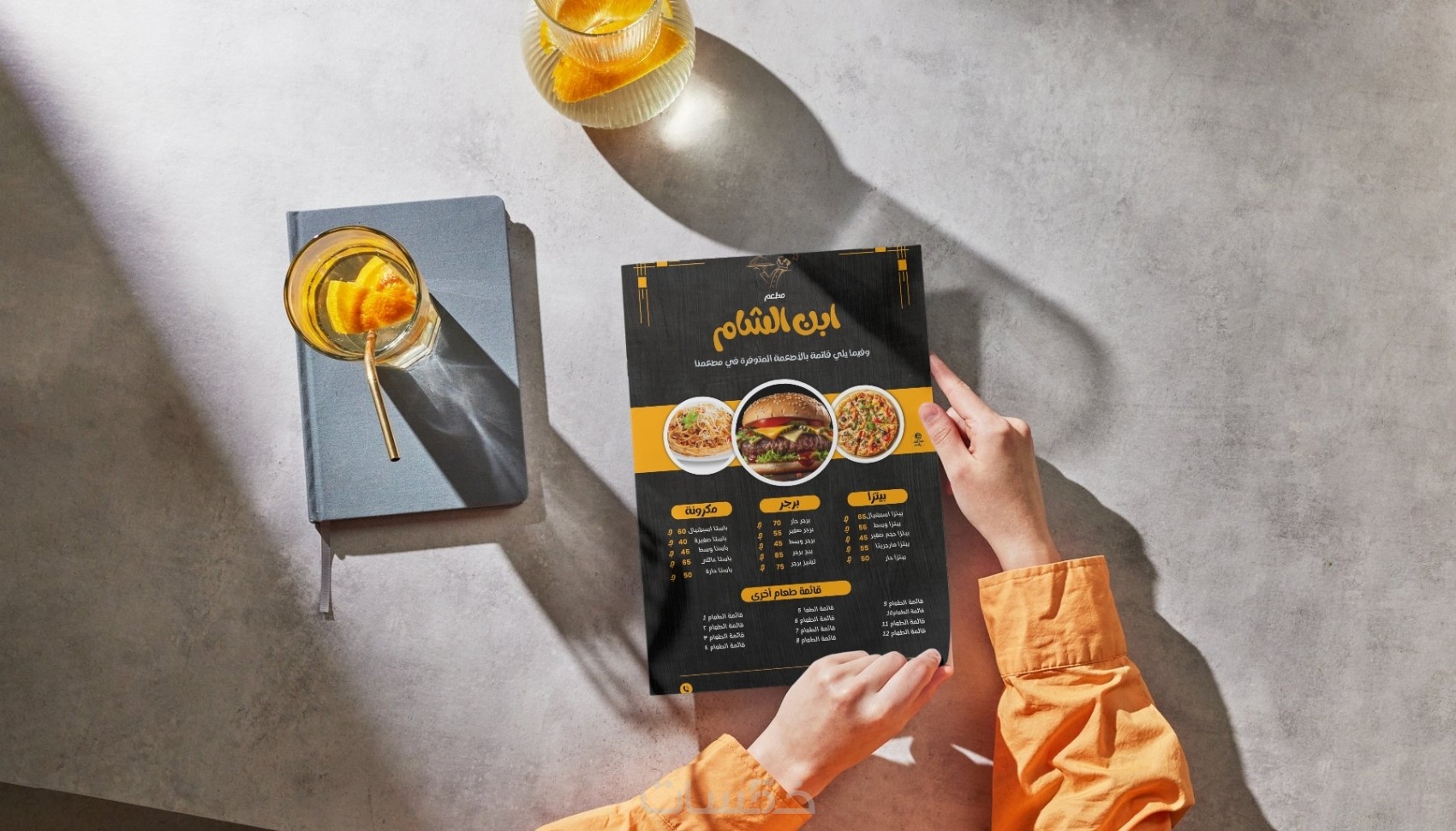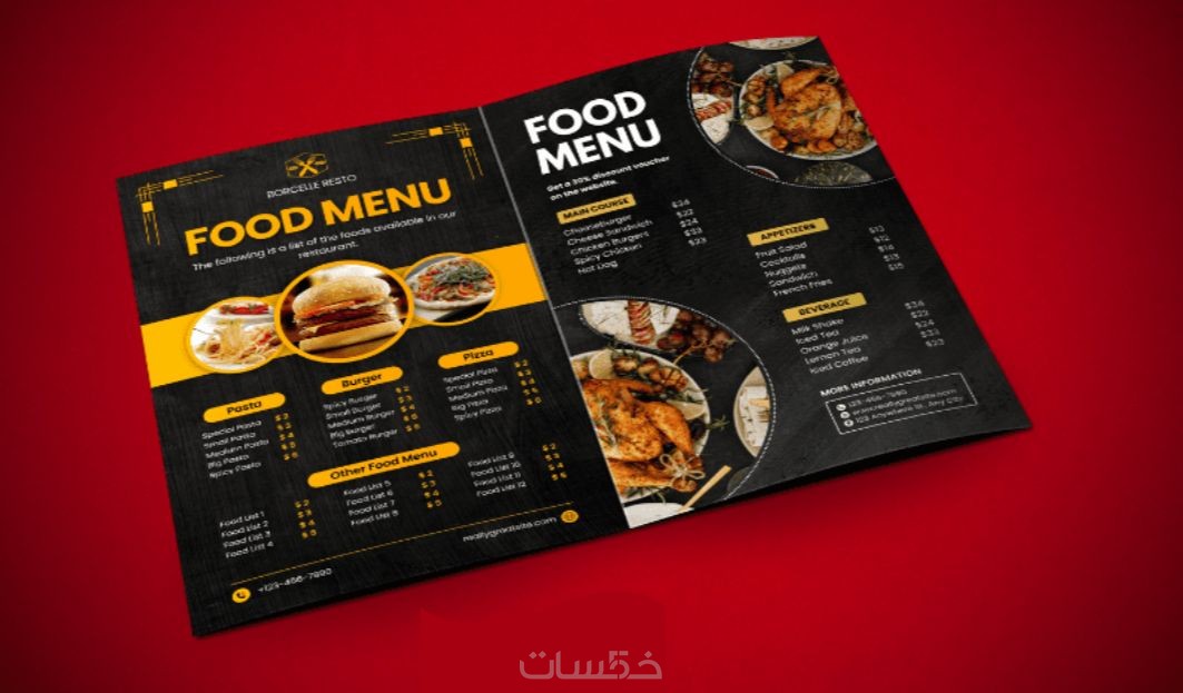 - اختيار التصميم: يتضمن اختيار الألوان والخطوط وتوزيع العناصر داخل التصميم بشكل متناسق، بالإضافة إلى وضع لوغو المطعم ومعلومات التواصل في مكانها المناسب.