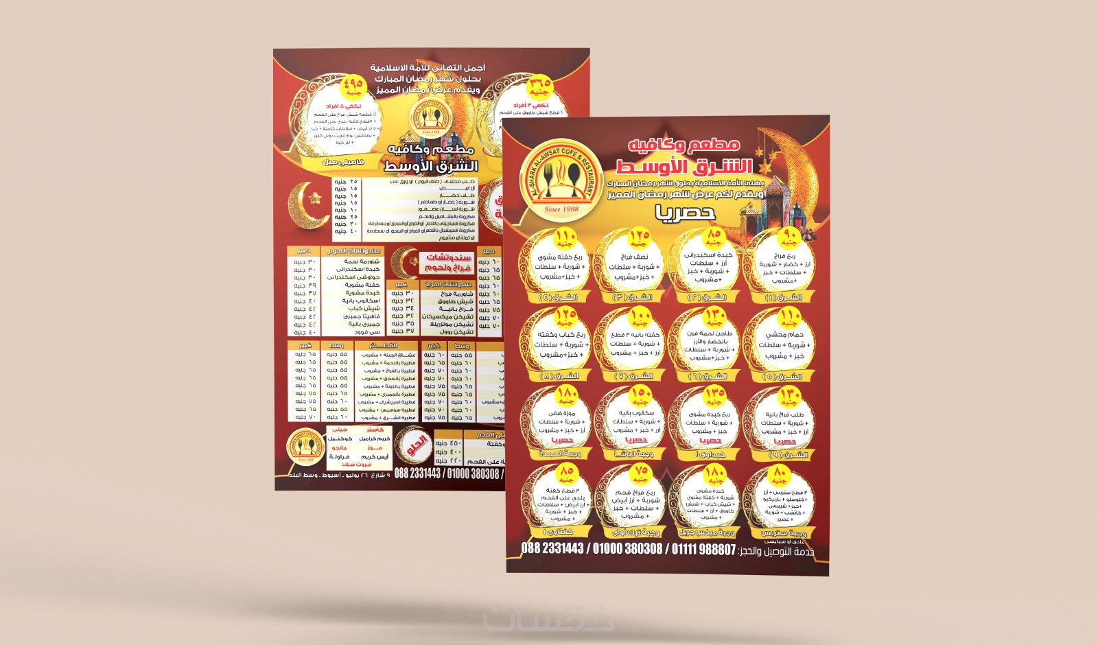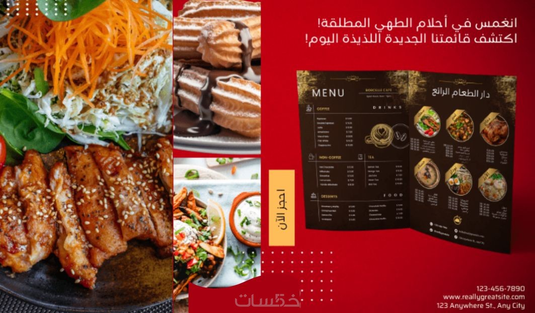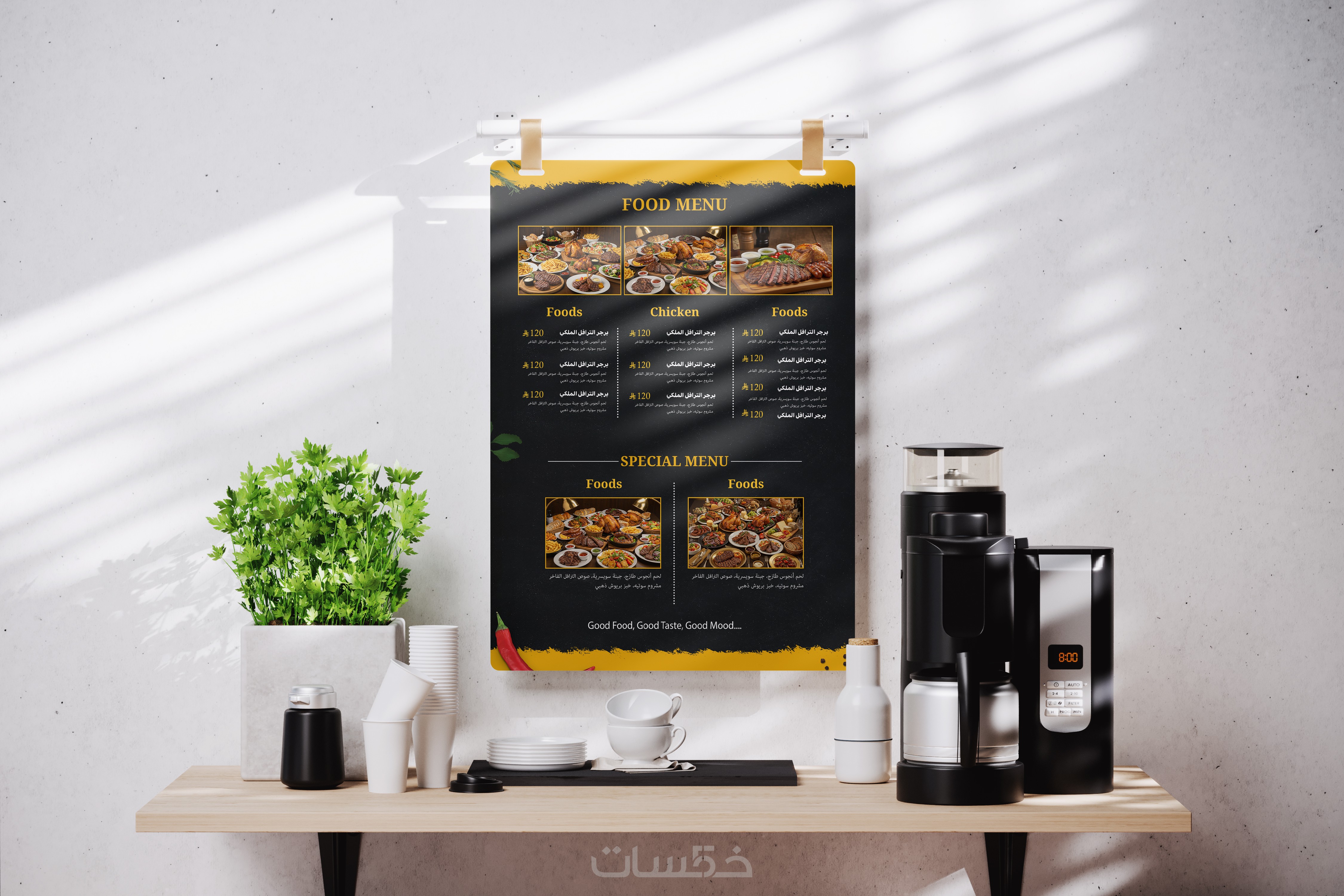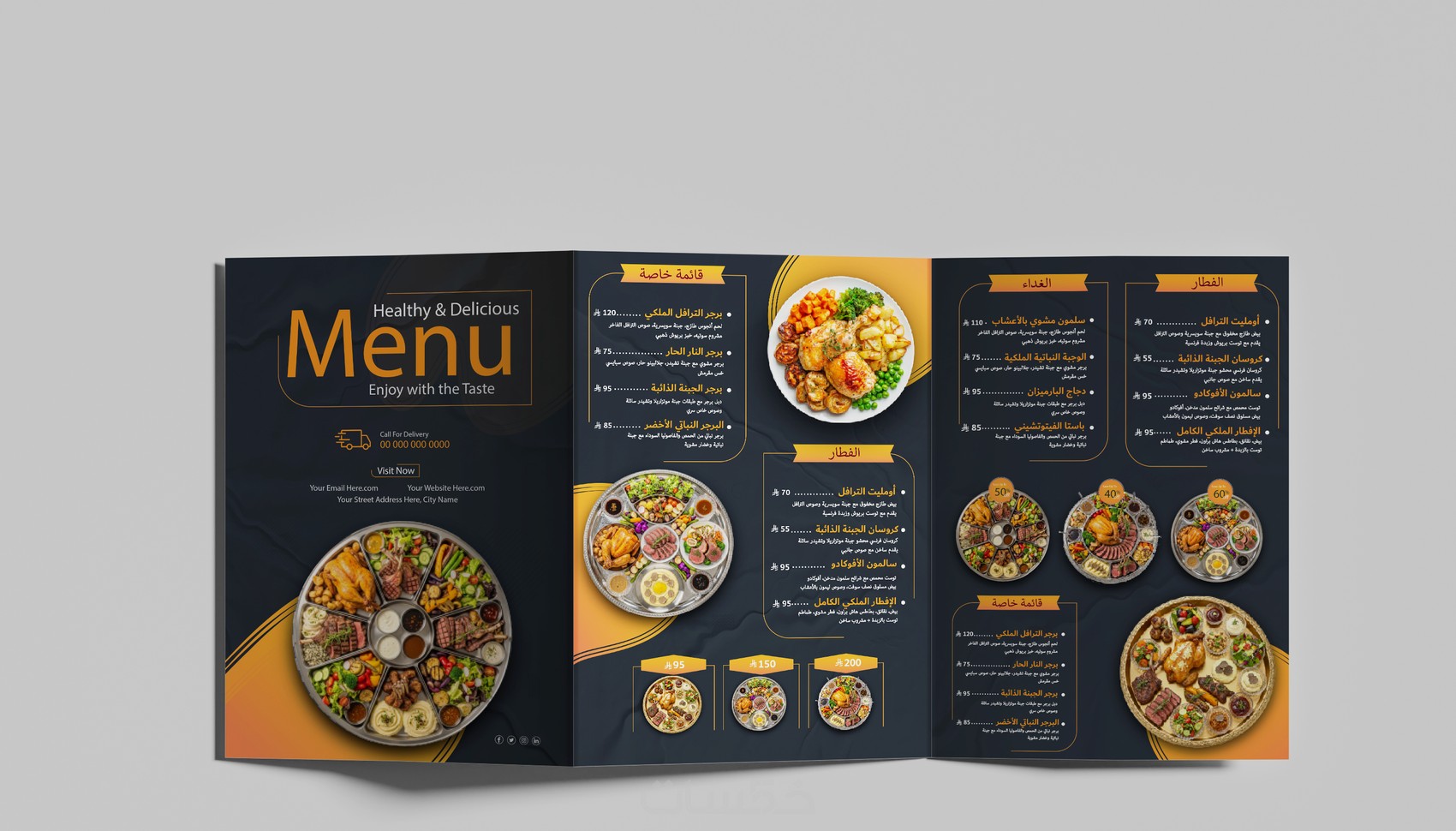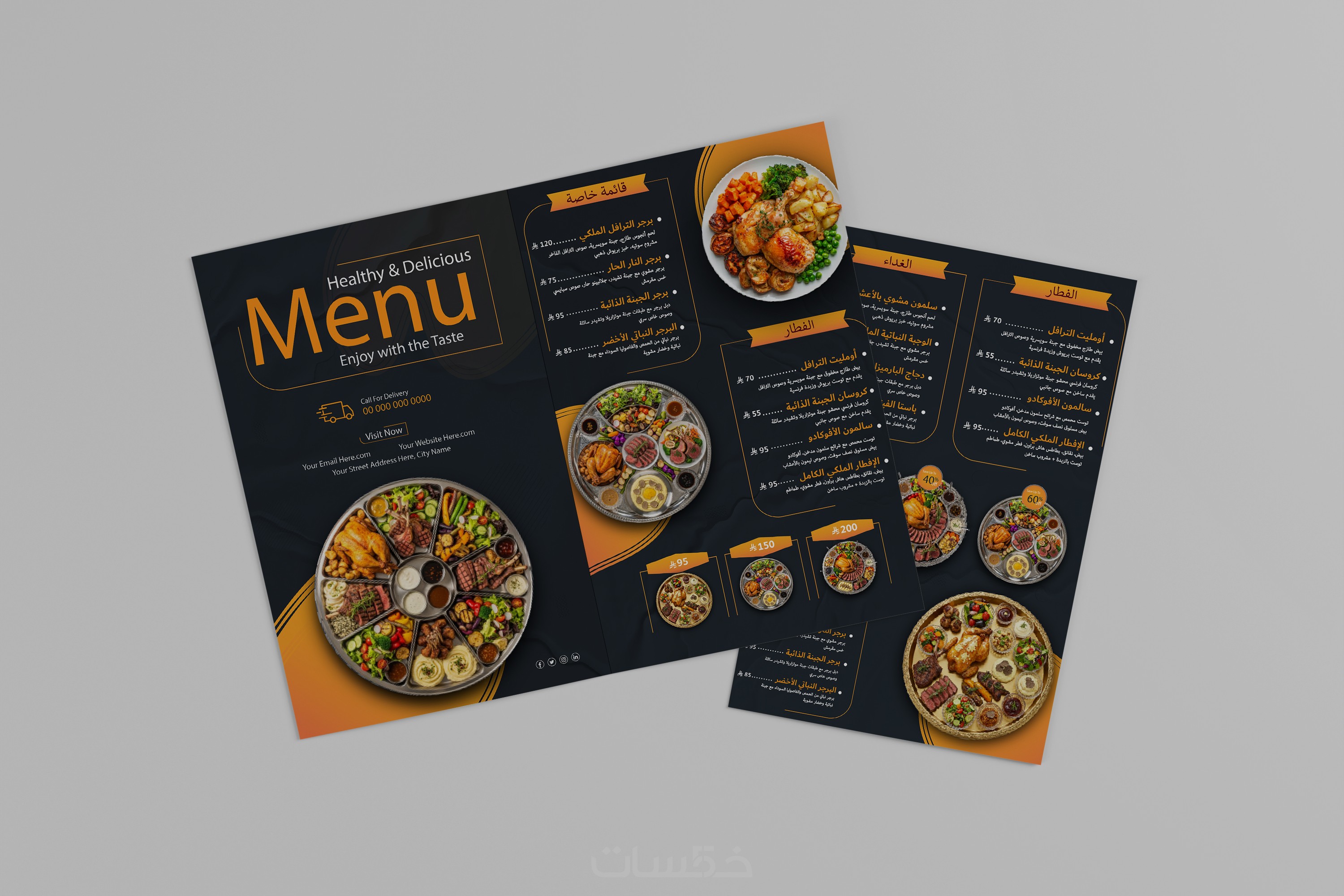 - اختيار التصميم: يتضمن اختيار الألوان والخطوط وتوزيع العناصر داخل التصميم بشكل متناسق، بالإضافة إلى وضع لوغو المطعم ومعلومات التواصل في مكانها المناسب.
