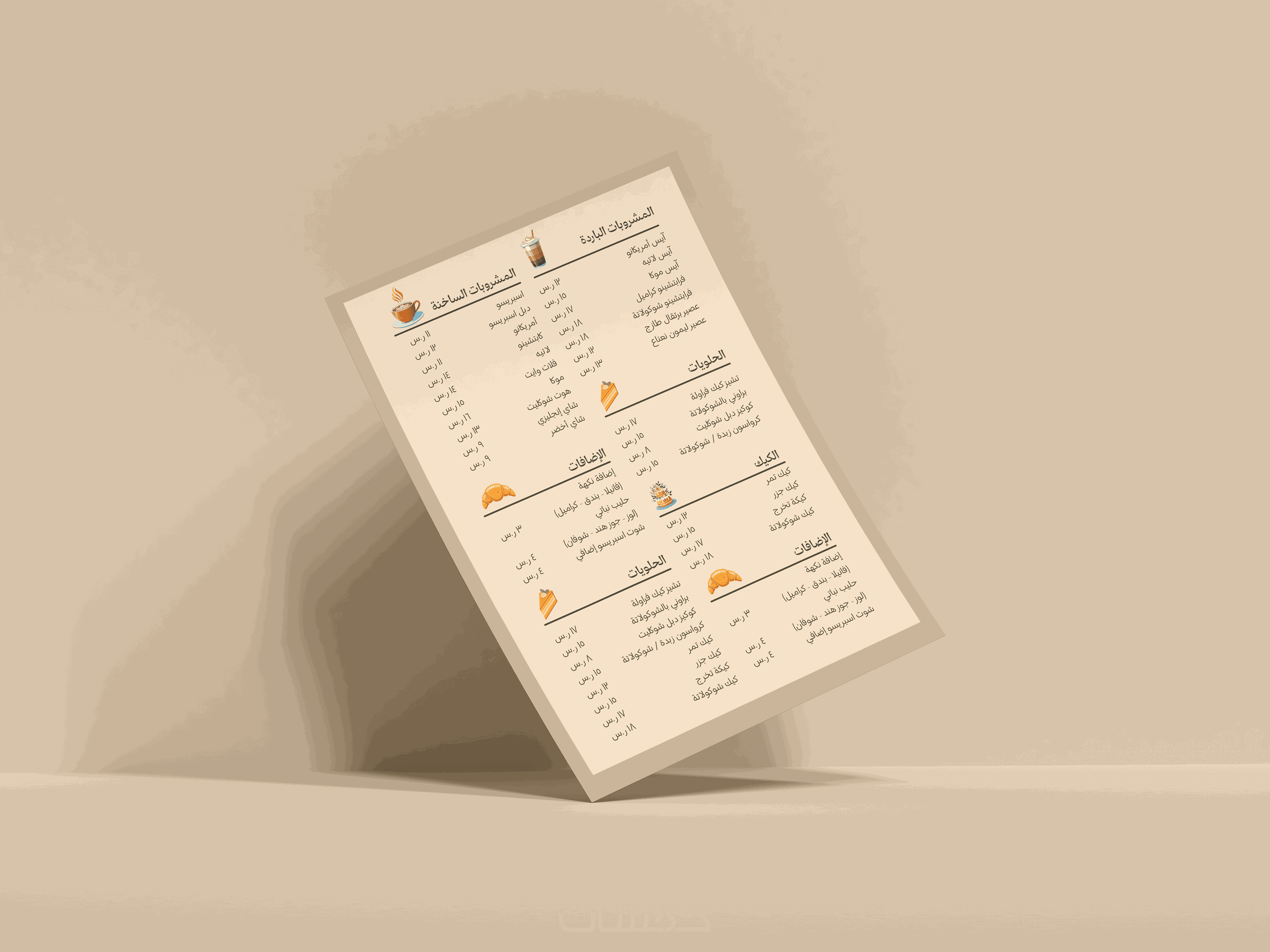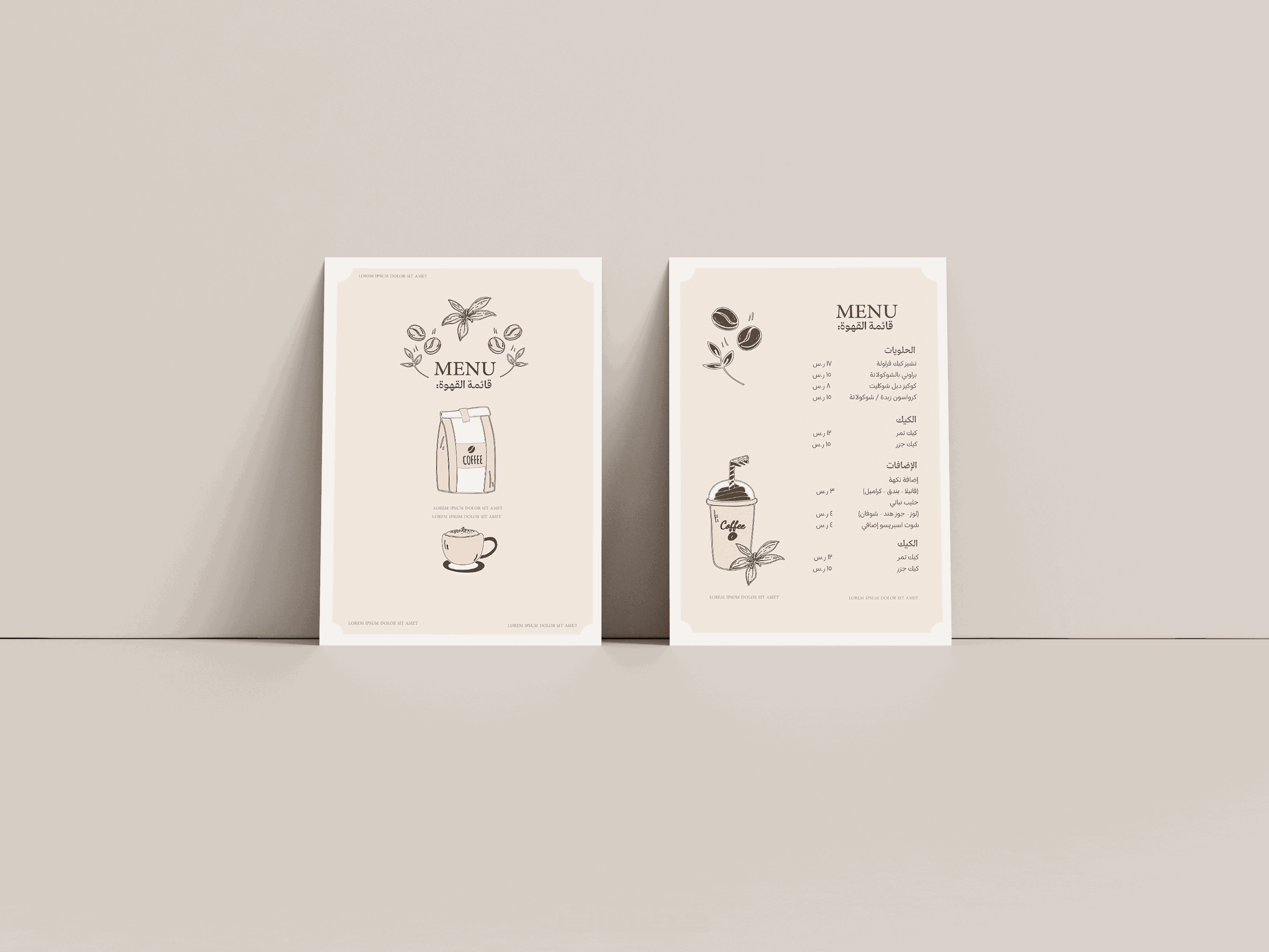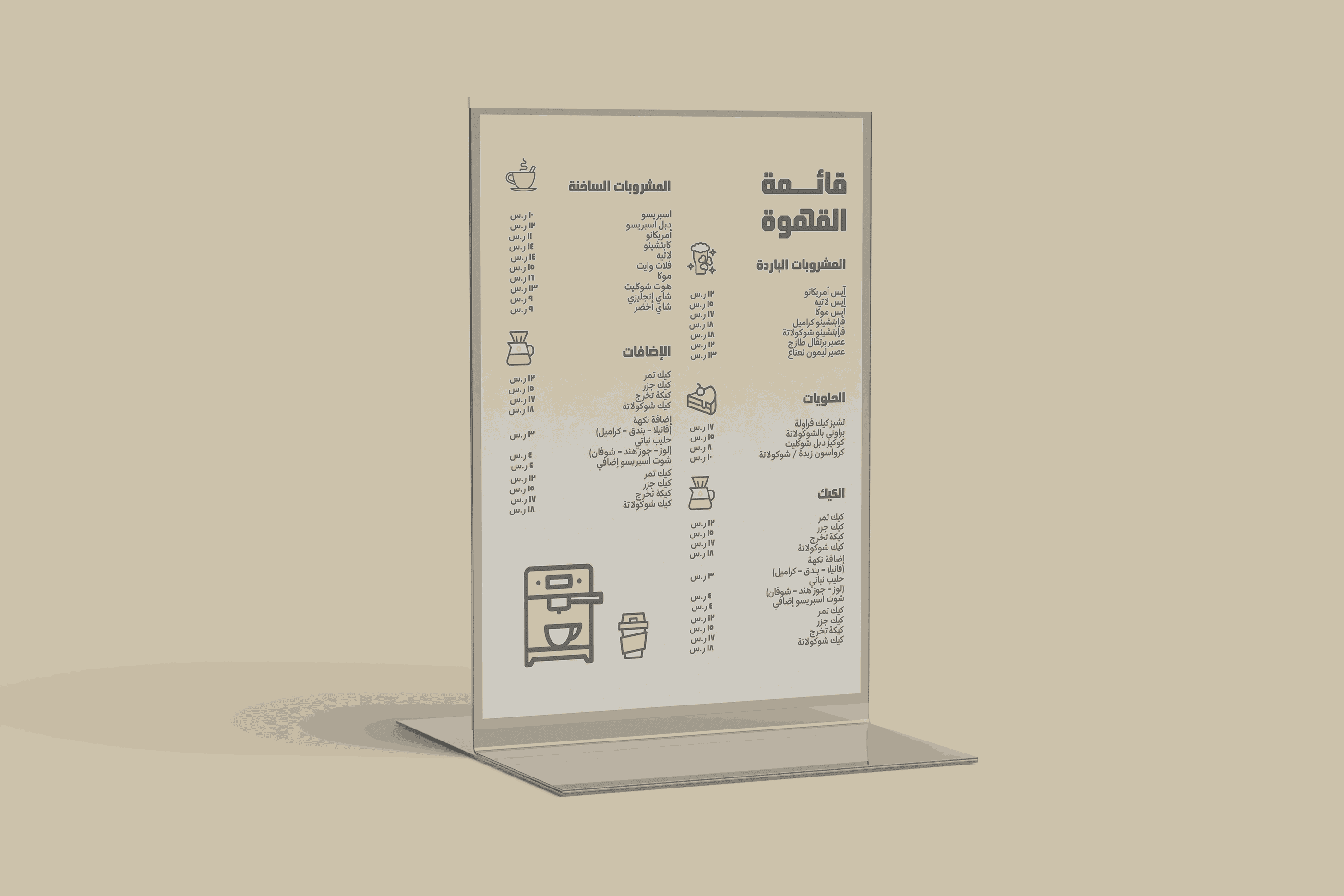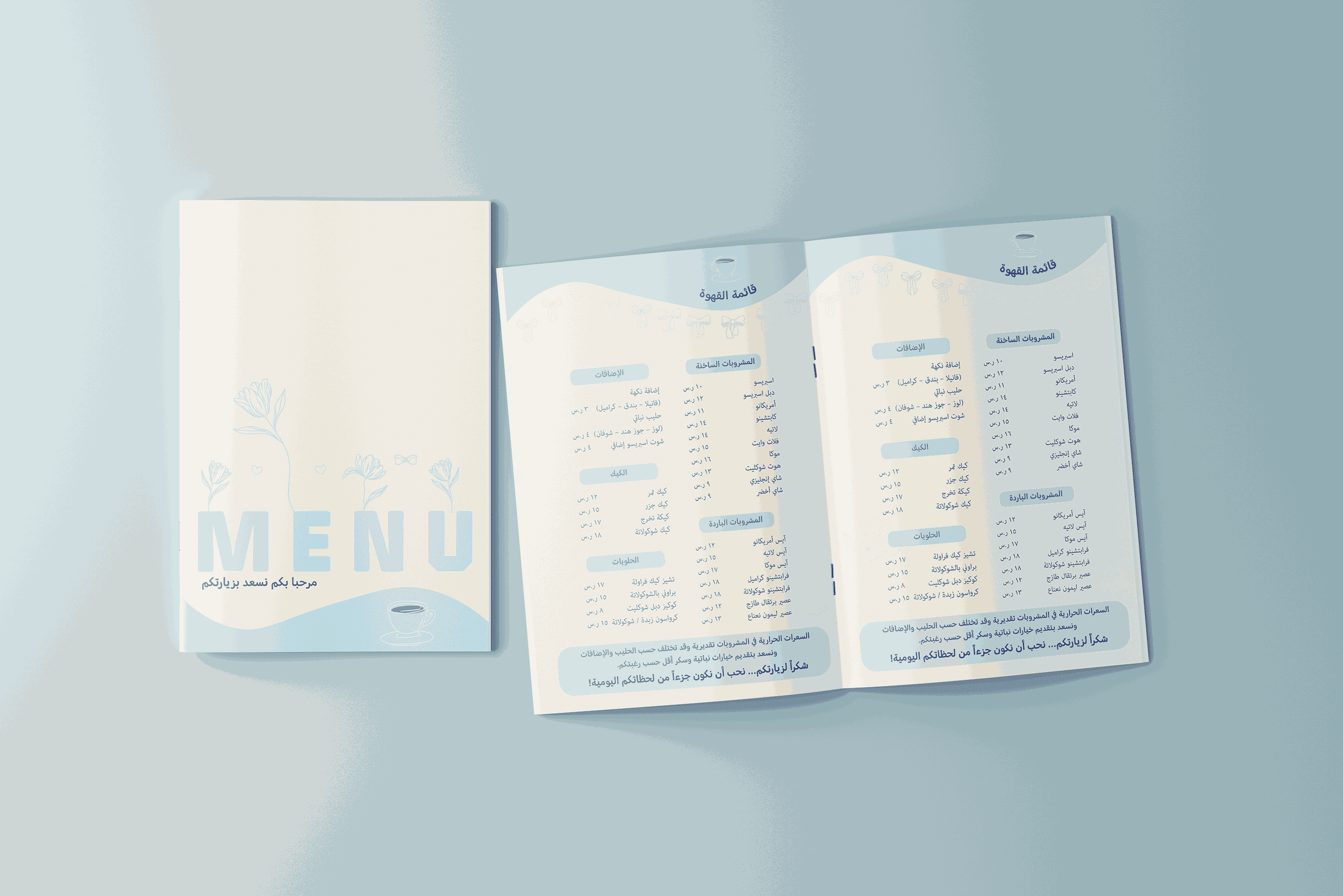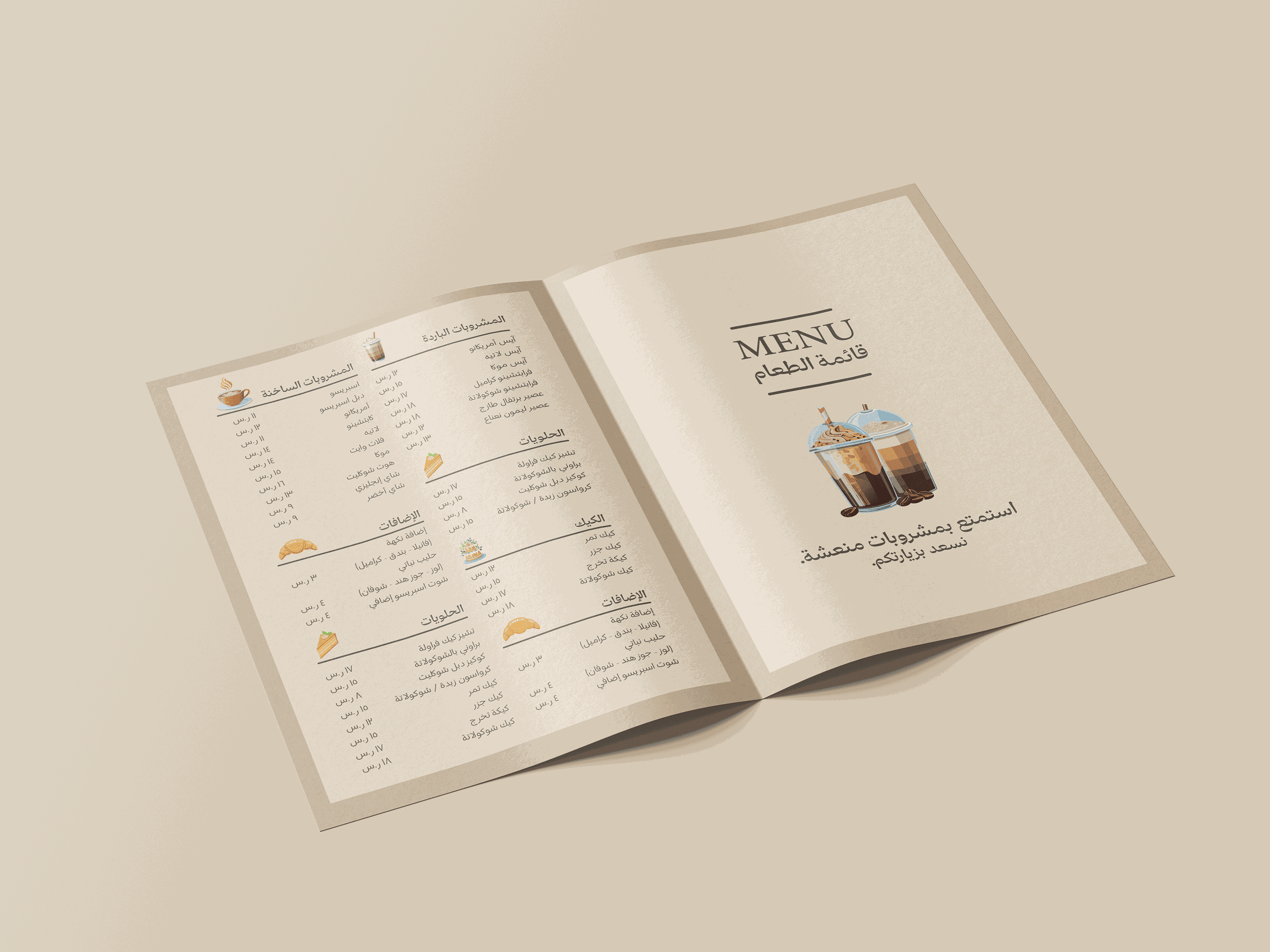تتمثل خدمات تصاميم المنيو التي يقدمها المصمم في إنشاء تصاميم منيو جذابة سواء كانت مطبوعة أو من خلال تصميم منيو إلكتروني، ولا يقتصر تصميم المنيو على المطعم فقط، بل هناك تصميم منيو كوفي أو تصميم منيو عصائر وكذلك تصميم منيو للحفلات. يتضمن تصميم المنيو الاختيار المناسب للخطوط والألوان والصور والتنسيقات بشكل احترافي ومعبّر عن نمط المطعم وشخصيته.