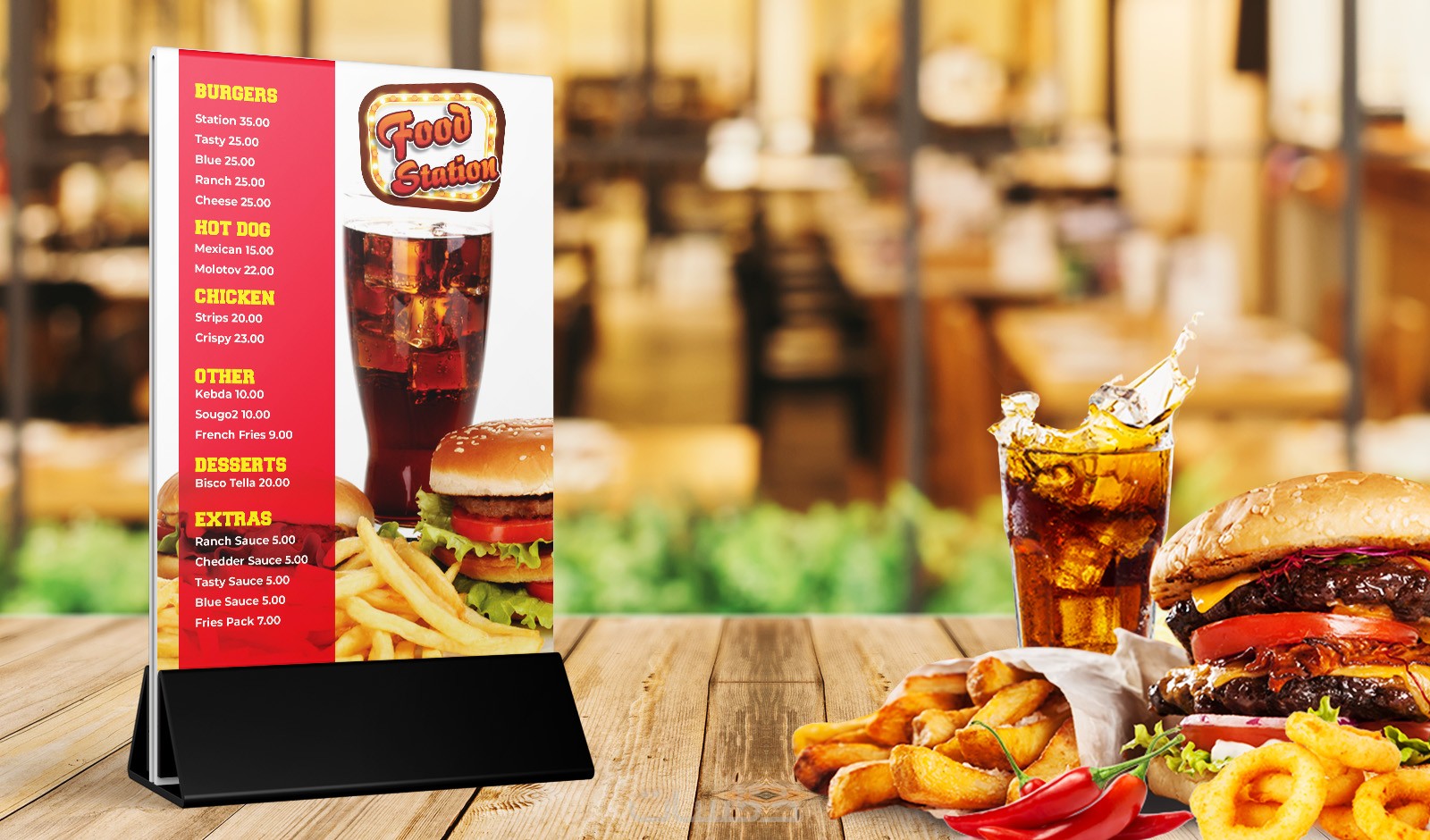 - منيو البطاقة أو الدفتر: المقاس الشائع له بحجم ورقة A5 وهو عبارة عن منيو صغير الحجم، يمكن زيادة عدد صفحاته وتحويله إلى دفتر تستطيع من خلاله سرد كافة الأصناف التي يقدمها مطعمك.