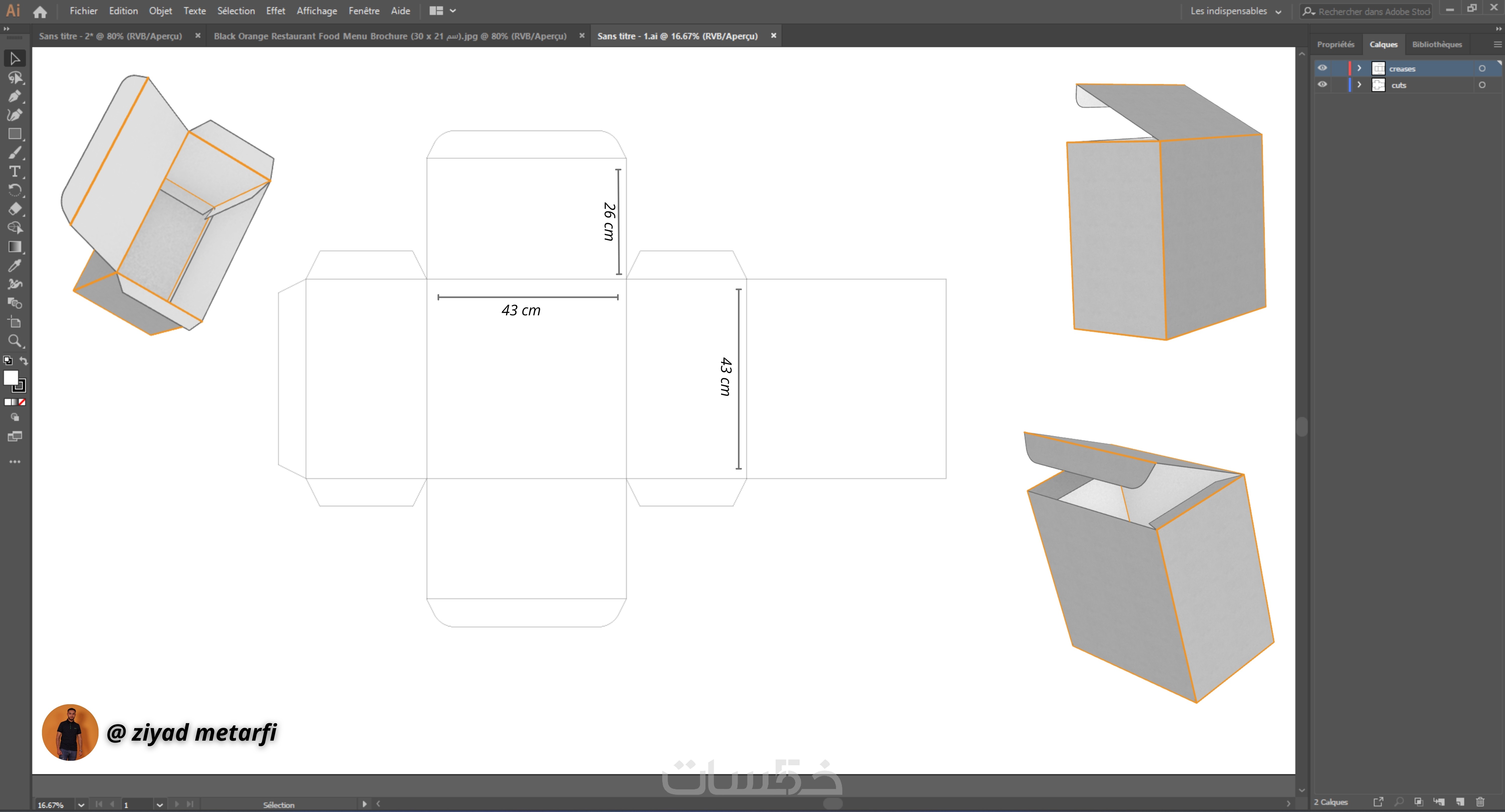 حيث نقوم بالتعديل على المشروع بنأء على ملاحضاتكم وحسب رغبتكم كلمقسات و التصميم الخراجي للعلبة