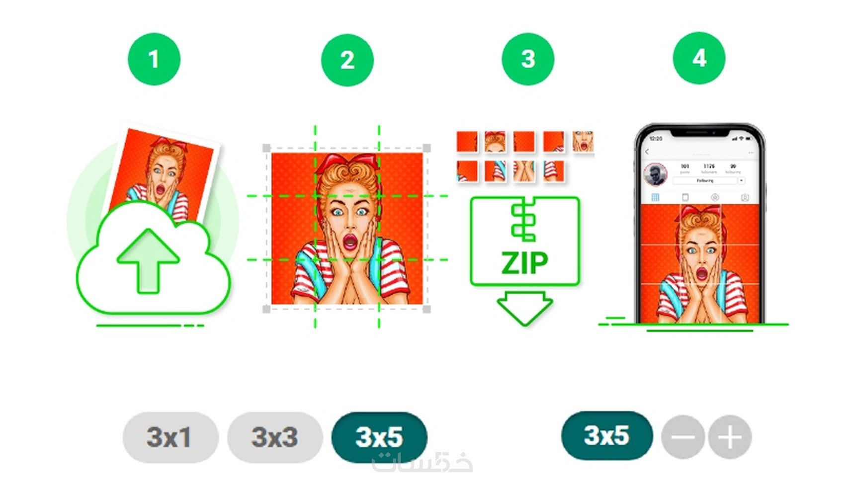 • دعنا نقسّم لك الصورة الواحدة الى 12 أو 9 أو 6 أو 3 صور ويمكنك مشاركتها بشكل مرقم و متسلسل على الانستقرام وستحصل في النهاية على صورة واحدة كبيرة على الصفحة الرئيسية لحسابك الشخصي على الانستقرام لإنشاء مربع بانر كبير ونبهر كل متابعيك !