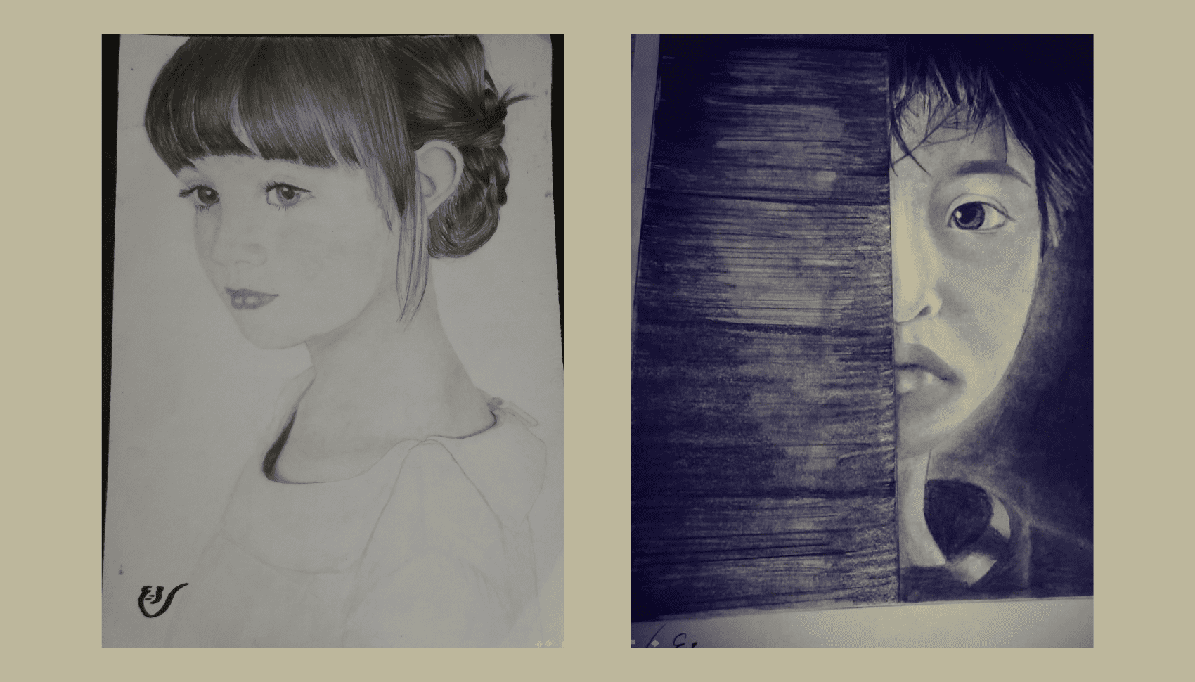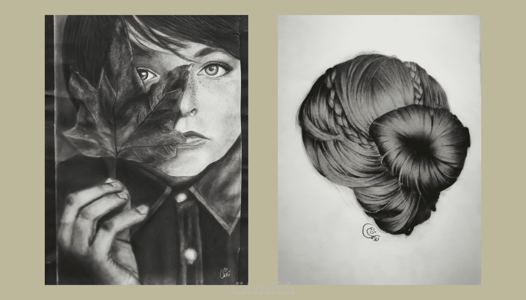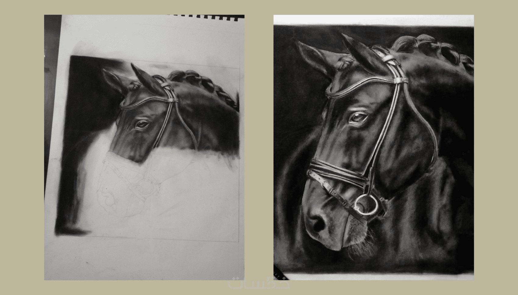 يتم رسم البورتريه يدويًا بالكامل بالفحم على الورق دون استخدام أي برامج رسم رقمية.