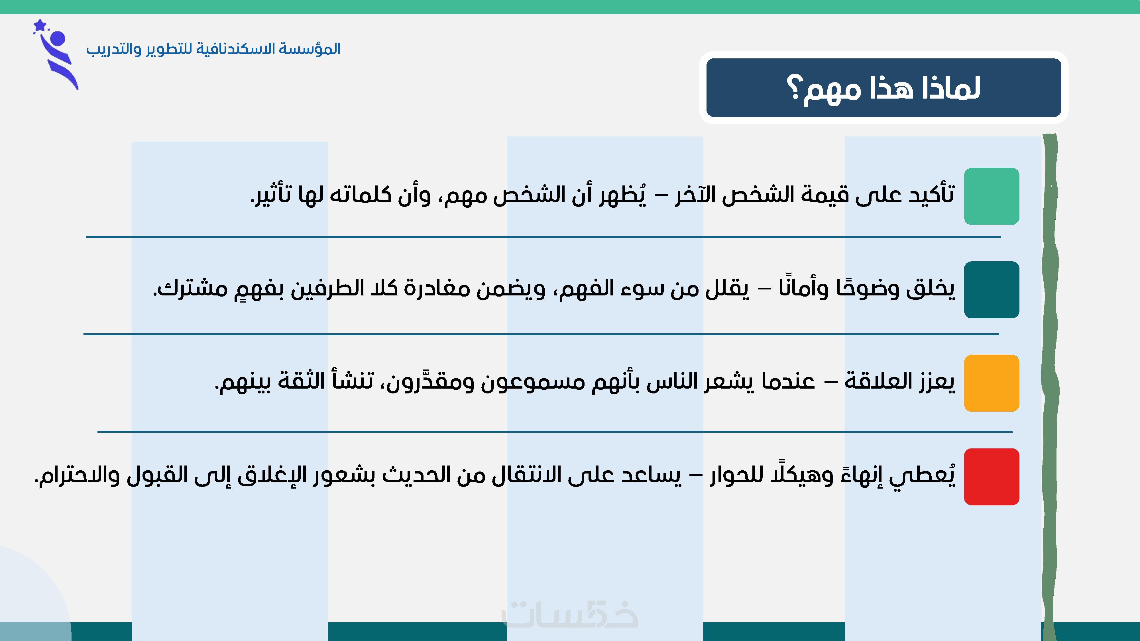 - الرغبة المستمرة بالتعلم سواء لجهة فهم المحتوى المطلوب إنشاء عرض تقديمي له والرسالة المقصودة من ورائه ومواكبة التطورات التكنولوجية والتقنية والتوجهات الجديدة في العروض التقديمية.