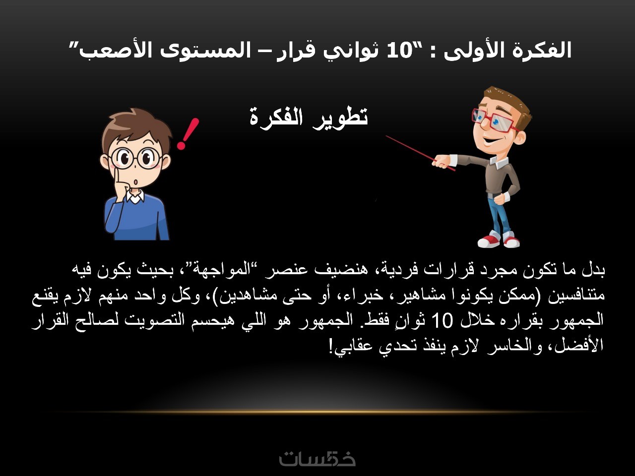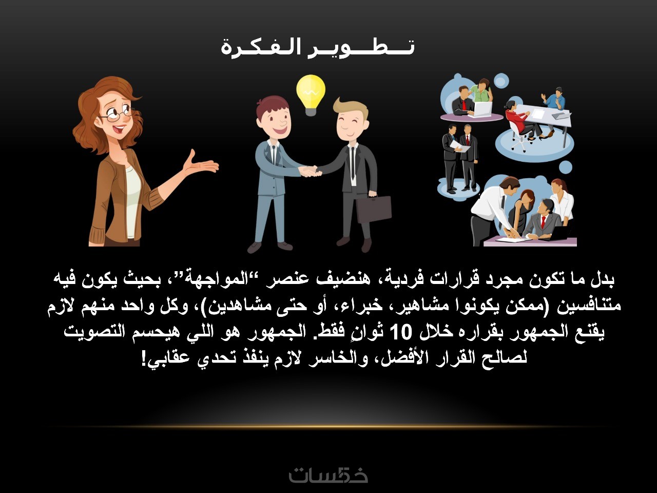 أركز على وضوح المحتوى، تنسيق العناوين، استخدام الألوان المناسبة، والأيقونات أو الرسومات التي تدعم فكرتك.