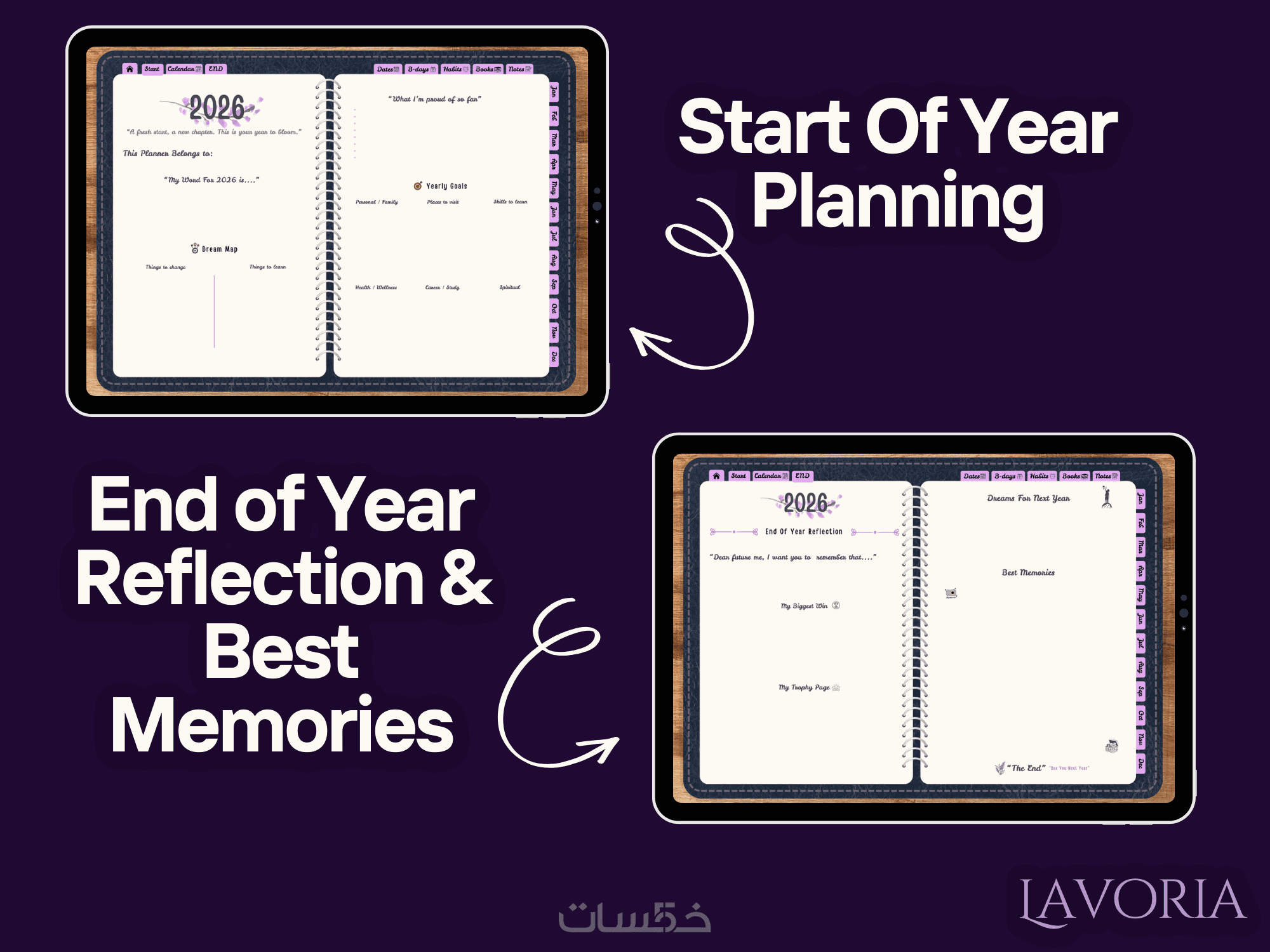 صفحة لتخطيط العام في بدايته وصفحة لختام العام وكتابة أهم الإنجازات التي تم تحقيقها.