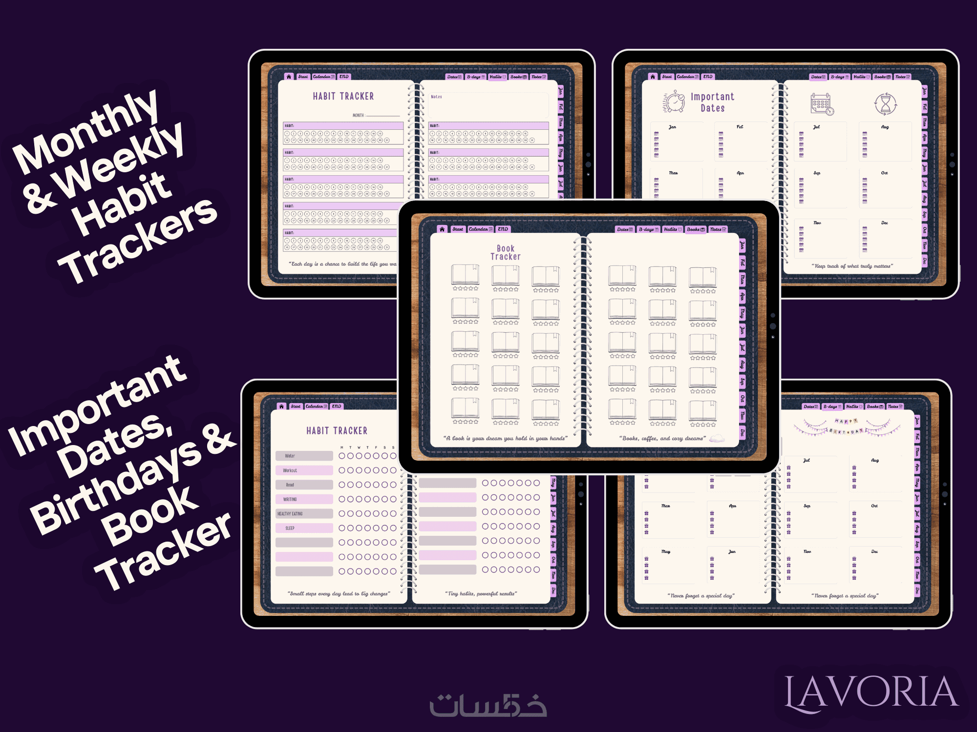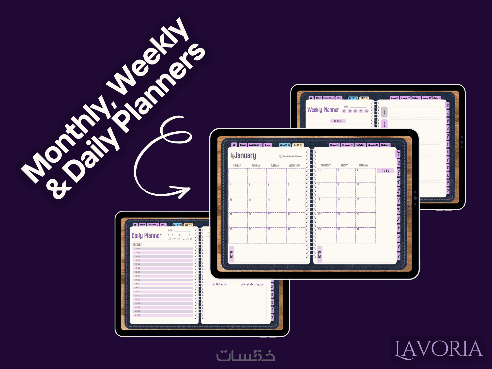 صفحات تخطيط شهرية وأسبوعية ويومية.