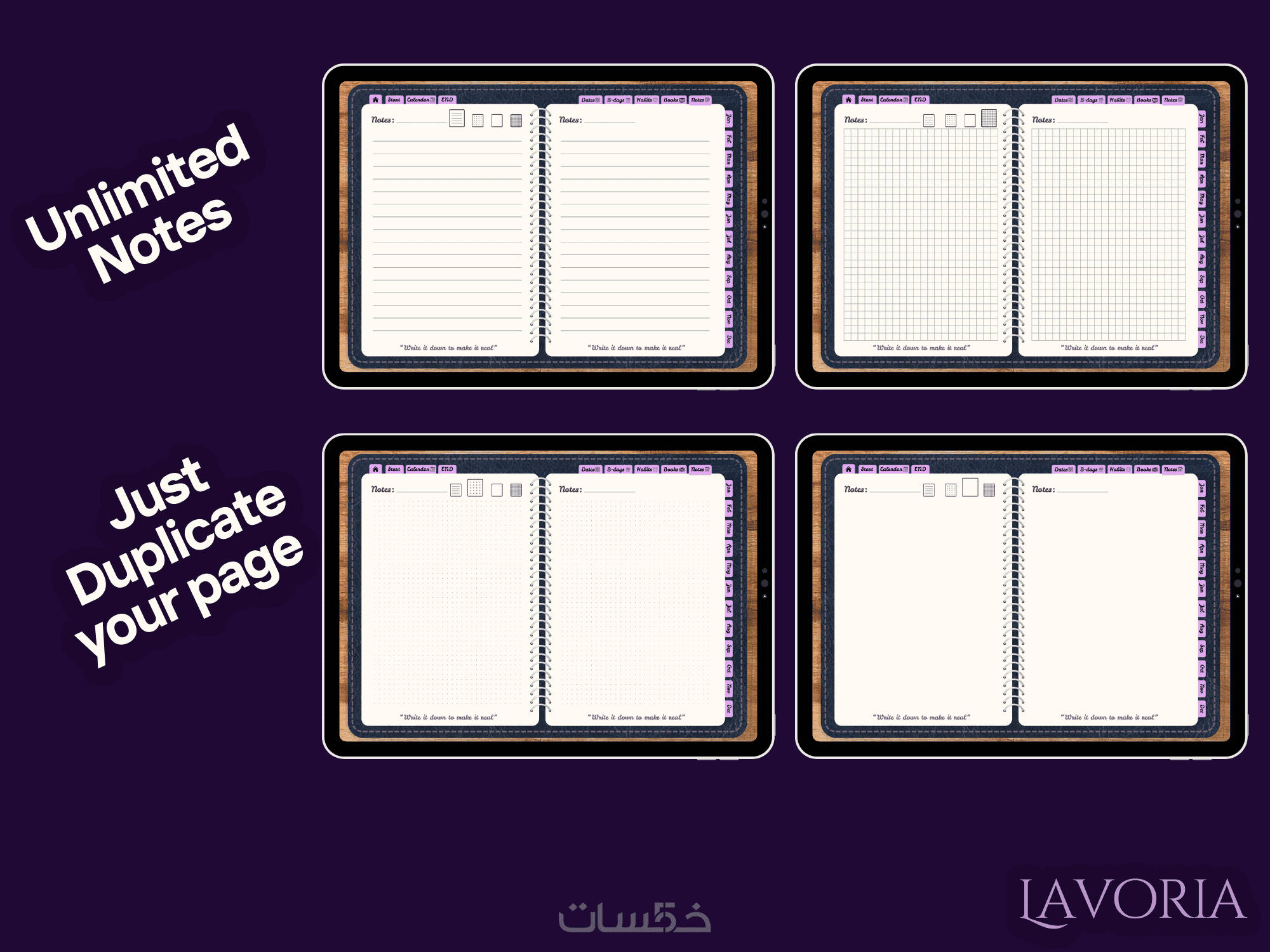 يوجد صفحة تخطيط اسبوعية وصفحة تخطيط يومية لكل شهر قابلة للنسخ في التطبيقات Duplicate page لتكرارها عند كل اسبوع أو يوم جديد في الشهر ويمكنك فعل هذا في أي صفحة ترغب في تكرارها مثل صفحات ال Habit tracker.