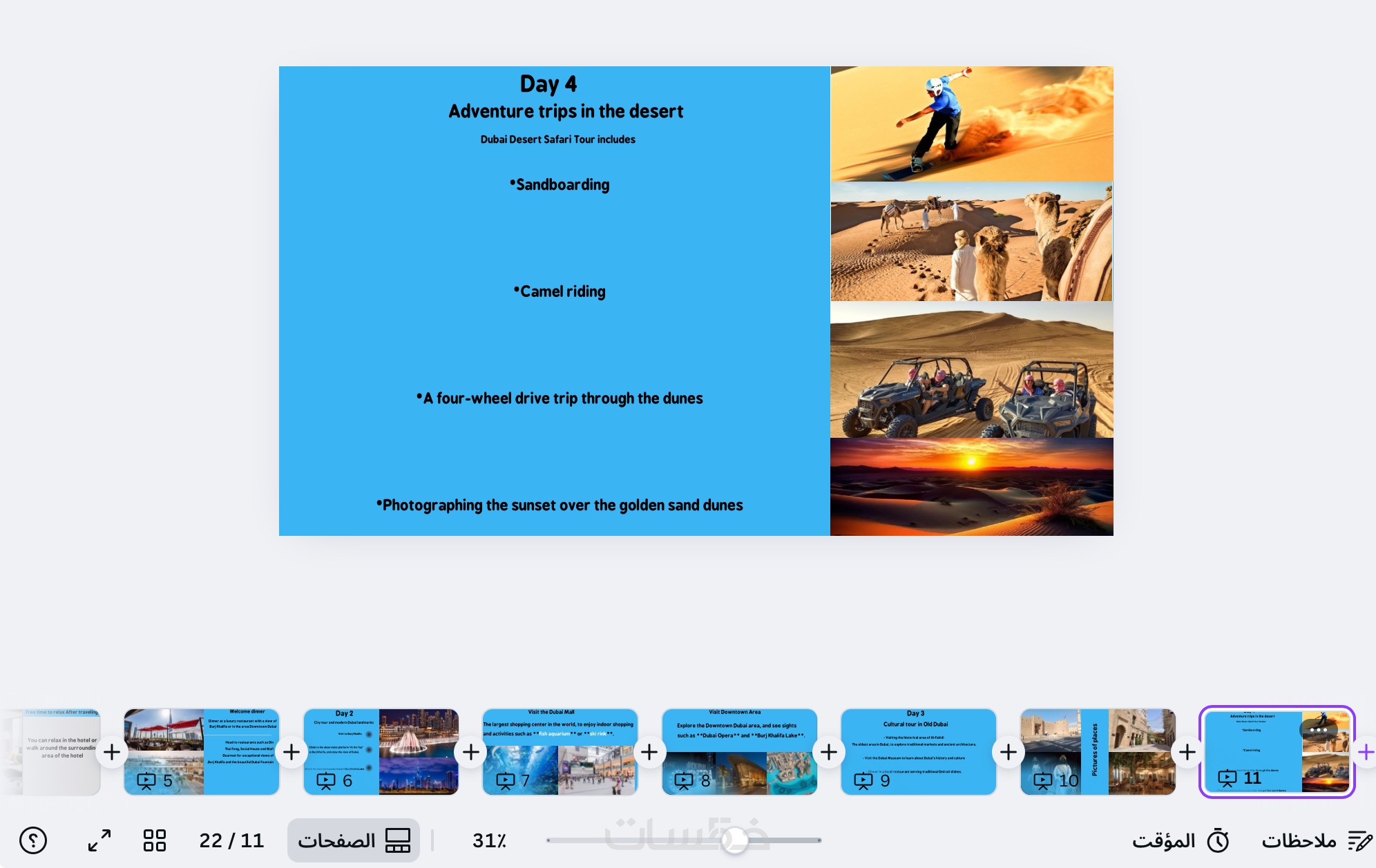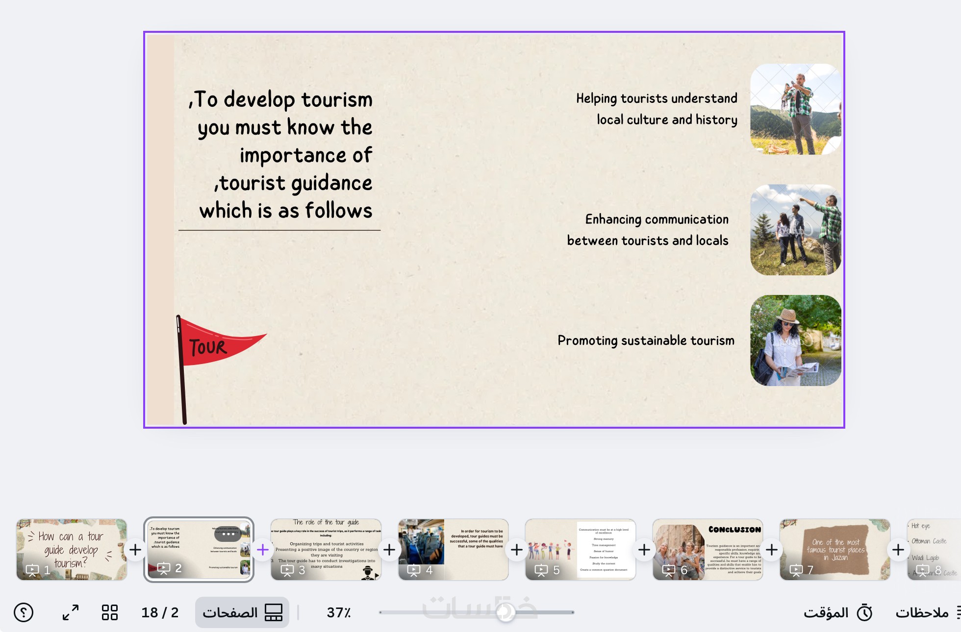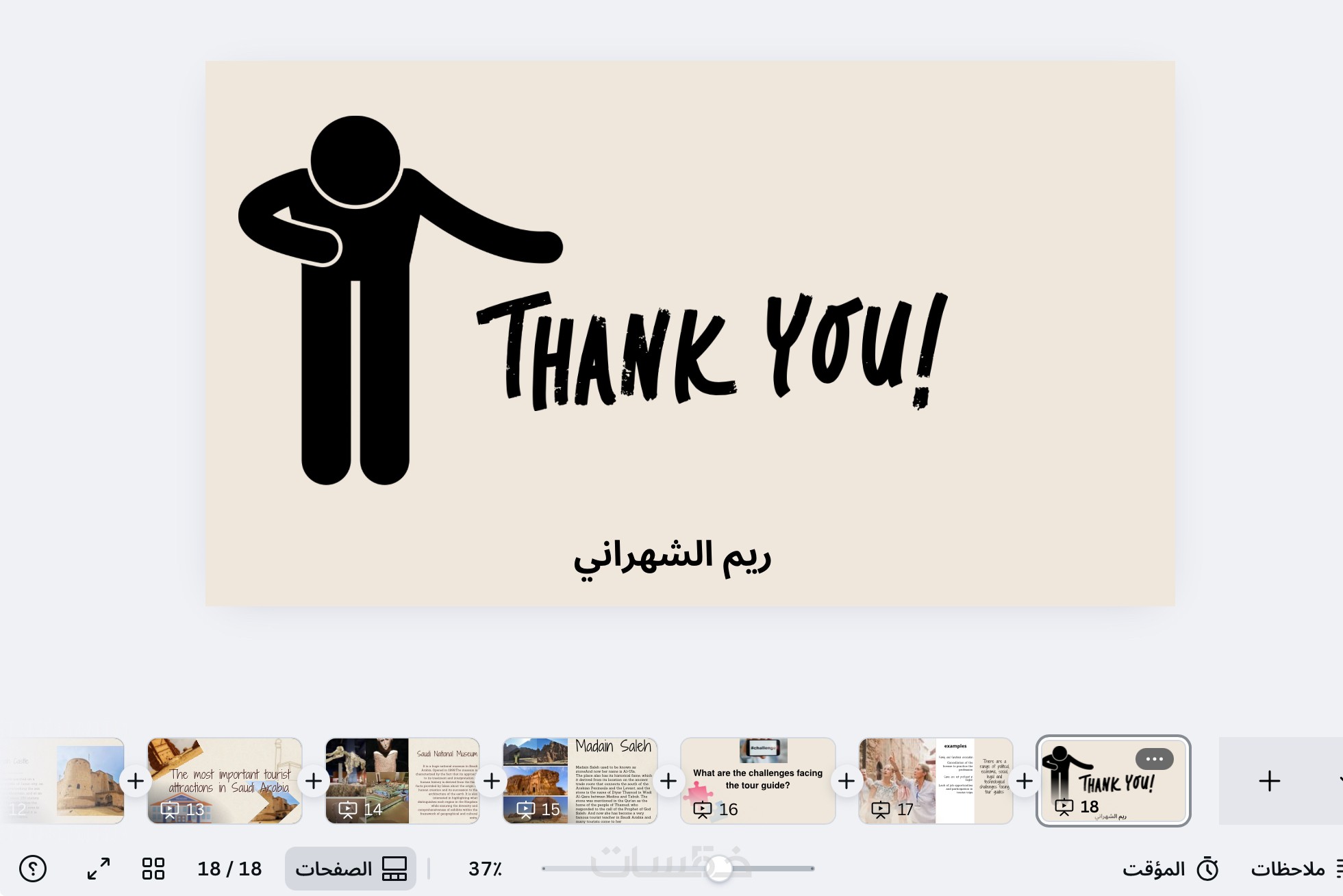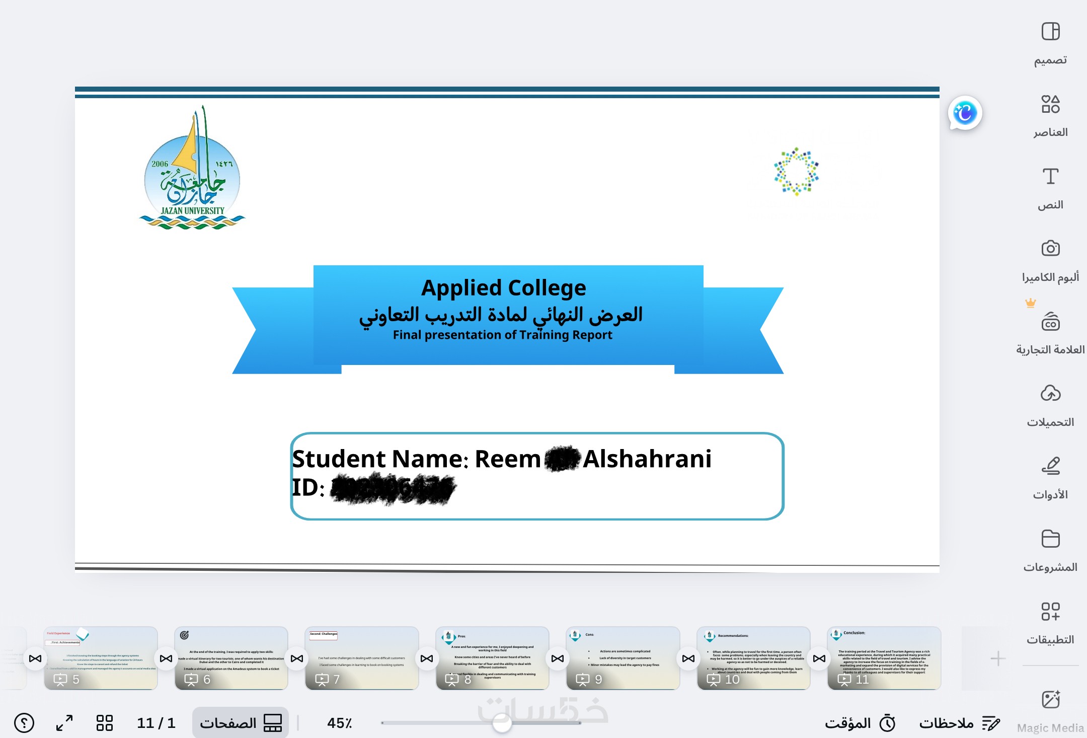 •اهتمام بالتفاصيل الدقيقة في التصميم، من اختيار الألوان والخطوط إلى تنظيم الشرائح والمحتوى بشكل سلس وجميل.