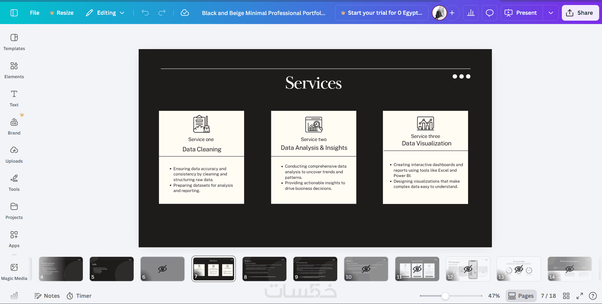 تصميم شرائح حديثة وواضحة وسهلة العرضتنسيق احترافي للألوان والخطوطتنظيم المحتوى بطريقة جذابة ومقنعةعرض تقديمي ب كانفا او باوربوينت حتي 15 صفحة