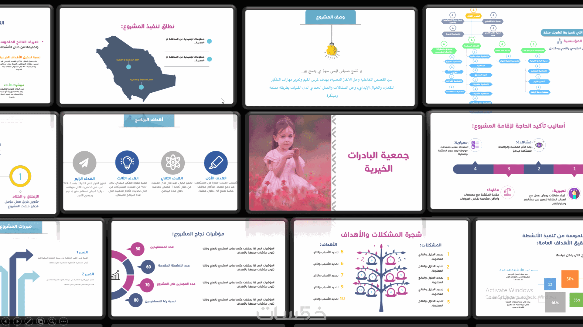 عناصر بصرية عالية الجودة: دمج الصور، الأيقونات، والرسومات التوضيحية بدقة عالية تناسب محتوى العرض.