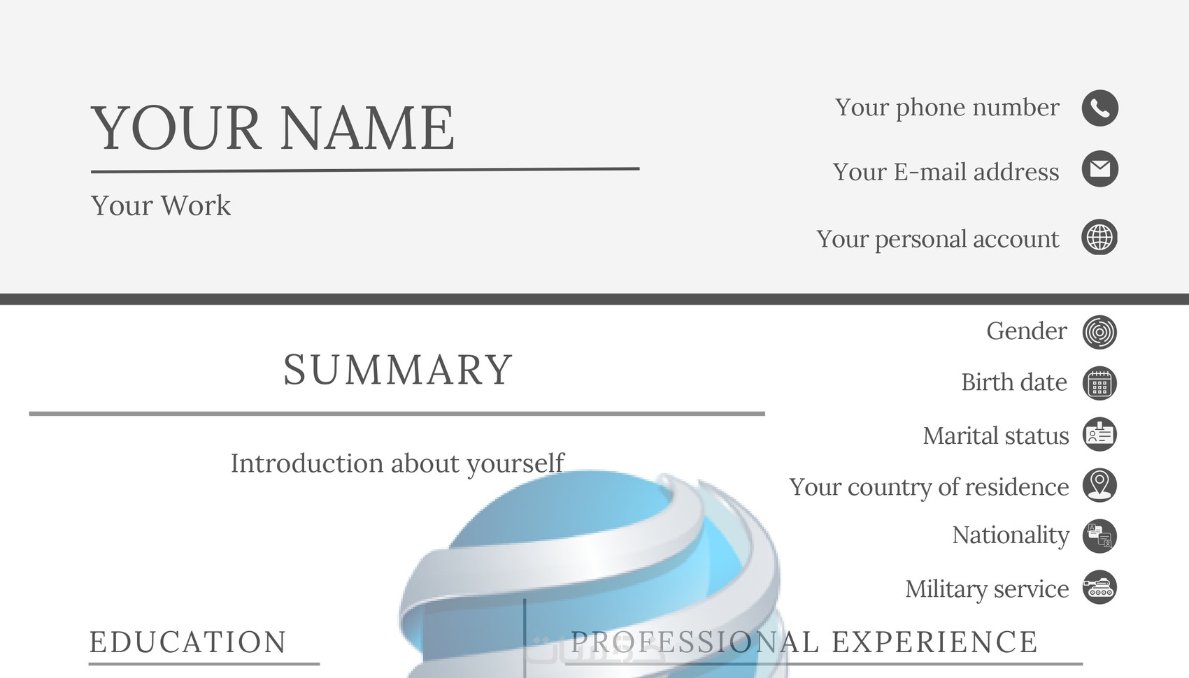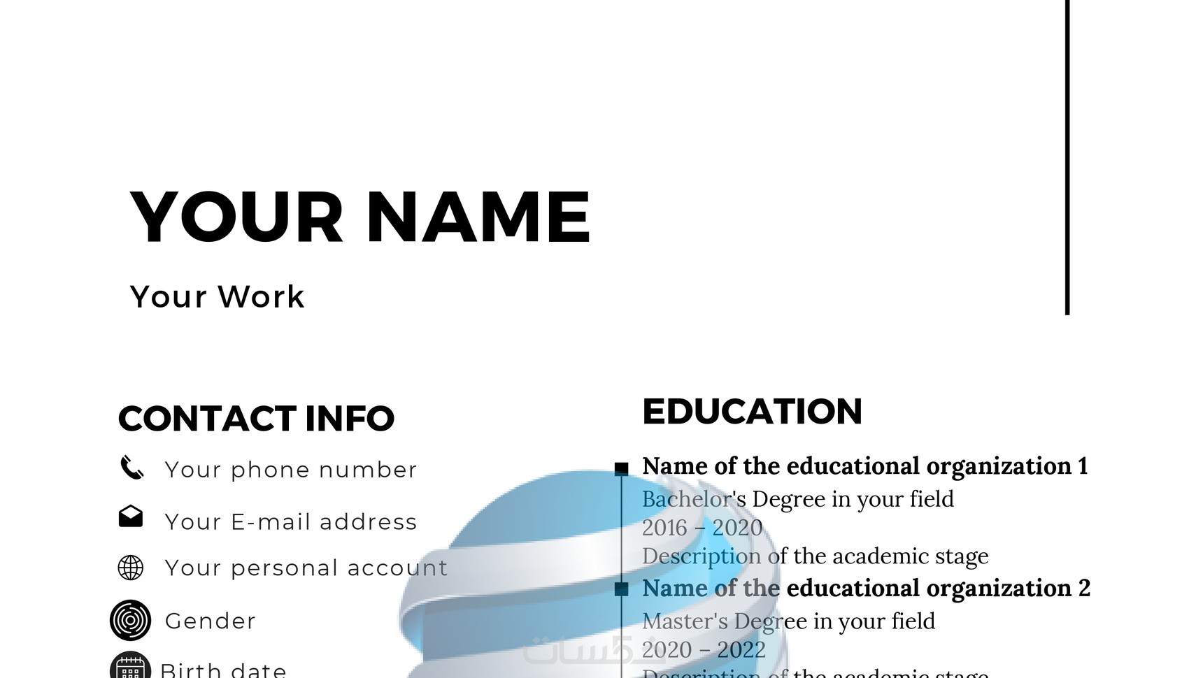 مع خدمتنا، ستحصل على سيرة ذاتية مصممة بشكل احترافي وجذاب، تتضمن تصميمات مسبقة جاهزة تلبي احتياجاتك بكل دقة وأناقة.