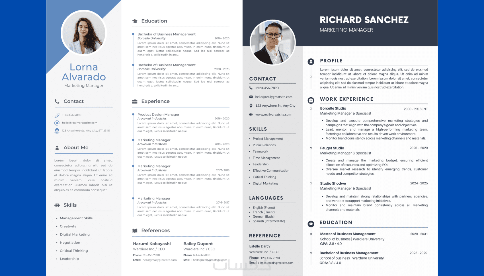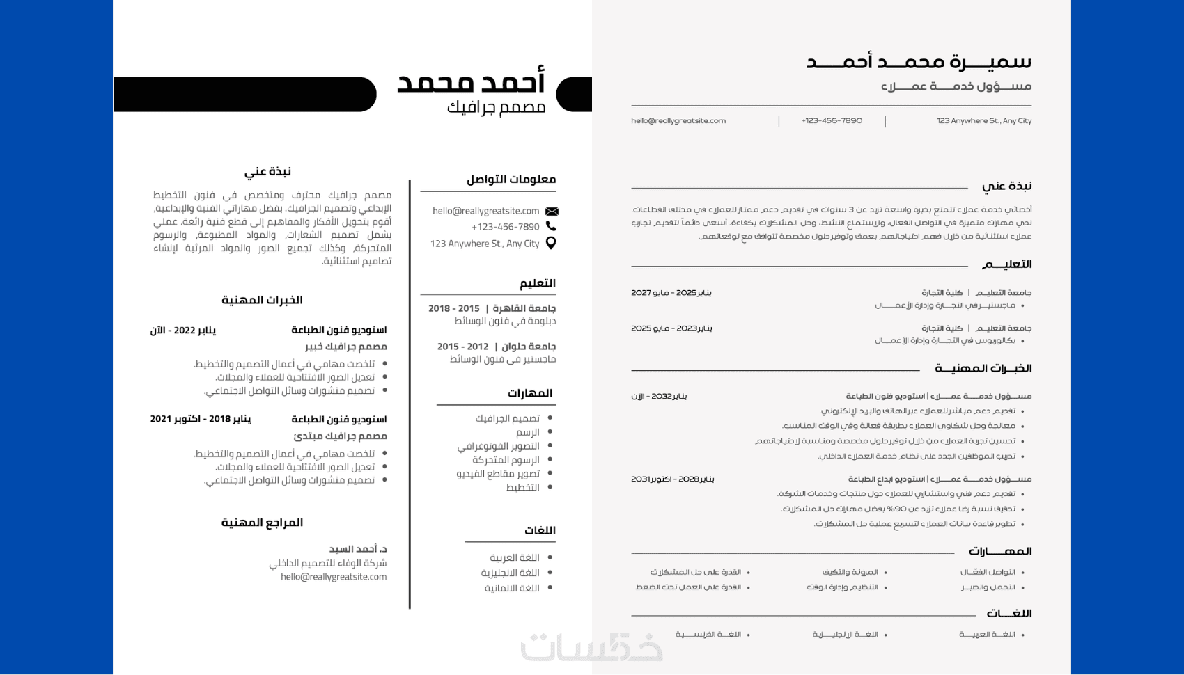 ما يميز خدمتنا هو التركيز على تقديم تصاميم فريدة ومبتكرة تعكس هتعكس خبراتك وتلتقط روحها. فإننا نضمن لك الحصول على سيرة ذاتية عالية الجودة وملفتة للنظر.