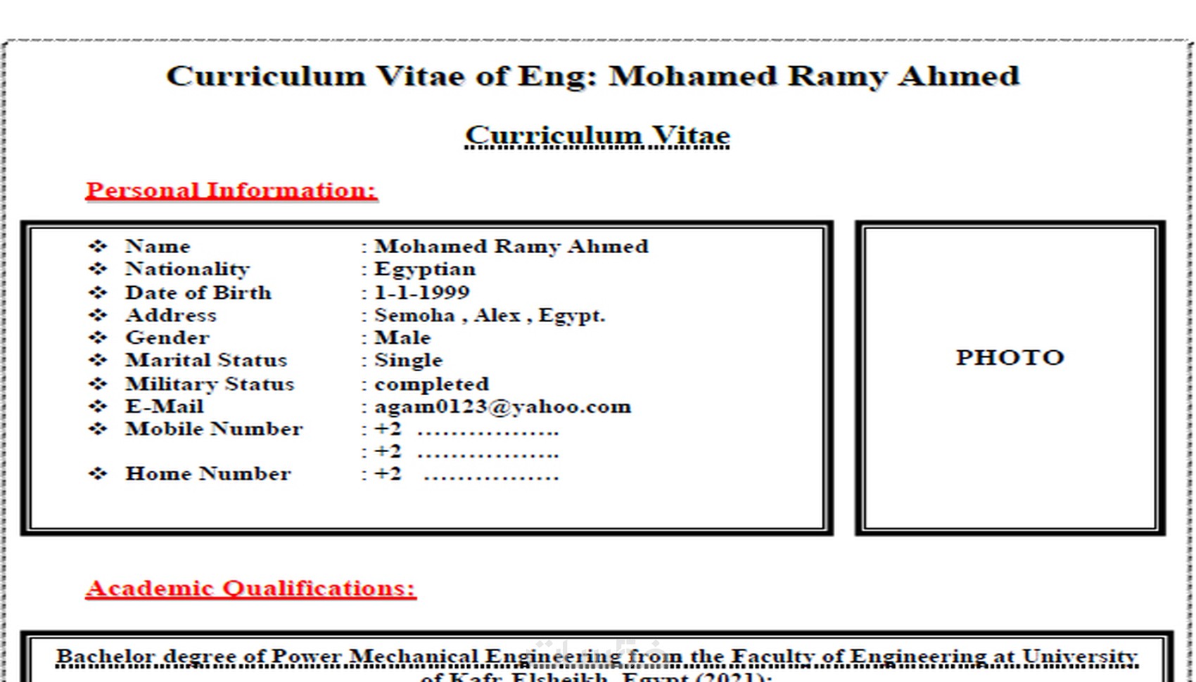 ** طالما حضرتك هنا يبقي اكييد بتدور على وظيفة ومحتاج سيرة ذاتية (CV) بشكل يعبر عنك وعن مؤهلاتك بالمختصر المفيد بحيث تكون سيرة ذاتية جذابة وتلفت انتباه اصحاب العمل وتلخص كل الخبرات والمعلومات الشخصية المطلوب التركيز عليها ليتم ابراز المعلومات التي يبحث عنها اصحاب العمل .