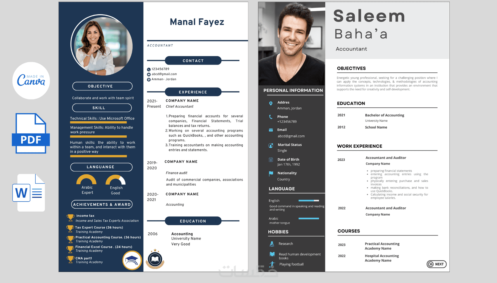 1. تصميم صفحة واحدة من السيرة الذاتية بتصميمين مختلفين، تستطيع اختيار أحدهما (الخيارات فقط للصفحة الاولى من السيرة الذاتية مهما كان عدد صفحاتها)