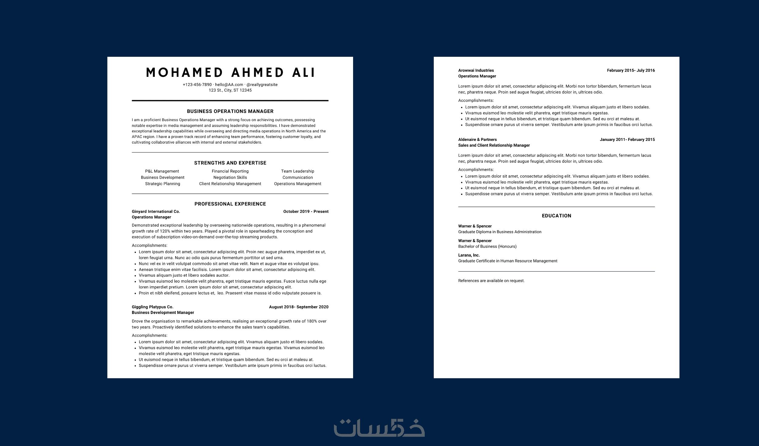 سوف تحصل علي 2سيرة ذاتية نسخة باللغة الأنجليزية ونسخة باللغة العربية كل سيرة ذاتية مكونة من صفحتين مقابل سعر الخدمة