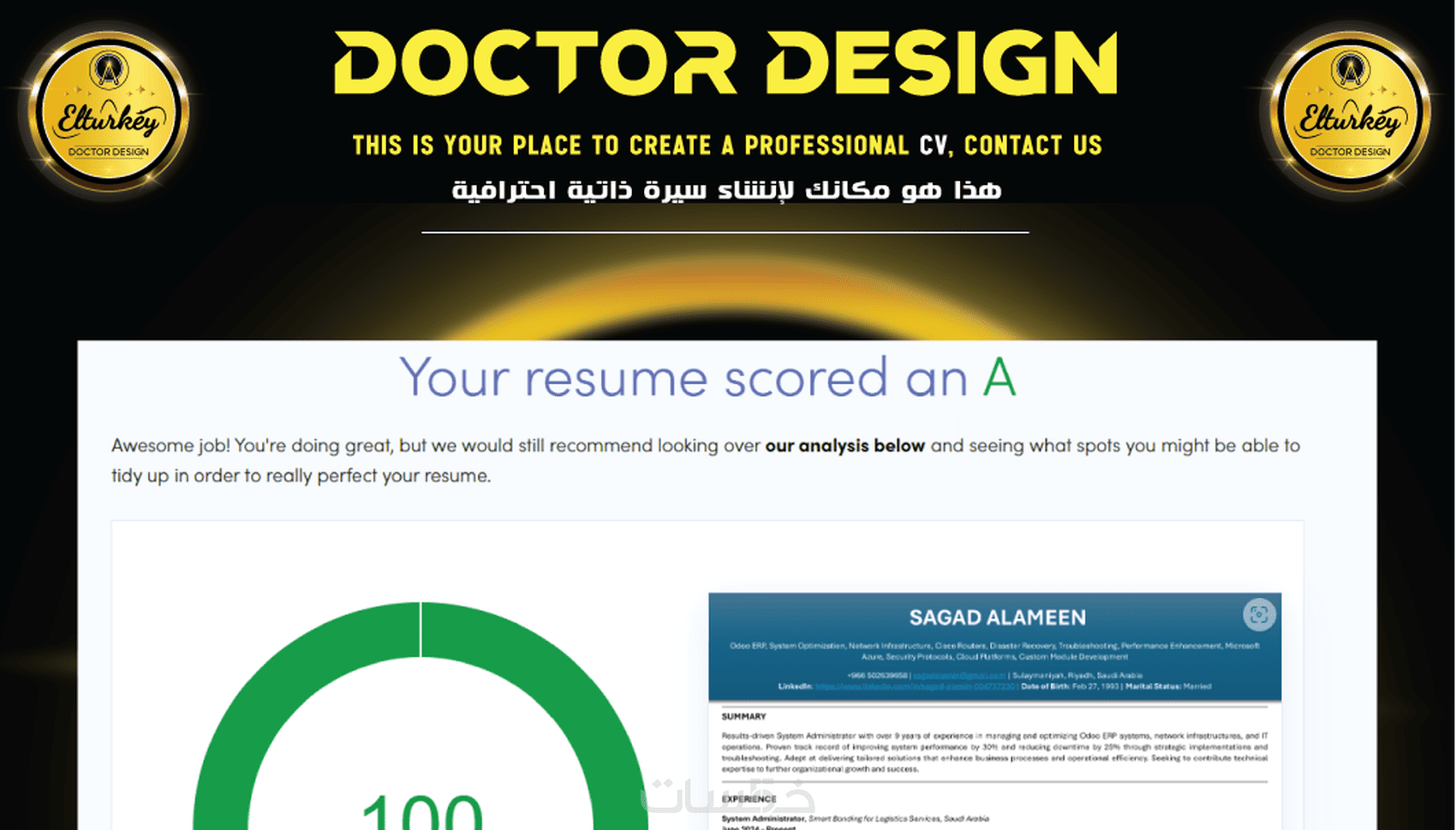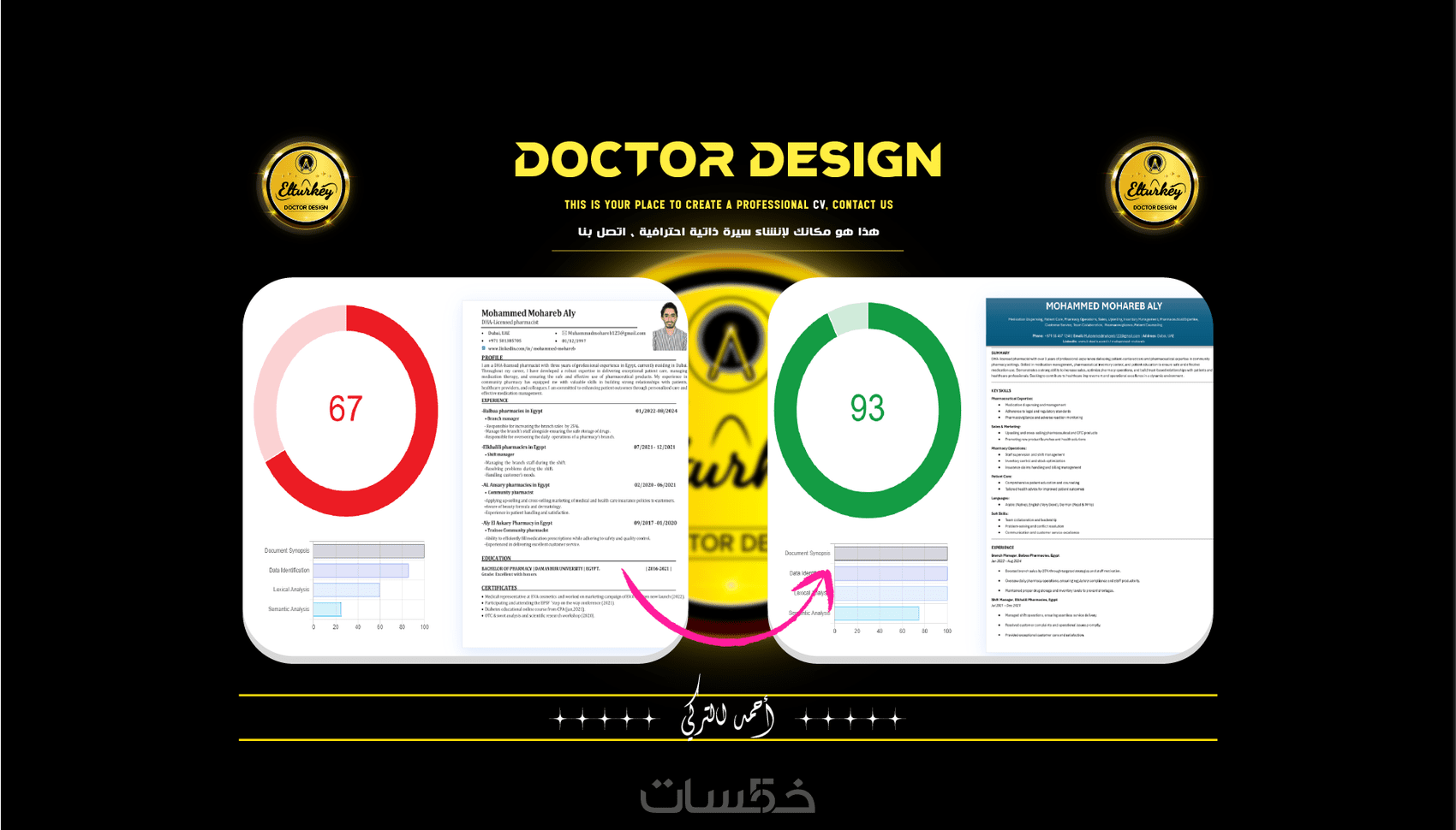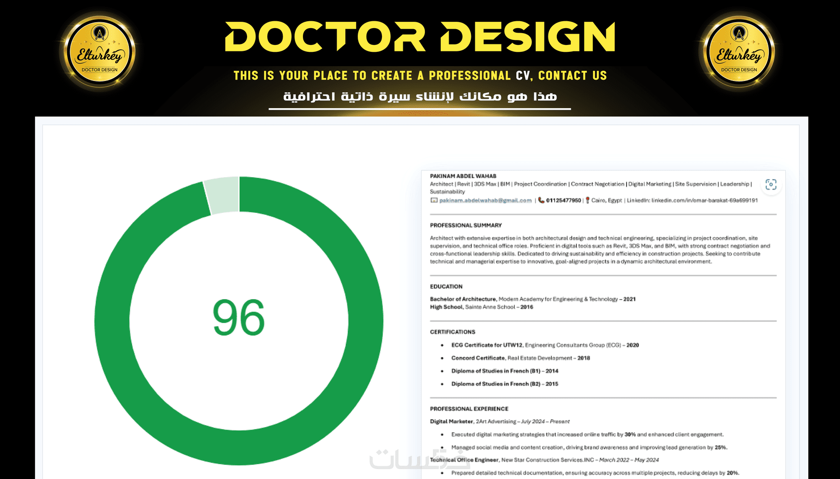 - ستتم كتابة وتصميم السيرة الذاتية بأسلوب يراعي المعايير العالمية ويضمن تجاوز الـ ATS بنسبه تتخط ال 85% ا(نظام تعقّب مقدمي الطلبات).