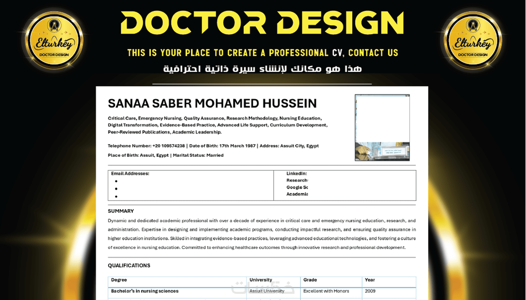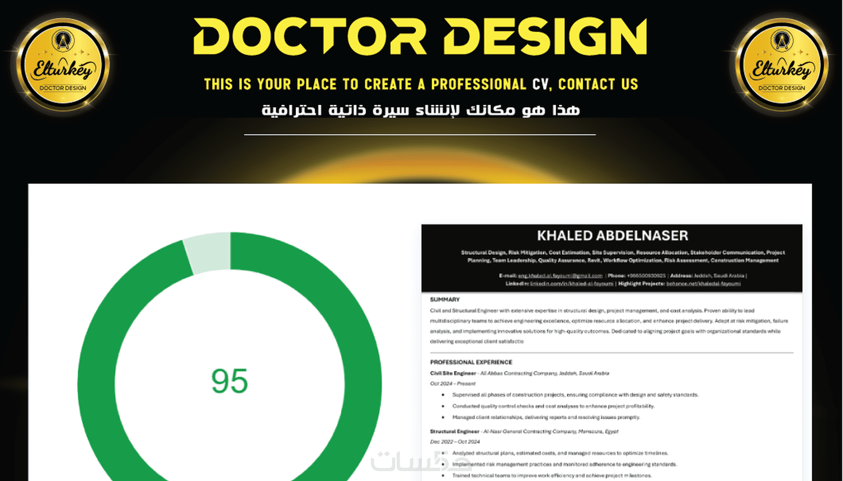 ◄ مقدم الخدمة دكتور ومترجم ومصمم جرافك وصانع محتوي "This is your place to create a professional CV"، وهدفه الرئيسي هو تحقيق قبولك في وظائفك القادمة بإذن الله عز وجل.