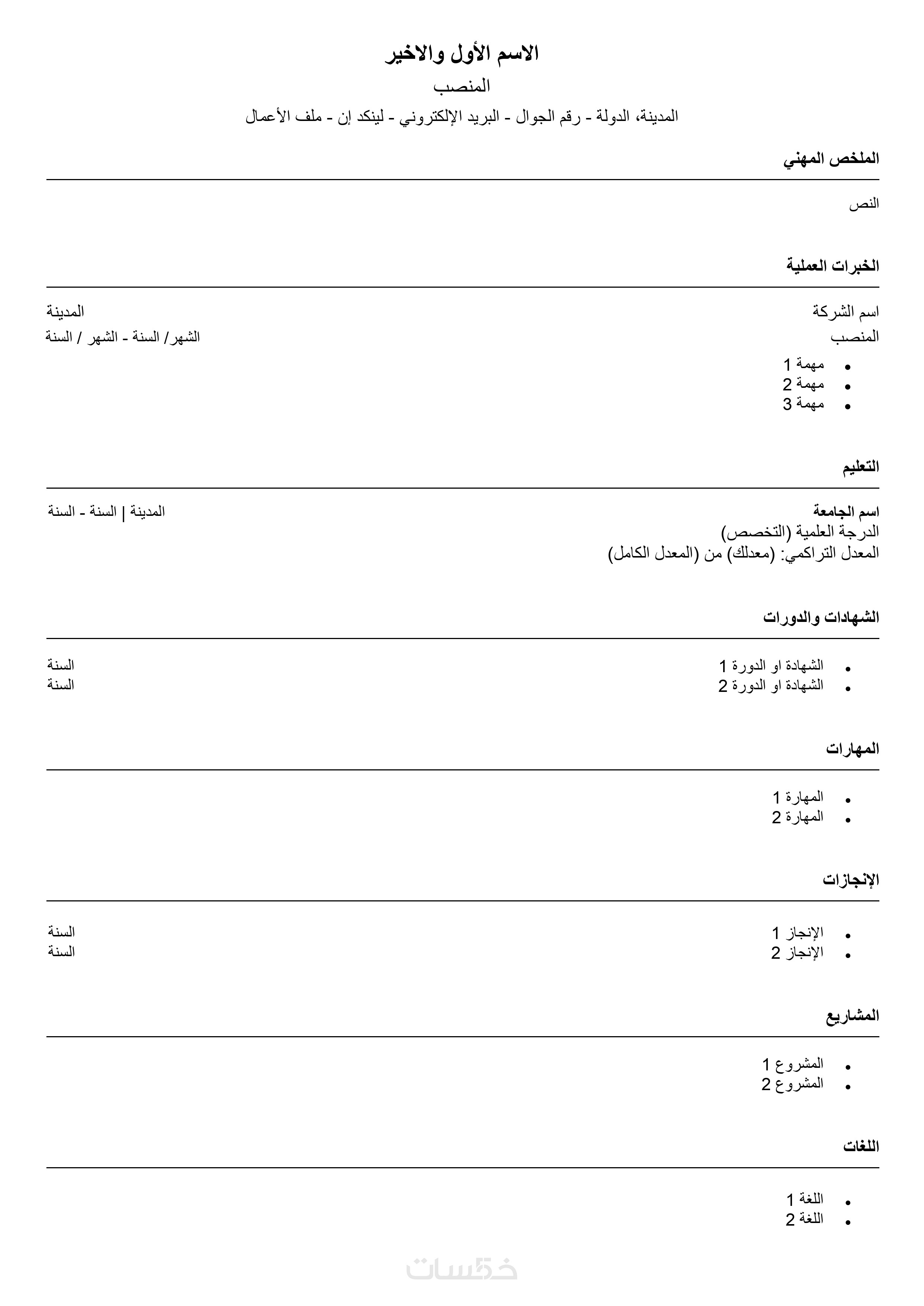 • قالب فارغ وجاهزة للتعبئة ببياناتك الشخصية وخبراتك المهنية.