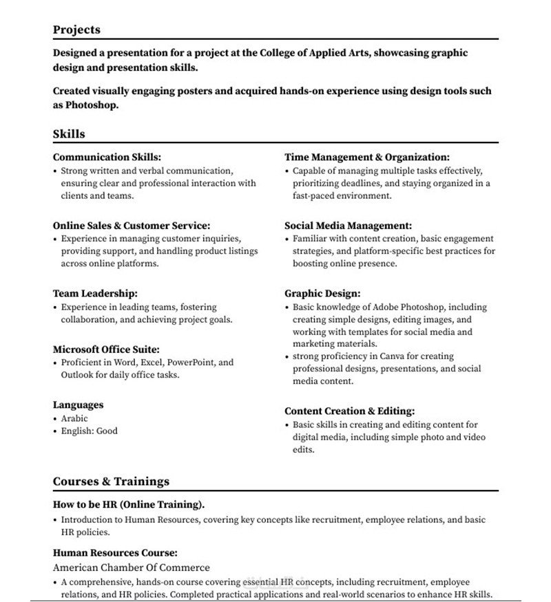 من خلال خدمتي سأقوم بإعداد سيرة ذاتية احترافية مكتوبة بأسلوب متميز، ومتوافقة مع أنظمة التوظيف الذكية (ATS) لضمان قراءتها من قِبل الشركات، وزيادة فرص ظهورك في نتائج البحث.