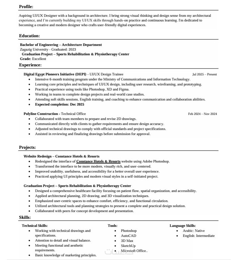 السيرة الذاتية تُقدَّم بلغة واحدة فقط من اختيارك (عربية أو إنجليزية) لضمان وضوحها واحترافيتها.