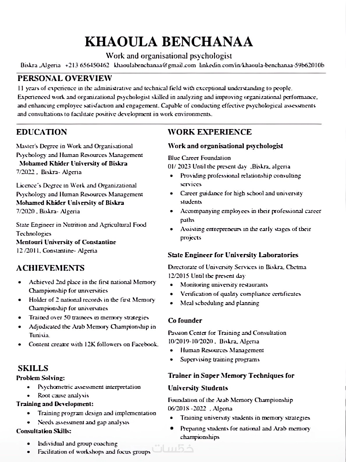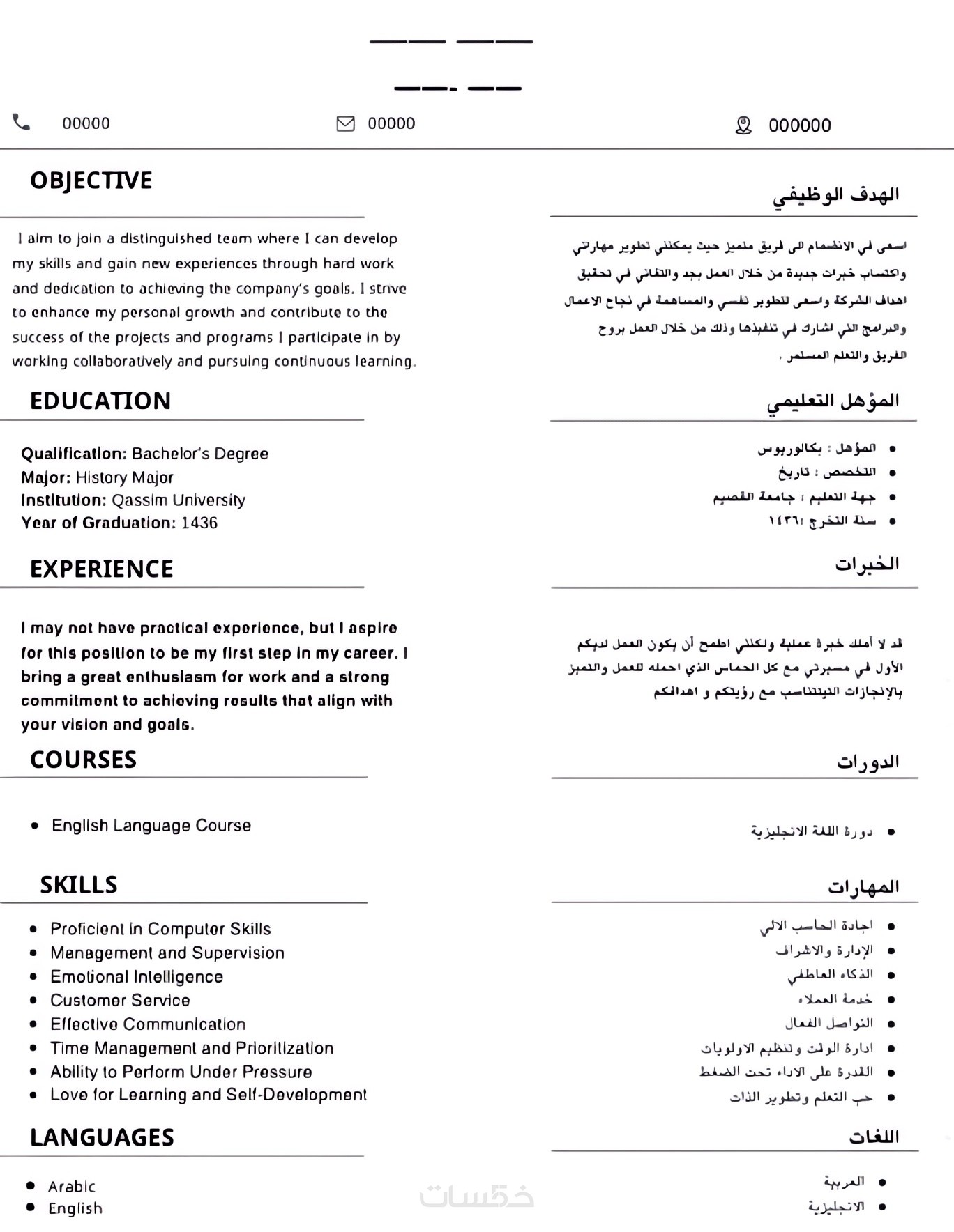 • تصميم سيرة ذاتية بلغة واحدة: العربية أو الإنجليزية او الفرنسية (بحد أقصى 400 كلمة).