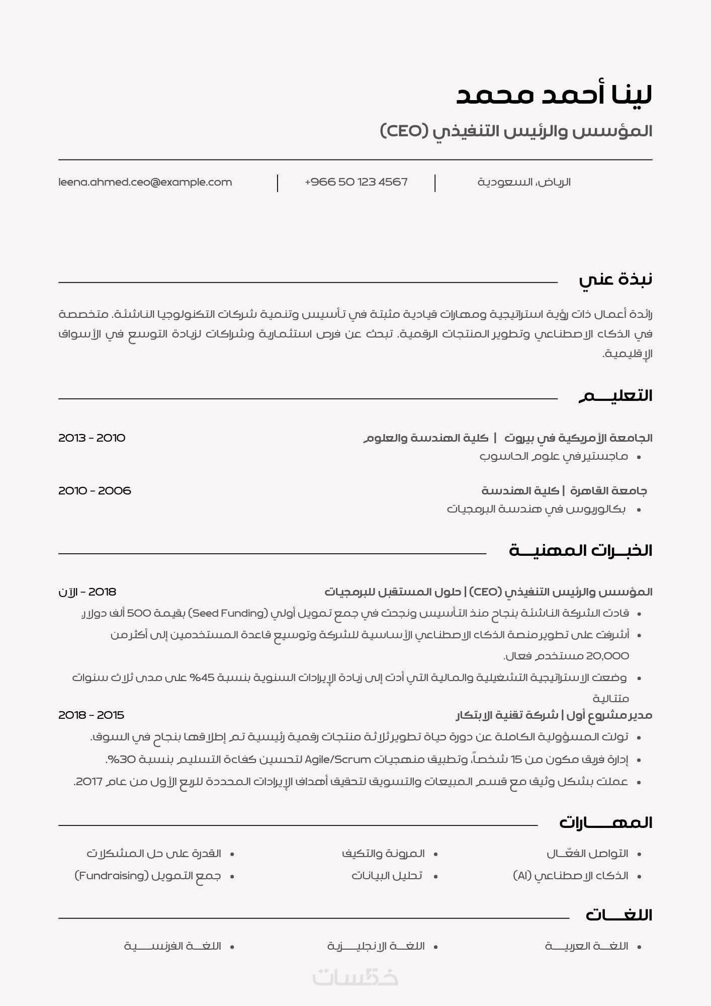 تنسيق احترافي ونظيف يسهل قراءة المعلومات الرئيسية ويجعل سيرتك تبرز بصريًا.