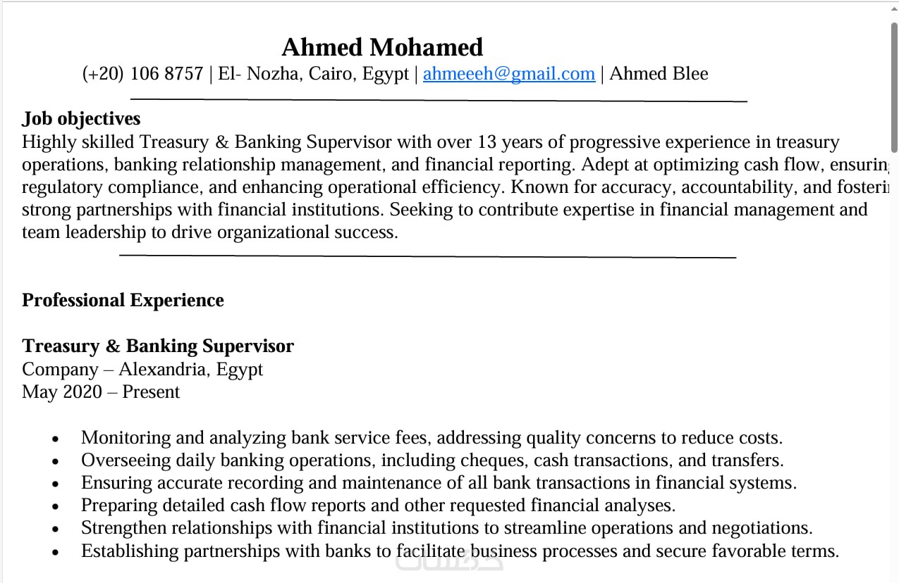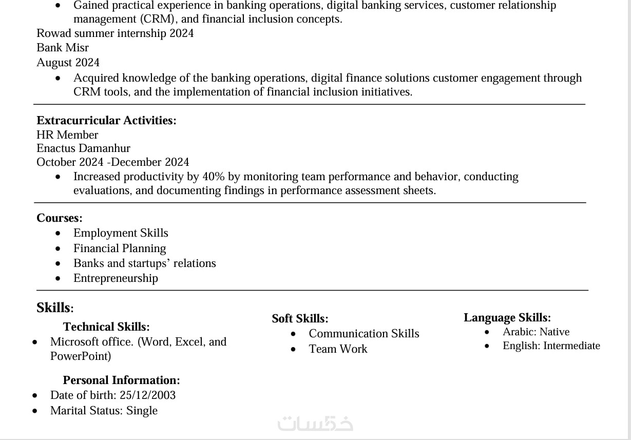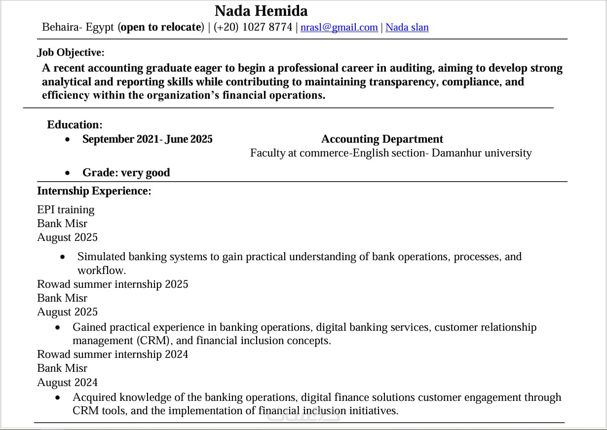 سأقوم بإعداد سيرتك الذاتية من الصفر باللغة الانجليزية أو العربية كما تتطلب وظيفتك، أو تطوير الحالية لتظهر بشكل منظم، احترافي، ومتناسق مع مجالك الوظيفي.