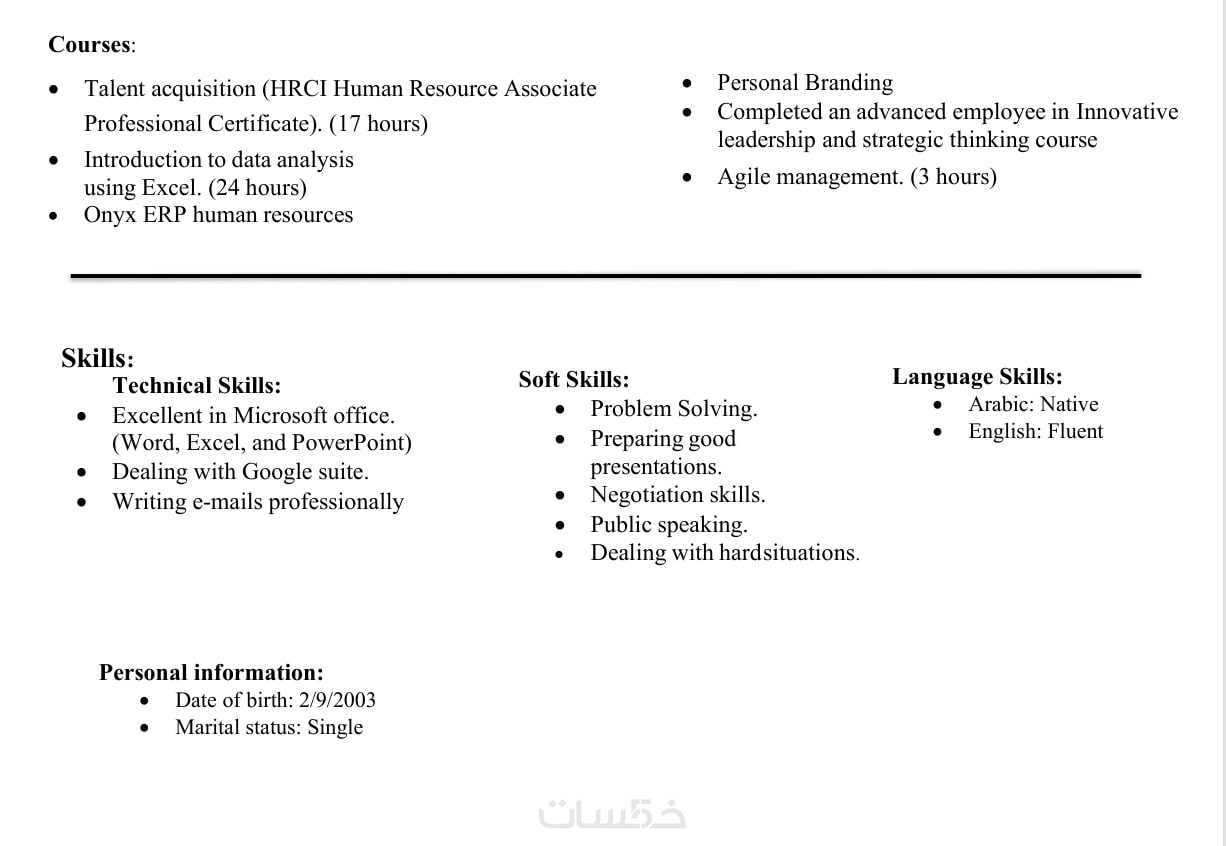 المهارات الشخصية والتقنية (سواء مهارات صلبة Hard Skills أو ناعمة Soft Skills).