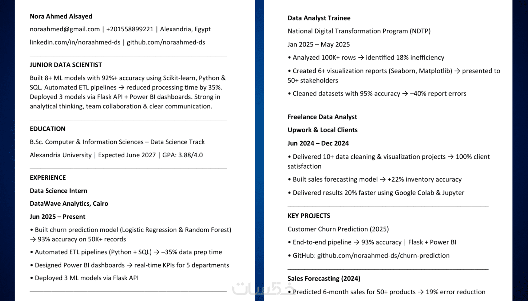 إذا كنت تبحث عن سيرة ذاتية تجمع خبراتك العملية والتعليمية بشكل منظم وجذاب، ومتوافقة مع نظام ATS بنسبة 100٪ لضمان وصولها بأمان لمسؤولي التوظيف، فقد وصلت إلى المكان الصحيح.