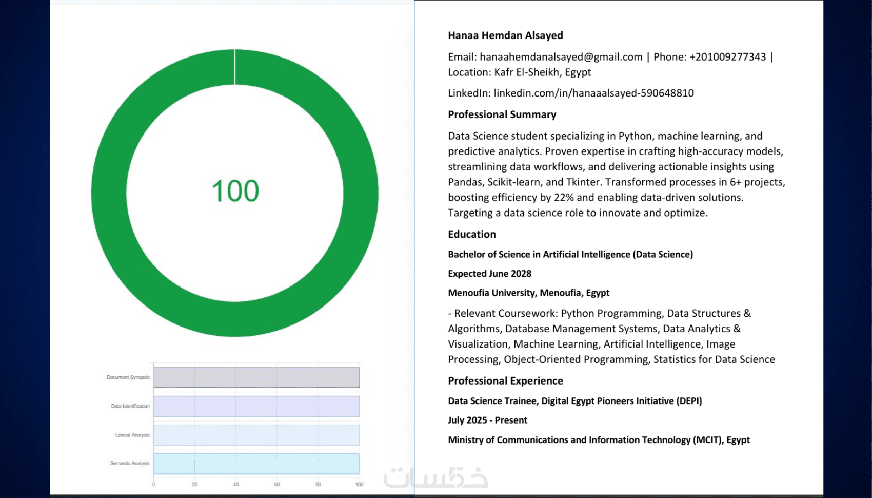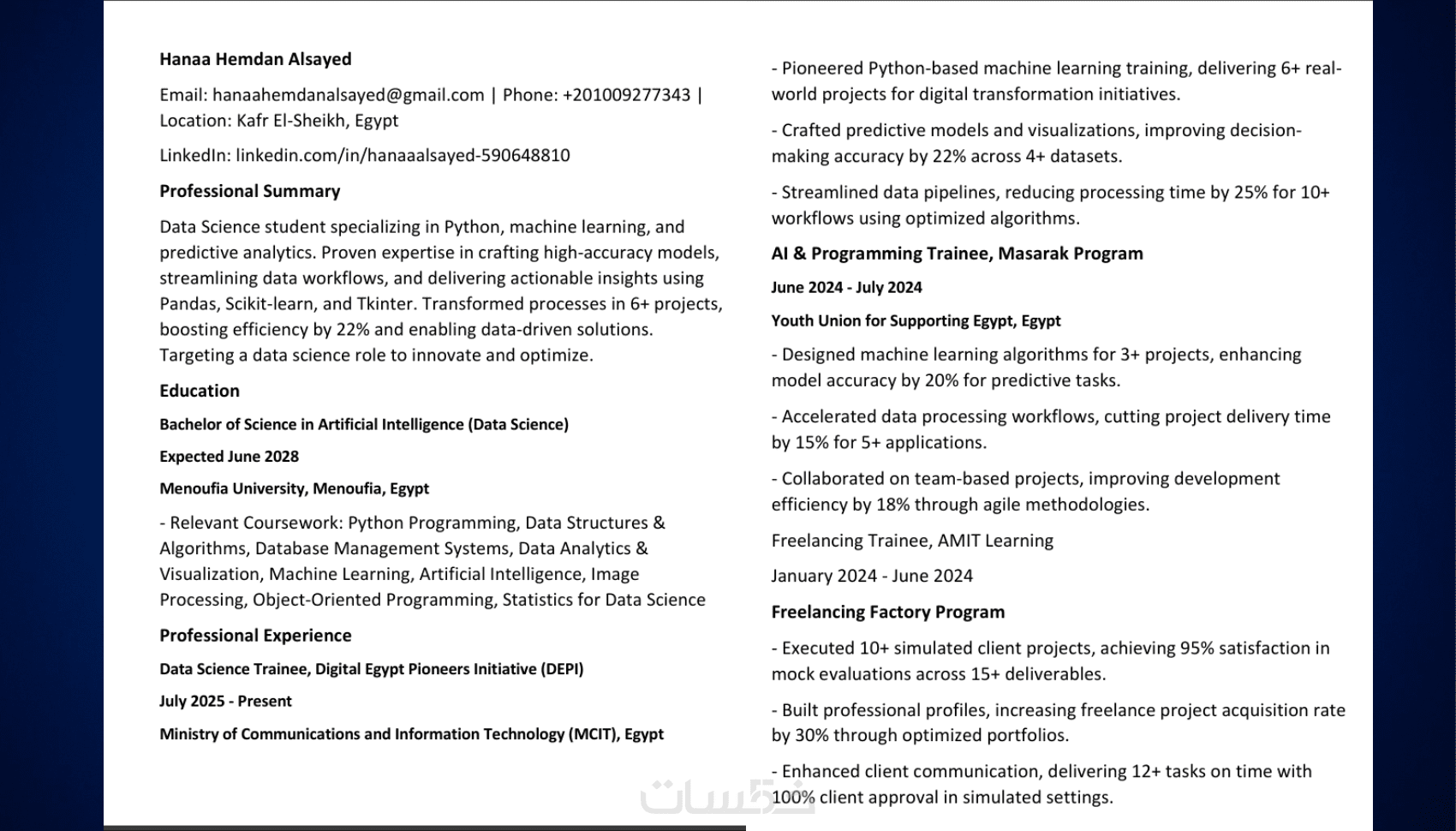 مرحباً بك، أنا هناء حمدان، مهندسة ذكاء اصطناعي وعالمة بيانات، ومتخصصة في كتابة وتصميم السير الذاتية الاحترافية.