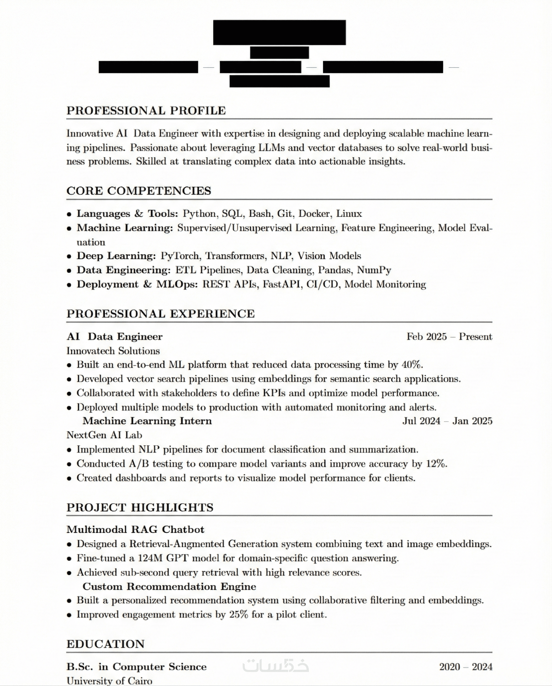 مرحبًا بك، أقدّم خدمة احترافية لإعداد سيرة ذاتية (CV) قوية وموجّهة لسوق العمل، تساعدك على زيادة فرص الحصول على مقابلات عمل حقيقية. هذه الخدمة لا تقتصر على التصميم فقط، بل تركز على إبراز خبراتك ومهاراتك بطريقة احترافية تتوافق مع ما يبحث عنه أصحاب العمل.