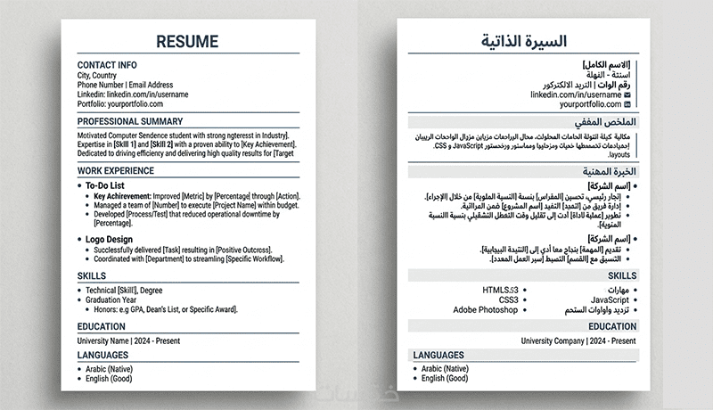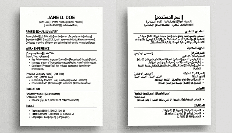 إعداد سيرة ذاتية احترافية بأي من اللغتين أو باللغتين معًا، بصياغة دقيقة ومناسبة لسوق العمل المستهدف.