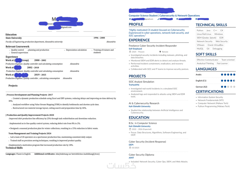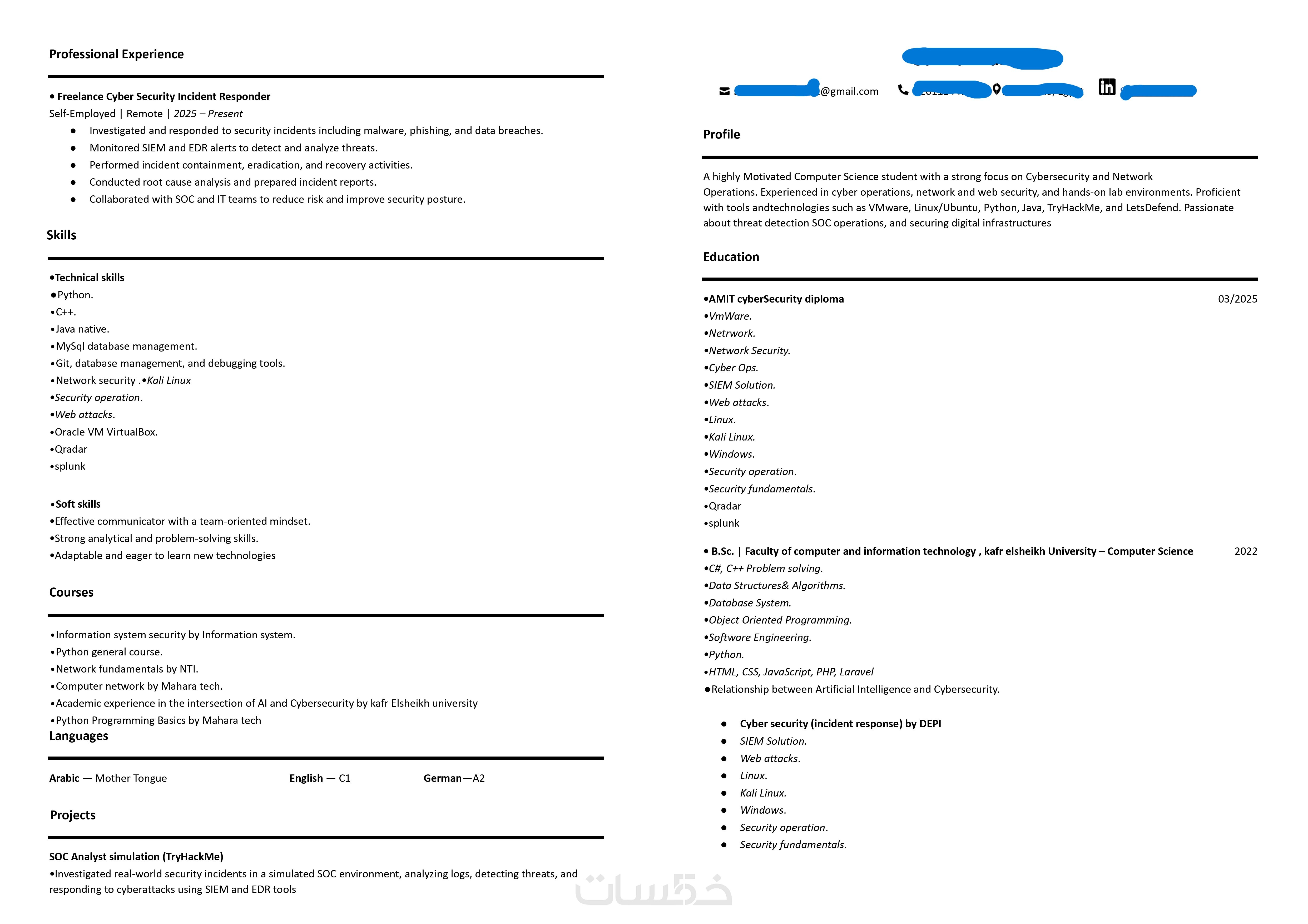 السلام عليكم، أنا سلمى – مهندسة أمن سيبراني ومتخصصة في إعداد السير الذاتية الاحترافية.