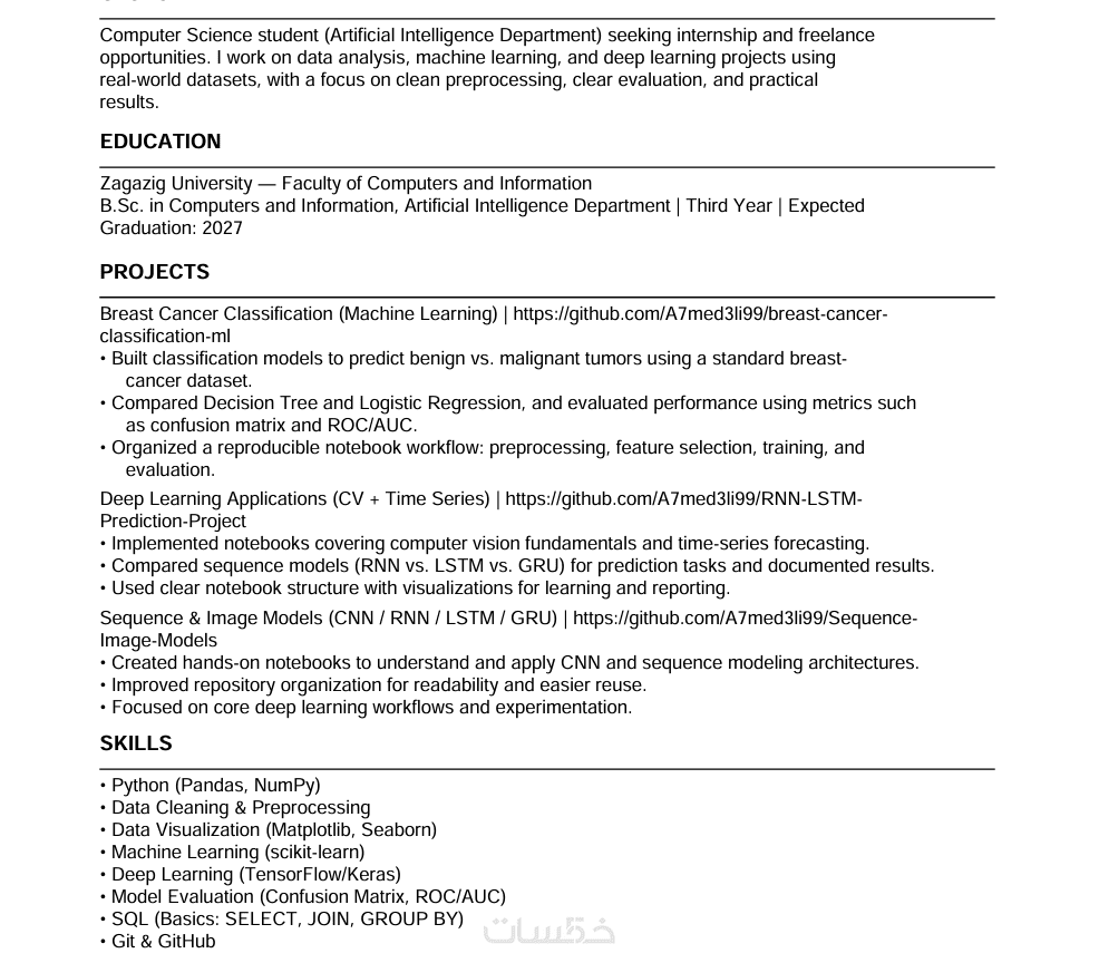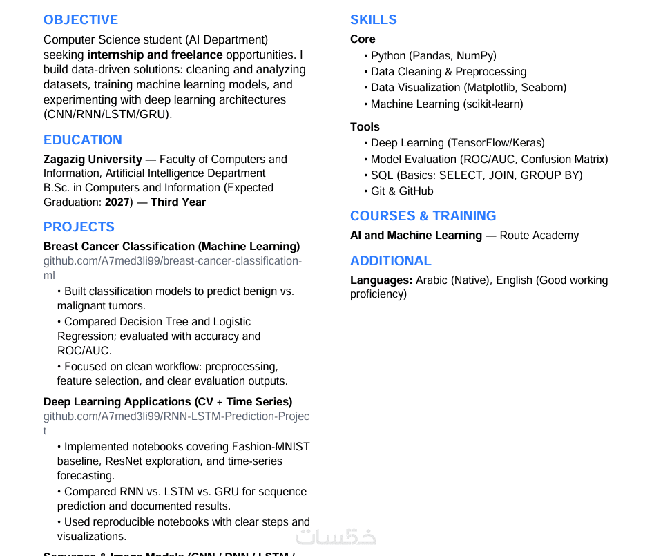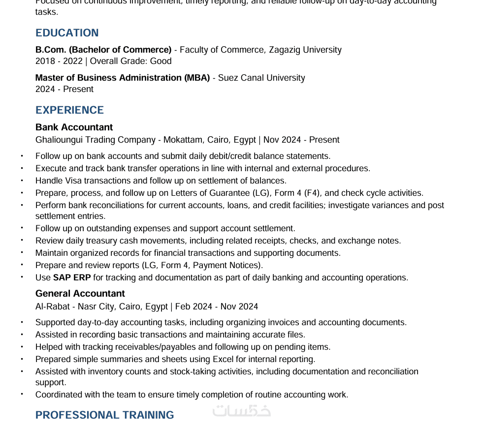 أحرص على تنسيق المحتوى واختيار تصميم نظيف وسهل القراءة، مع الالتزام بمعايير أنظمة التوظيف (ATS) لضمان ظهور سيرتك الذاتية بشكل صحيح عند التقديم.