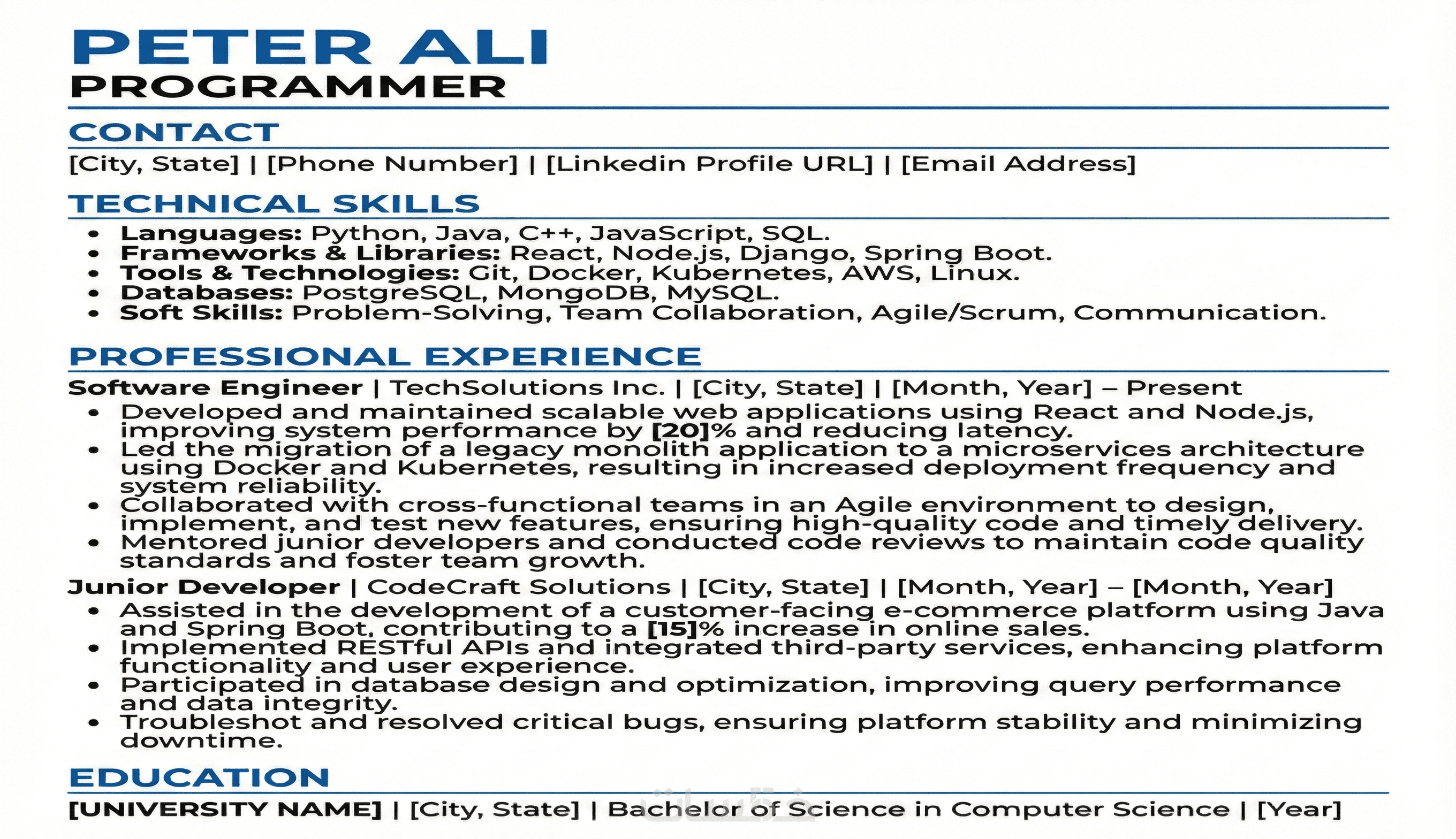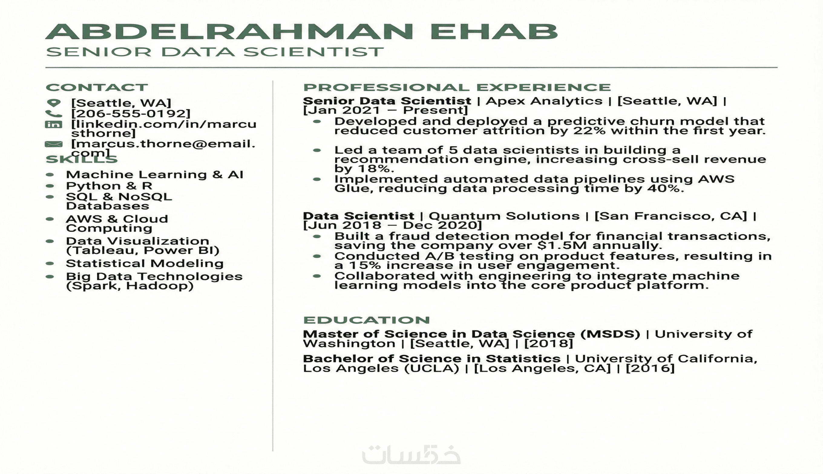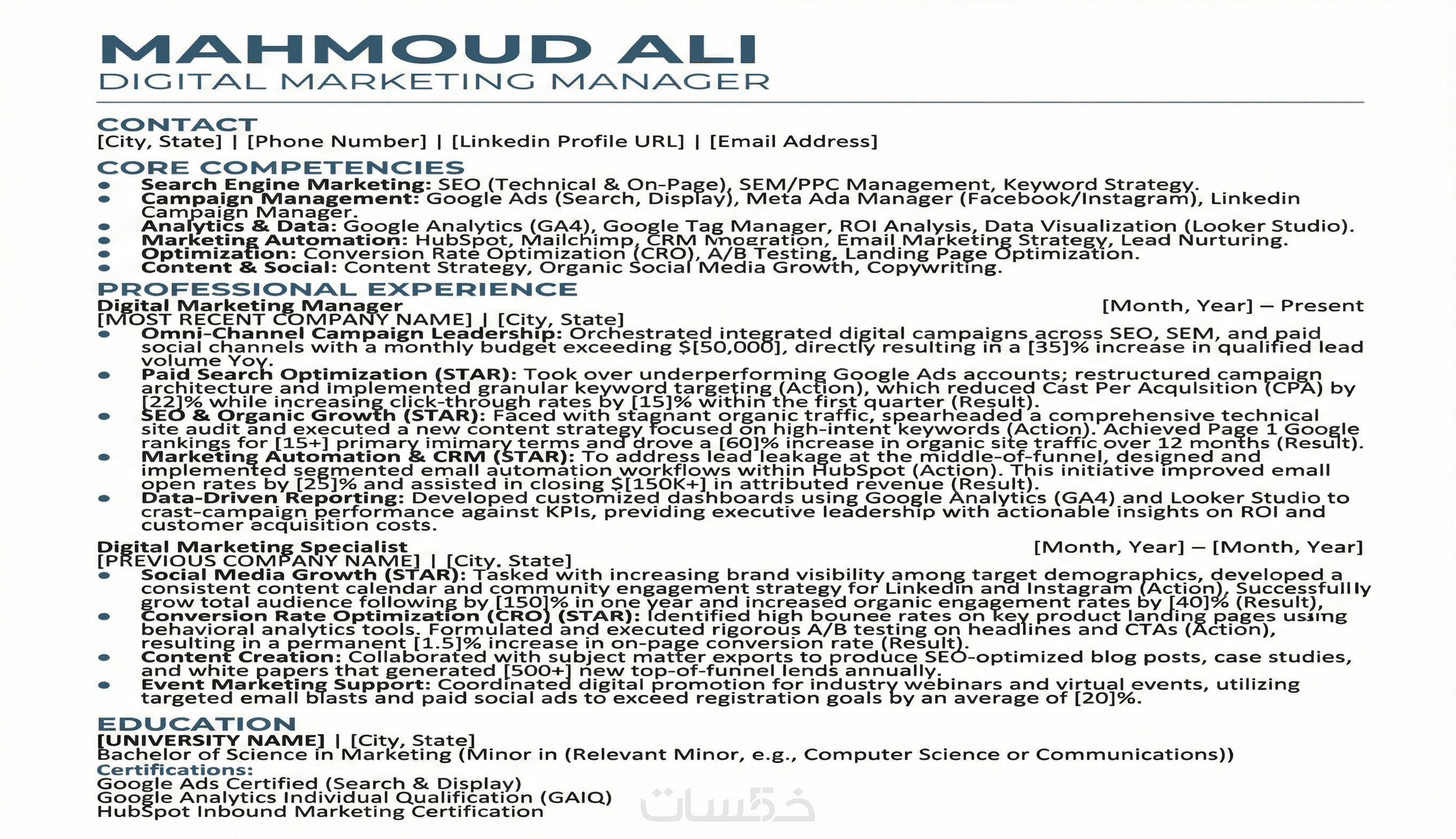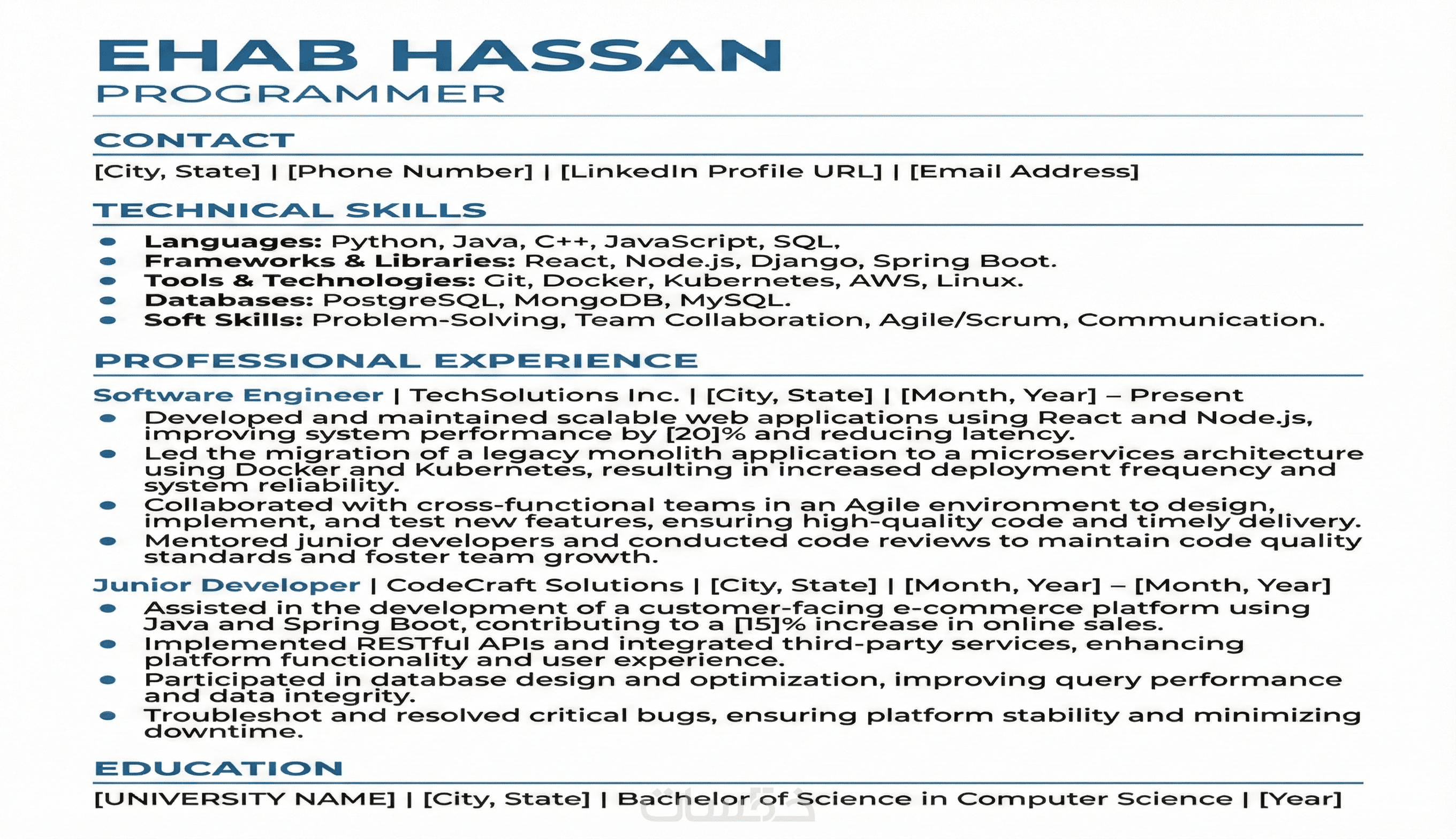 تصميم عصري واحترافي يريح عين مسؤول التوظيف (HR) عند قراءته، وفي نفس الوقت يحتفظ بالبنية البرمجية البسيطة التي تتطلبها أنظمة التتبع.
