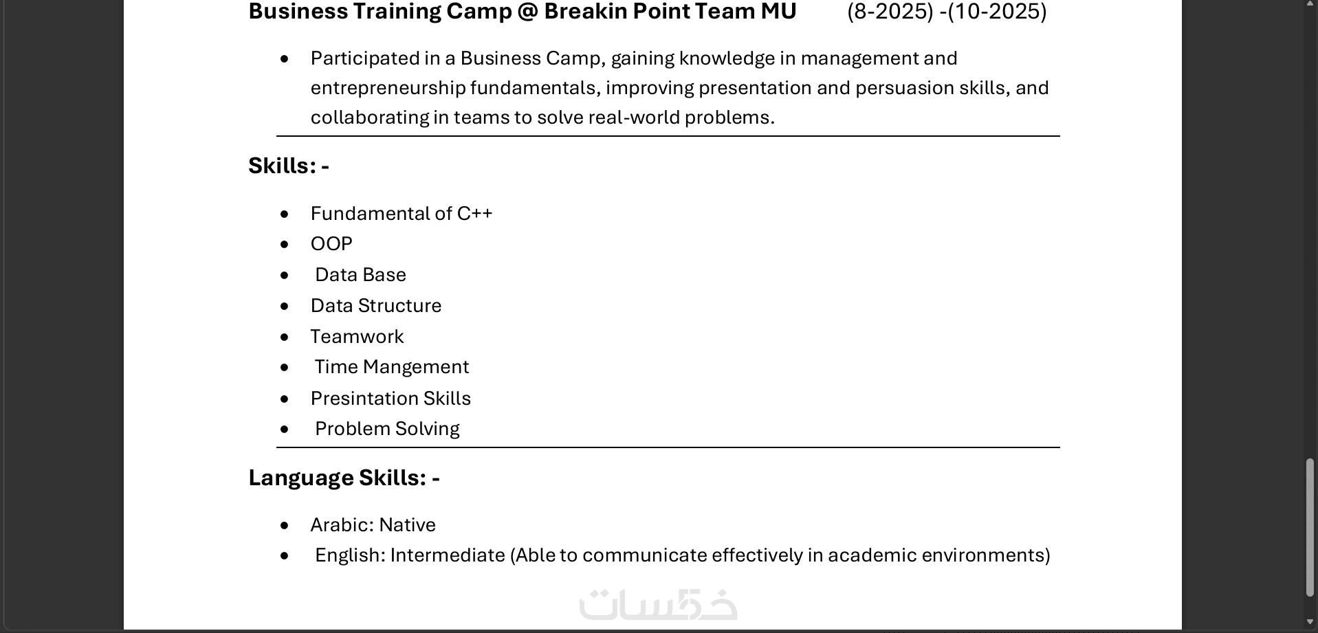 اللغة: كتابة وتنسيق السيرة الذاتية بلغة واحدة فقط إما العربية أو الإنجليزية