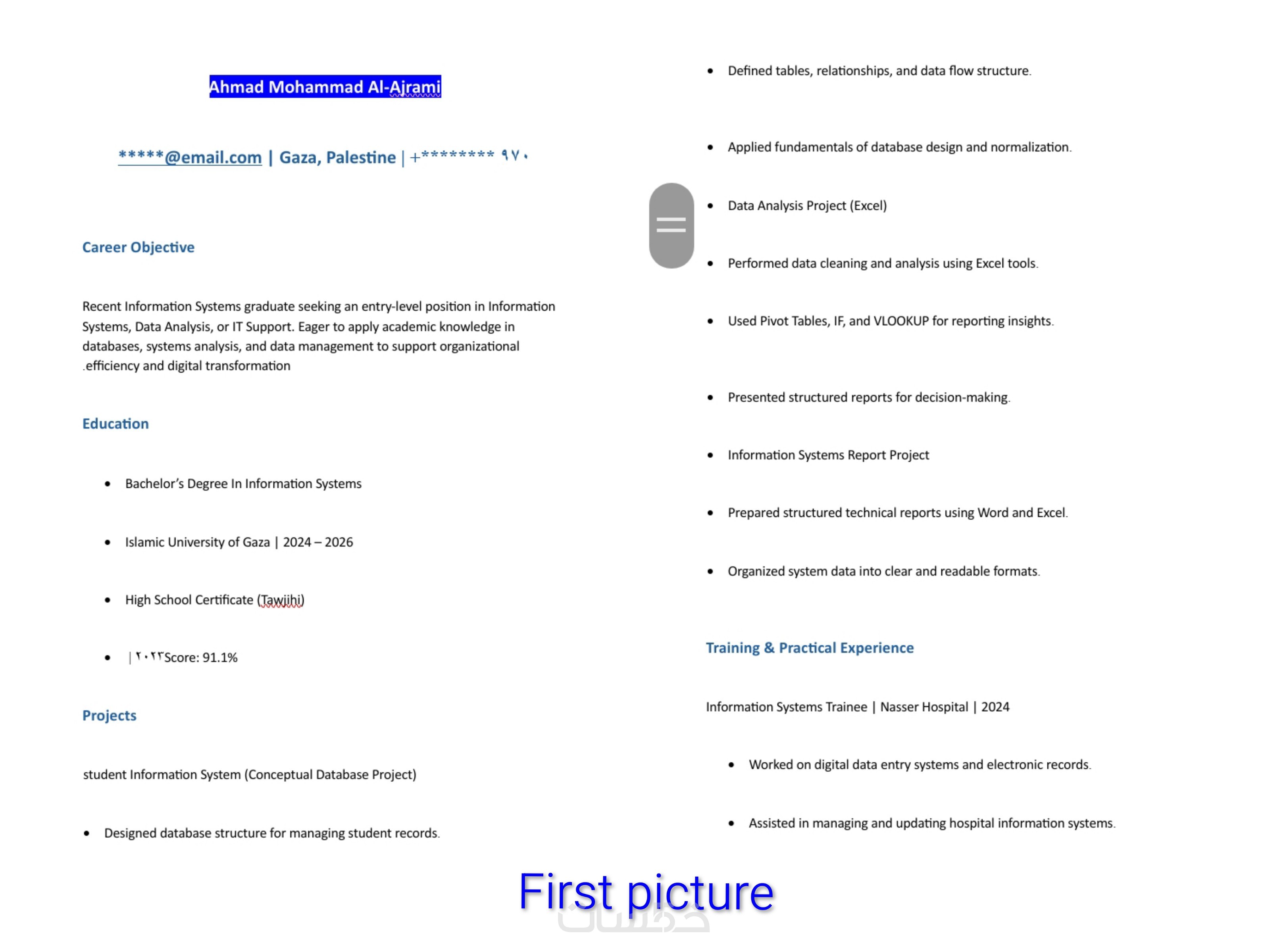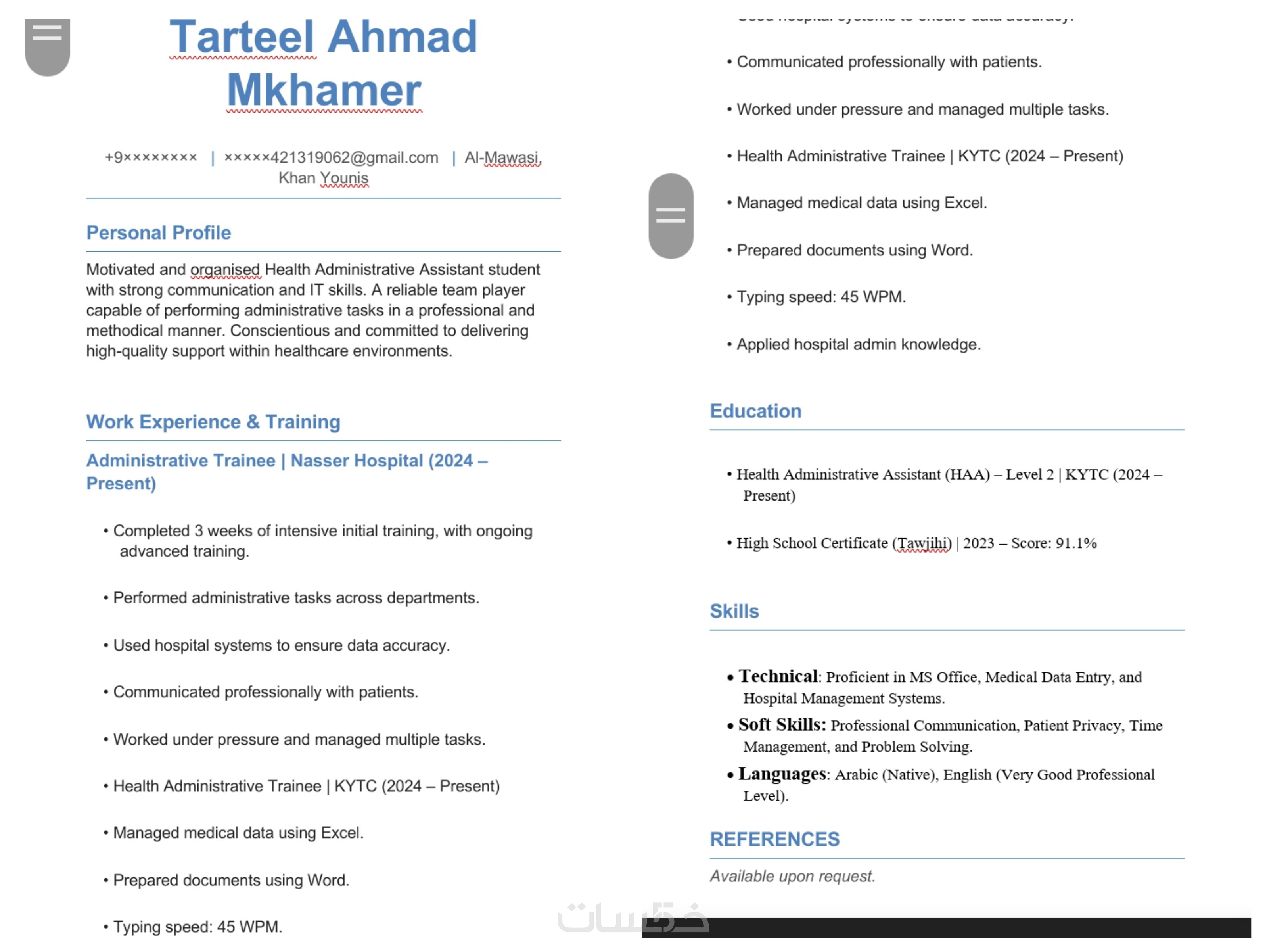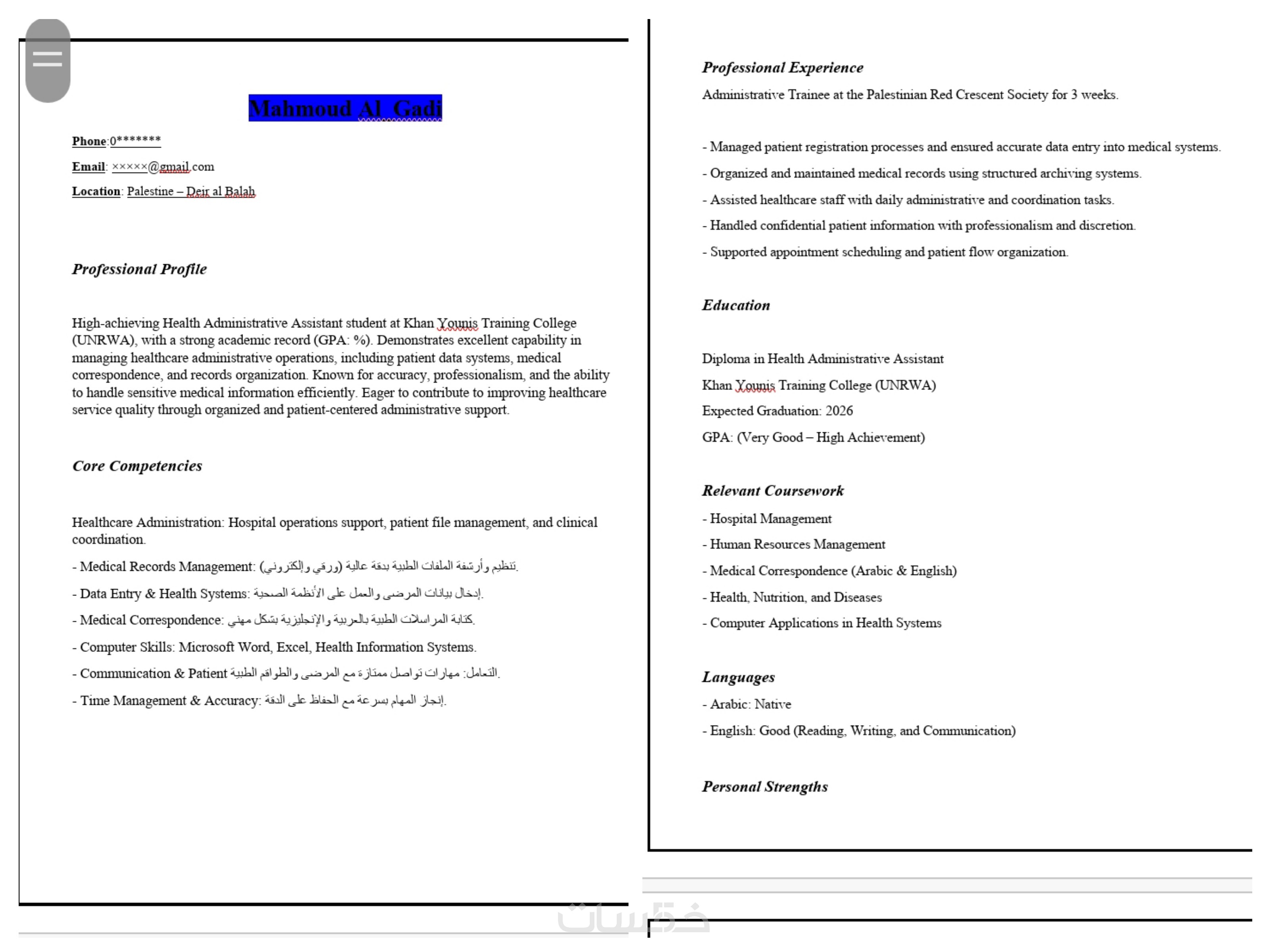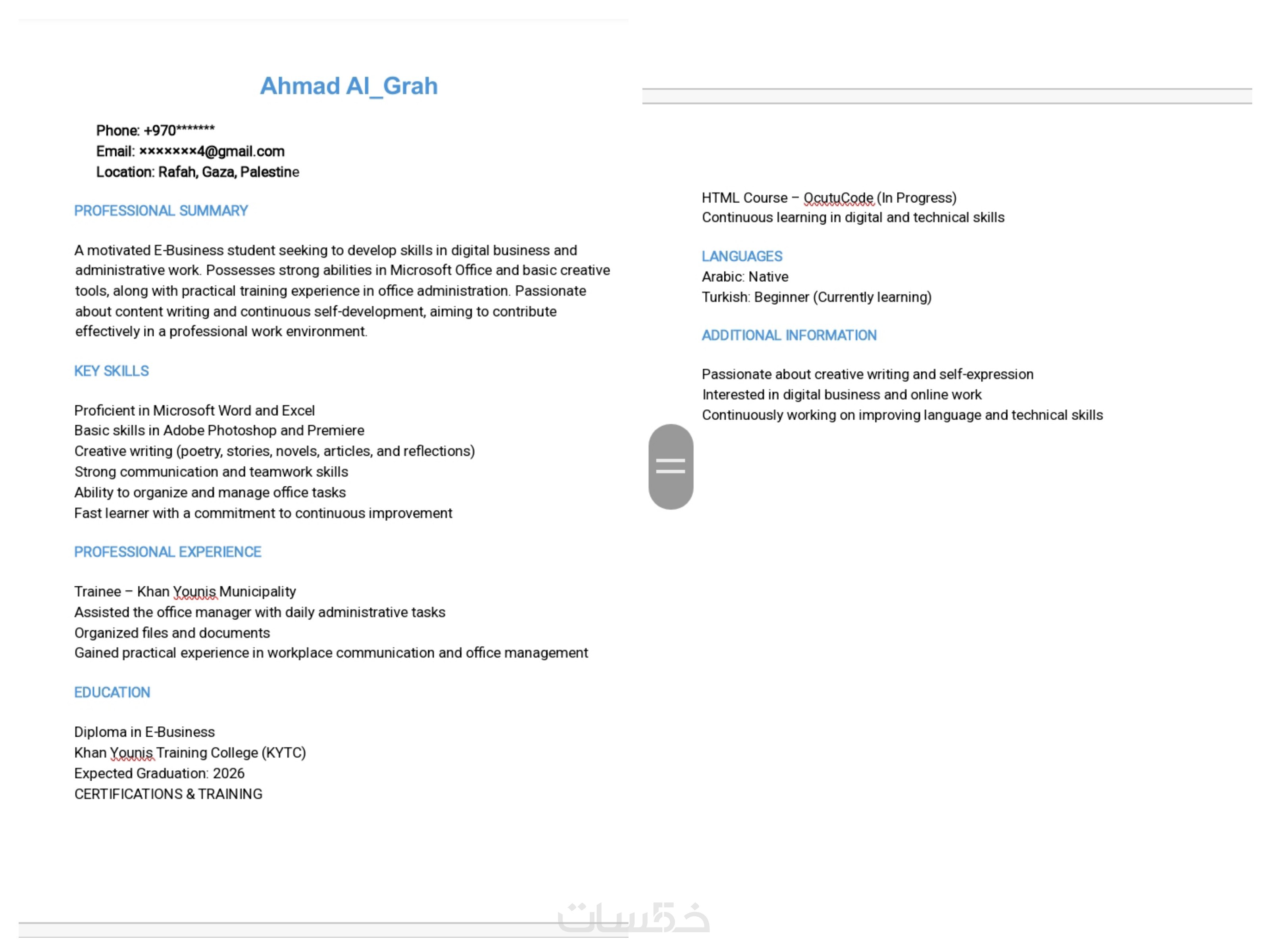 بصفتي متخصصة في الإدارة المكتبية والتعامل مع البيانات، أقدم لك خدمة تصميم وتنسيق السيرة الذاتية (CV) باللغتين العربية والإنجليزية، بأسلوب يجمع بين الاحترافية والجمال البصري، مع التركيز على تنظيم المحتوى بطريقة تبرز نقاط قوتك.