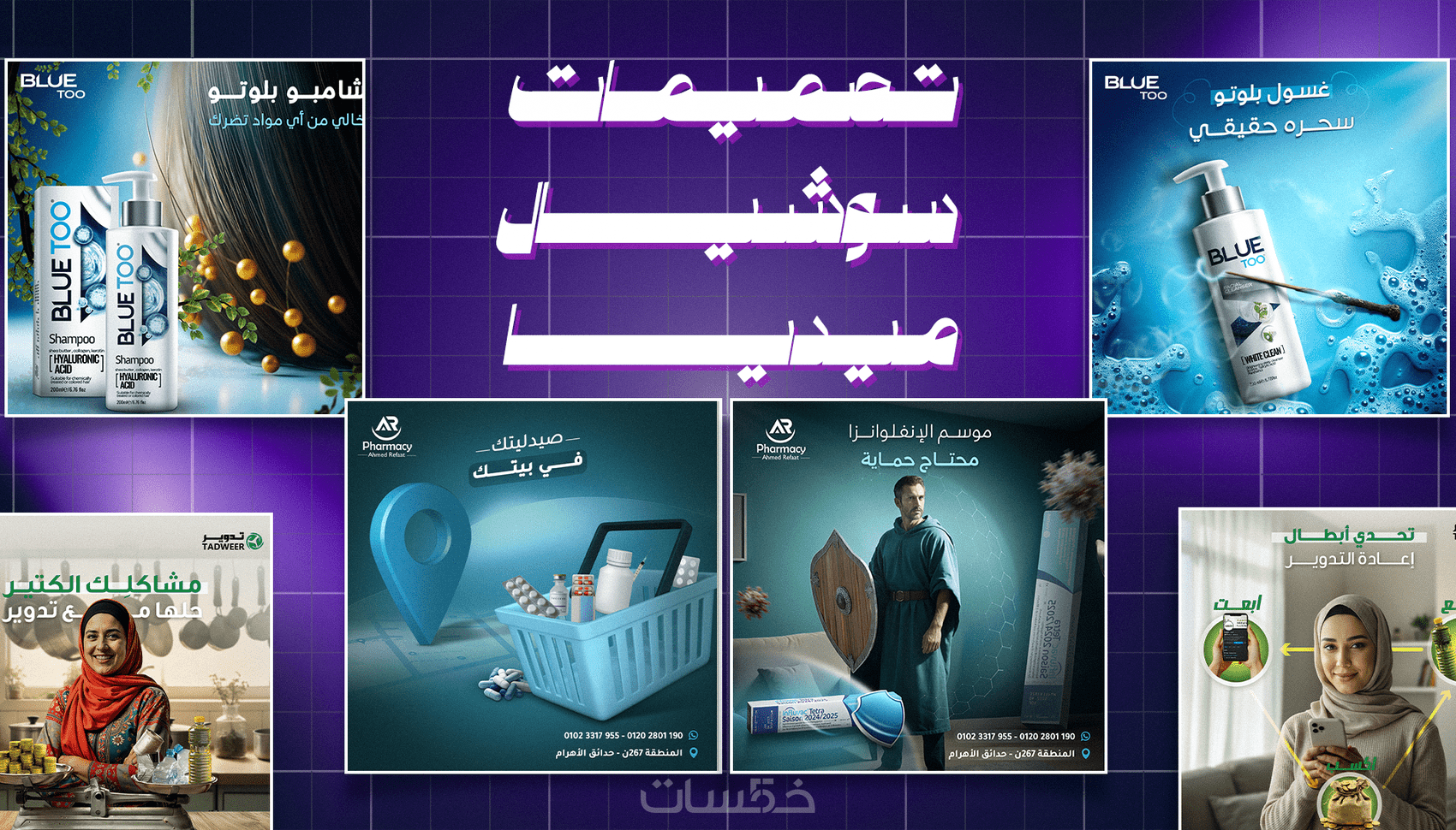 المقاسات الصحيحة والمتوافقة مع جميع المنصات (فيسبوك، يوتيوب، تويتر...).