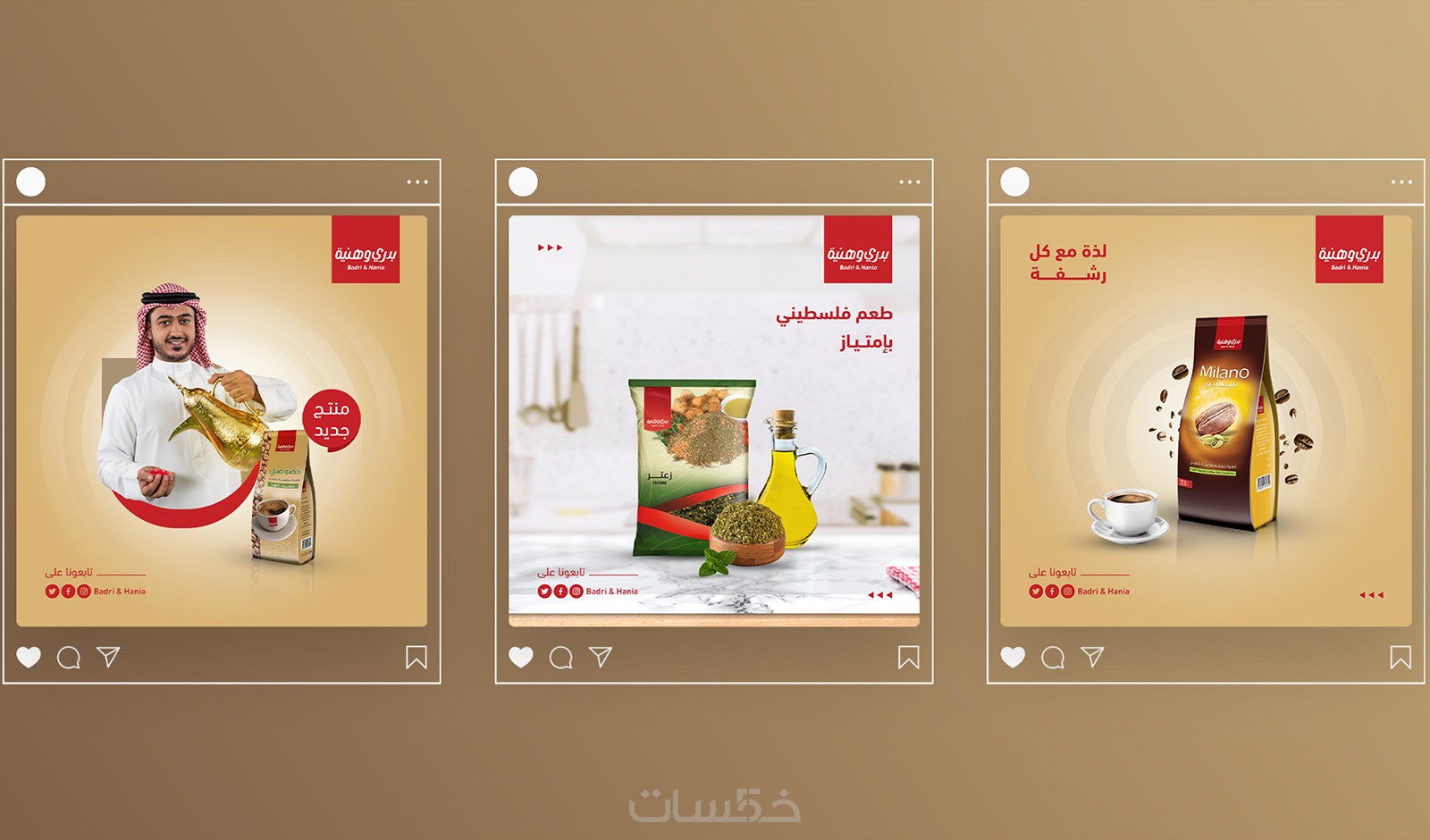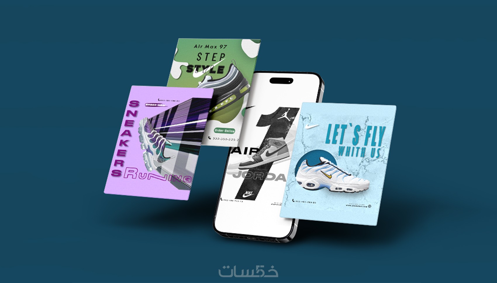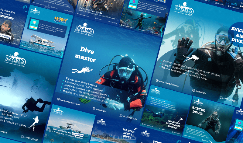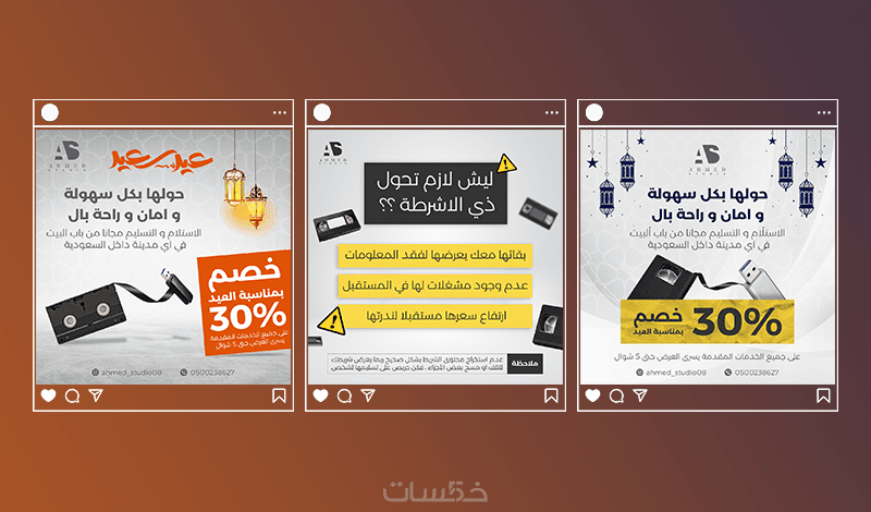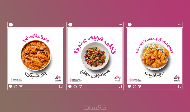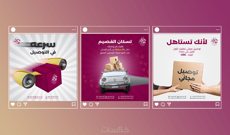 - يبدأ المصمم تصميم المنشور باختيار الصور المناسبة للتصميم وللعلامة التجارية، ثم وضعها في قالب مخصص ويكتب عليها العبارات المطلوبة.